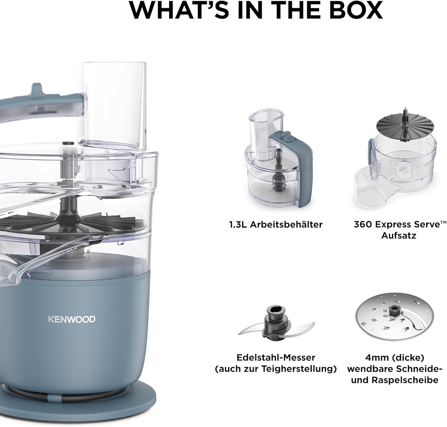 Kenwood MultiPro Go FDP22.130GY Компактен кухненски робот Височина само 30 см за рязане, настъргване, пюриране и месене на тесто, експресно сервиране, работен контейнер 1.3 л, 650 W, син