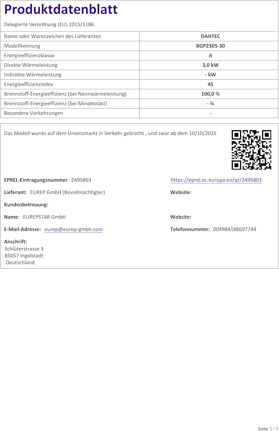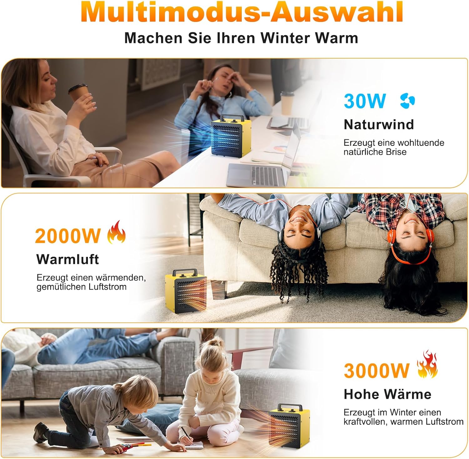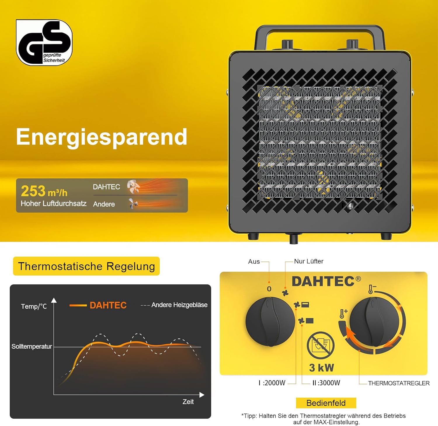 Този преносим нагревател има максимална мощност от 3000 вата. При пълна мощност той консумира 3 kWh. При местна цена на електроенергията от 0,35 евро/kWh, цената на час е приблизително 1,05 евро.