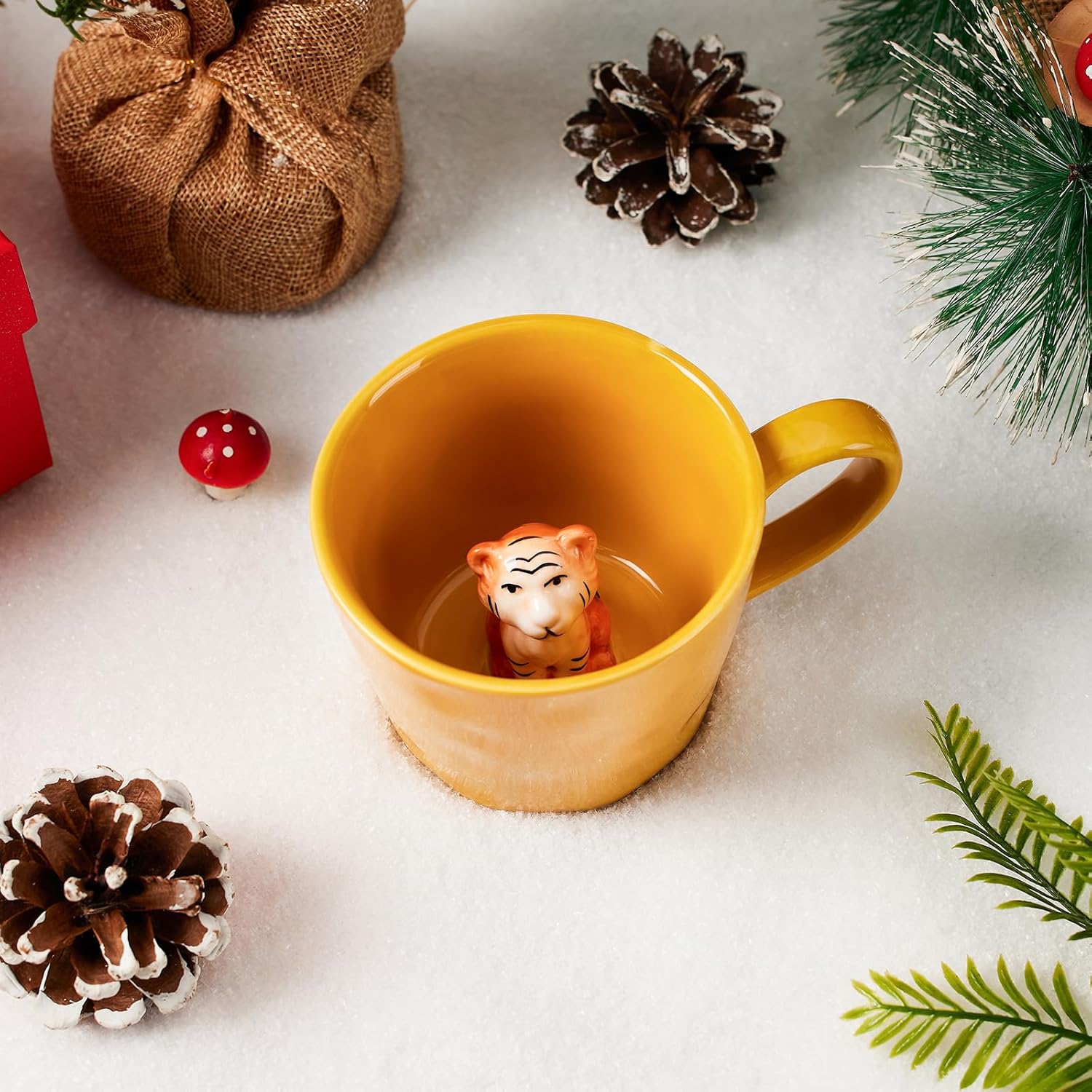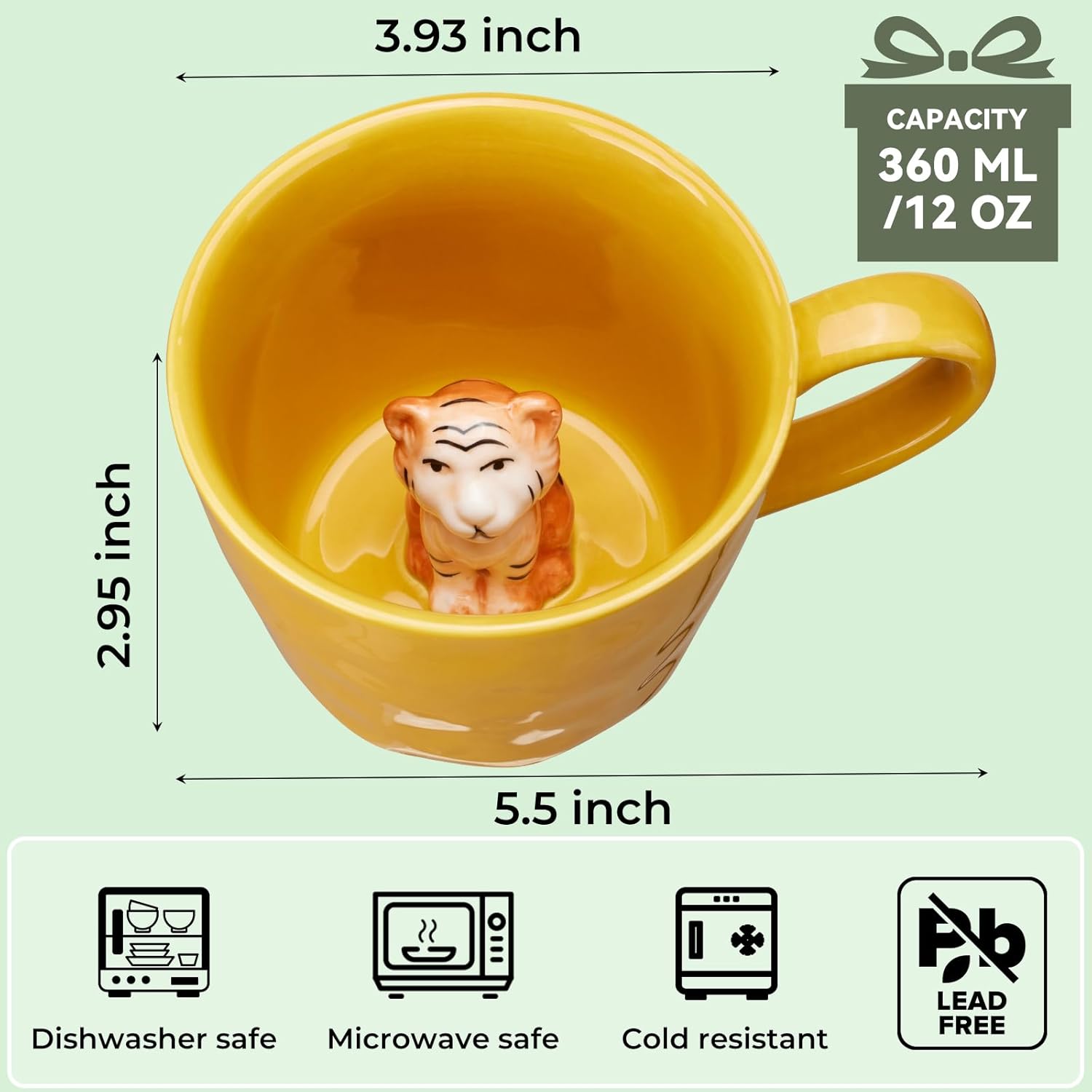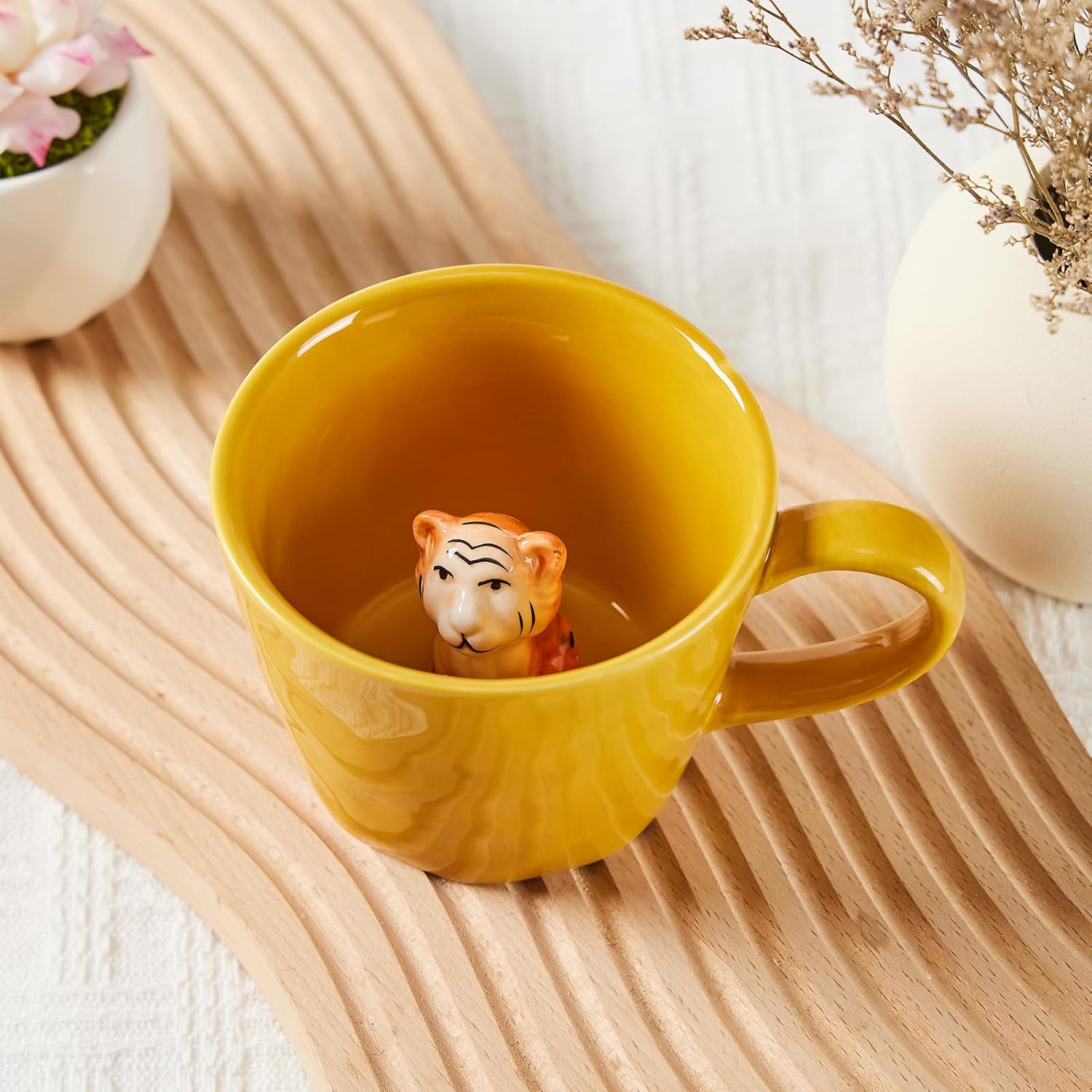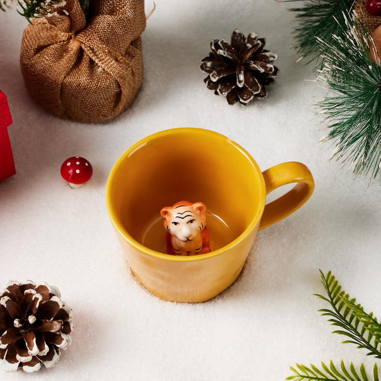 Керамична чаша с 3D животно вътре, 360 мл, ръчно изработена чаша с анимационна фигурка, сладка чаша за кафе с интересен дизайн, подарък за рожден ден за любителите на кафе и млечен чай (Тигър)