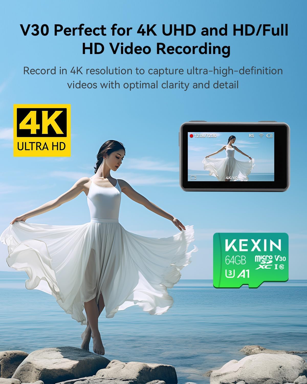 KEXIN 64GB Micro SD карта с UHS-I (U3), клас на скорост 10, клас на скорост на видео 30 (V30). Поддържа плавно непрекъснато заснемане и видеозапис във Full HD (4K). За приложенията, производителността на A1 (приложение 1) не само работи по-бързо с microSDXC картата, но и спестява място за съхранение на устройството. Запазете спомените си ясни с тази Kexin 64GB micro SD карта памет.