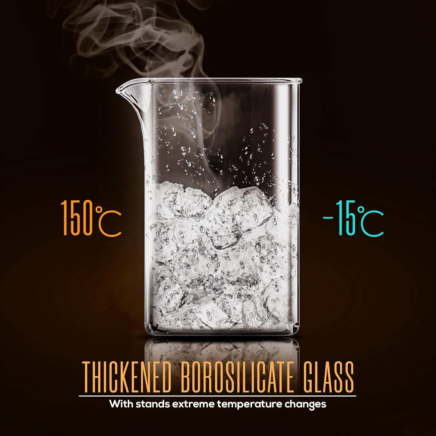 • Здрава, топлоустойчива чаша от боросиликатно стъкло е поставена в стилни изолирани пластмасови рамки, които улесняват наливането на кафе и предотвратяват клатушкането.