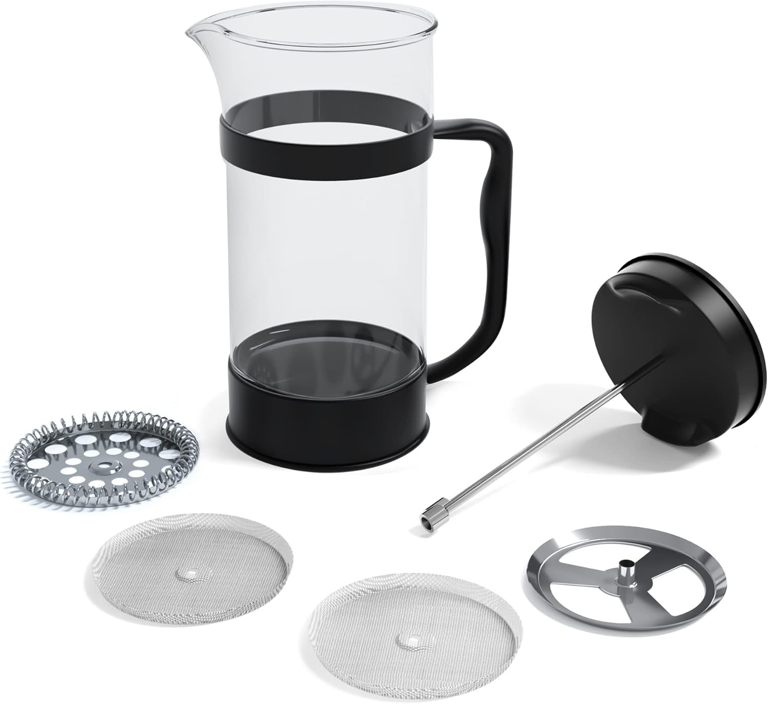 KICHLY Френч преса за кафе, еспресо и чай с тройни филтри, термоустойчиво боросиликатно стъкло със стоманено бутало (600 мл, черна)