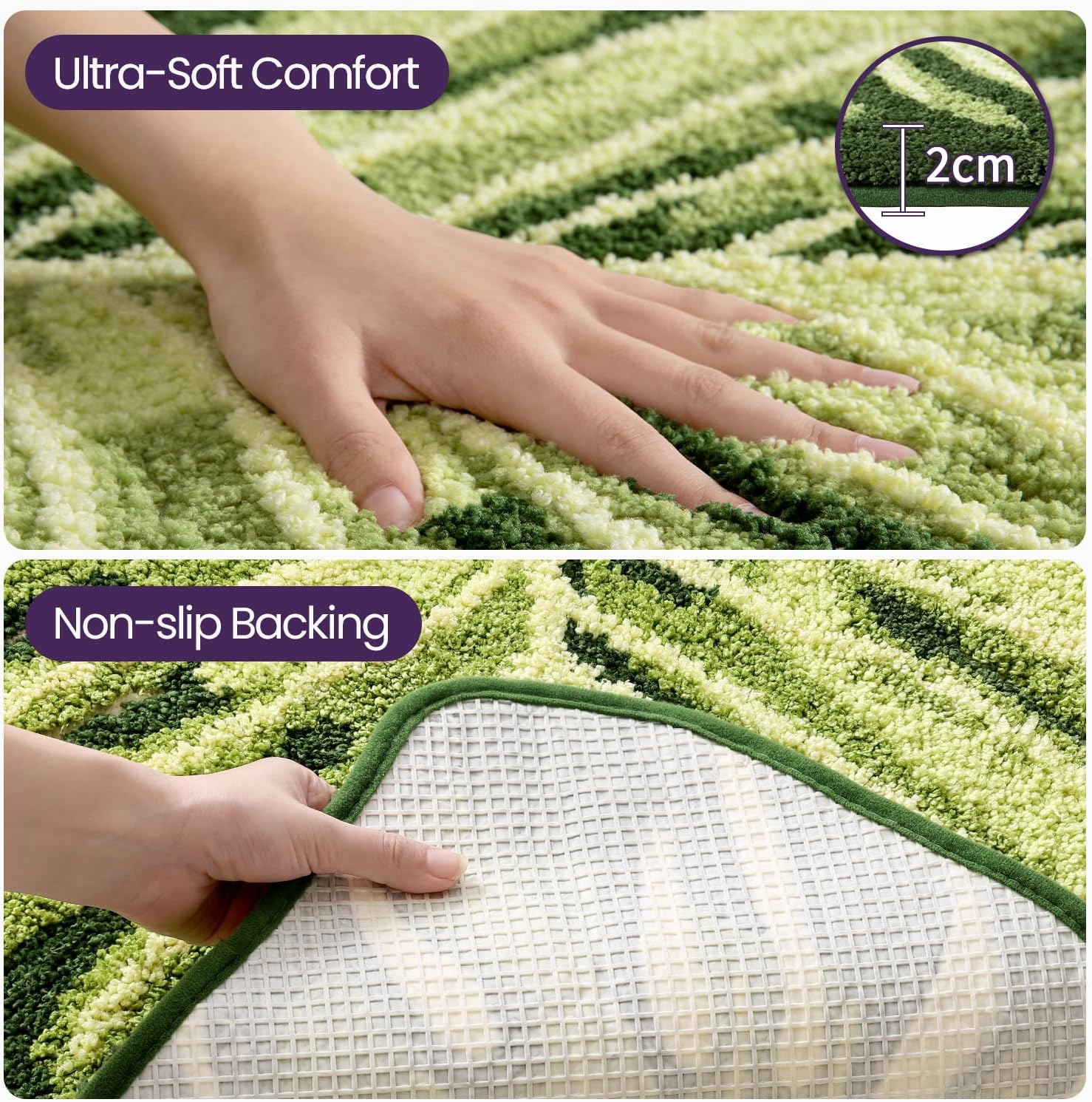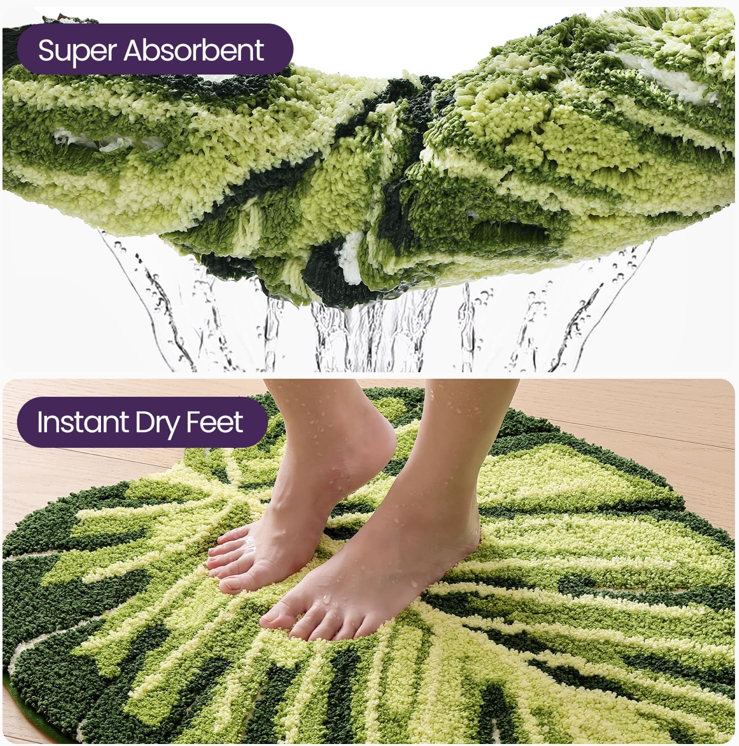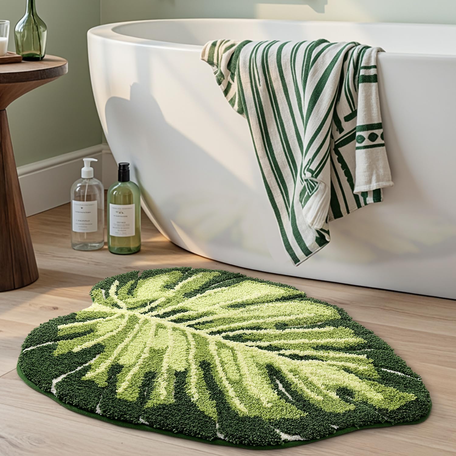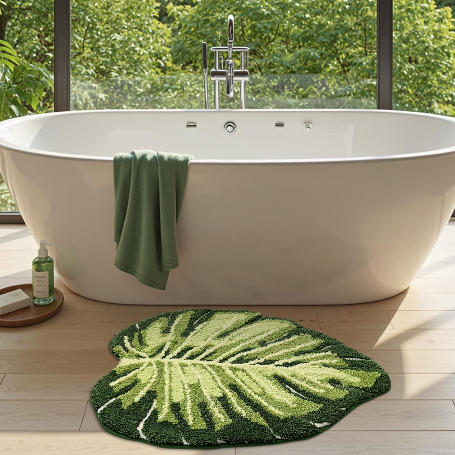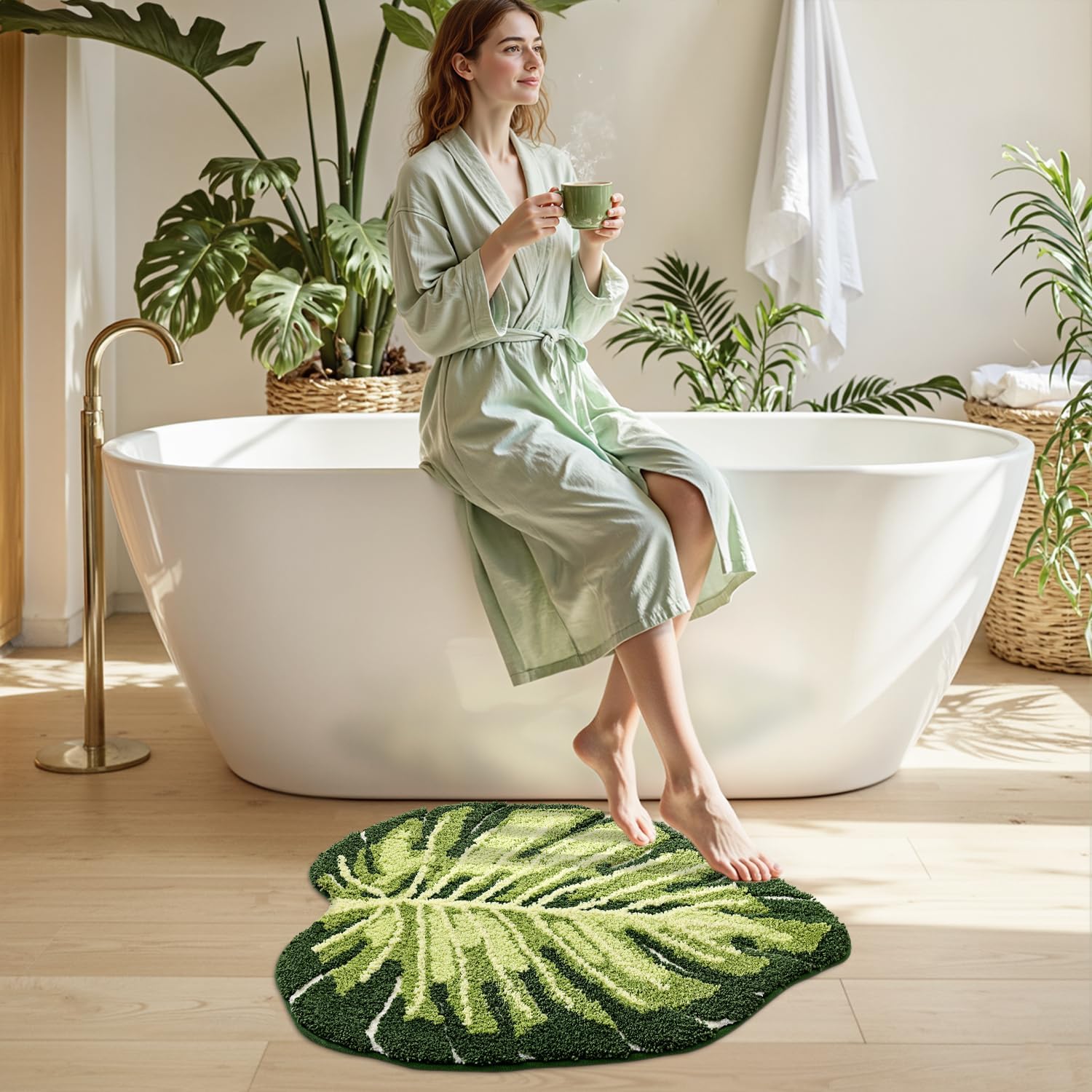Килим за баня DEXI 60 x 80 см, Неплъзгаща се абсорбираща постелка за баня с мотив на растението монстера, Постелка за баня във формата на листо, която може да се пере, за душ, спалня, детска стая, зелена
