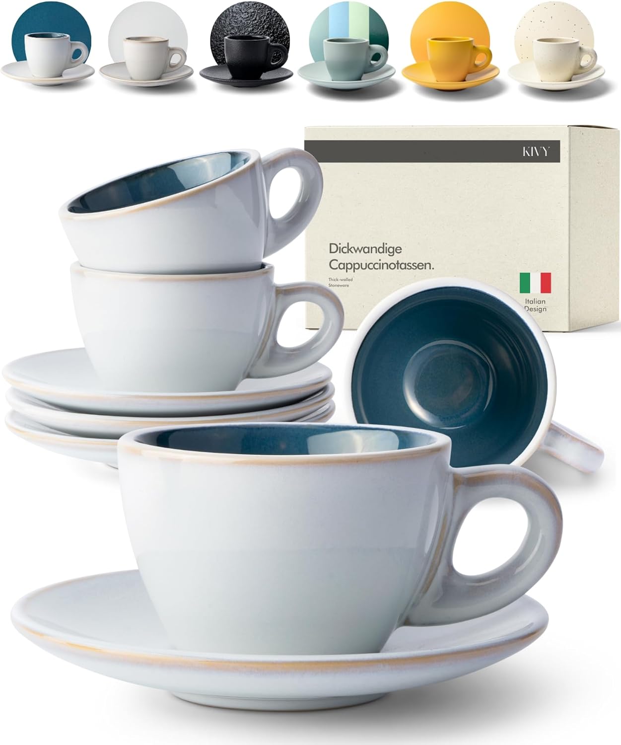 KIVY Комплект чаши за капучино Barista 4 x 240 мл - Дебелостенни, каменни - Чаша с чинийка - Ръчно изработена - Зелена, Синя