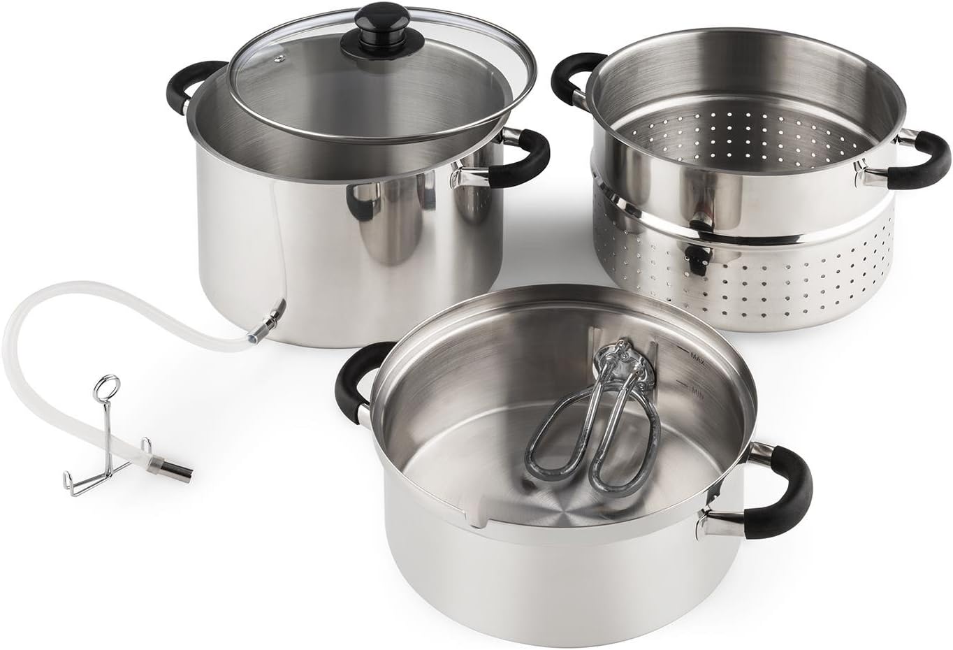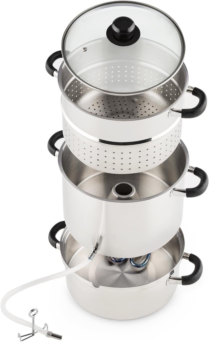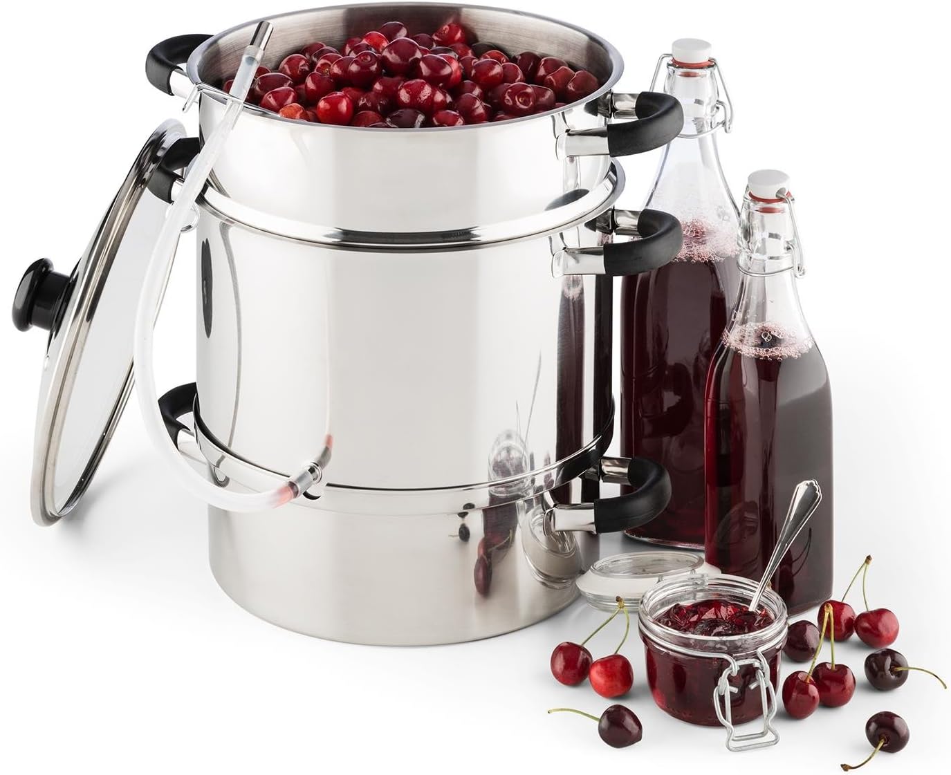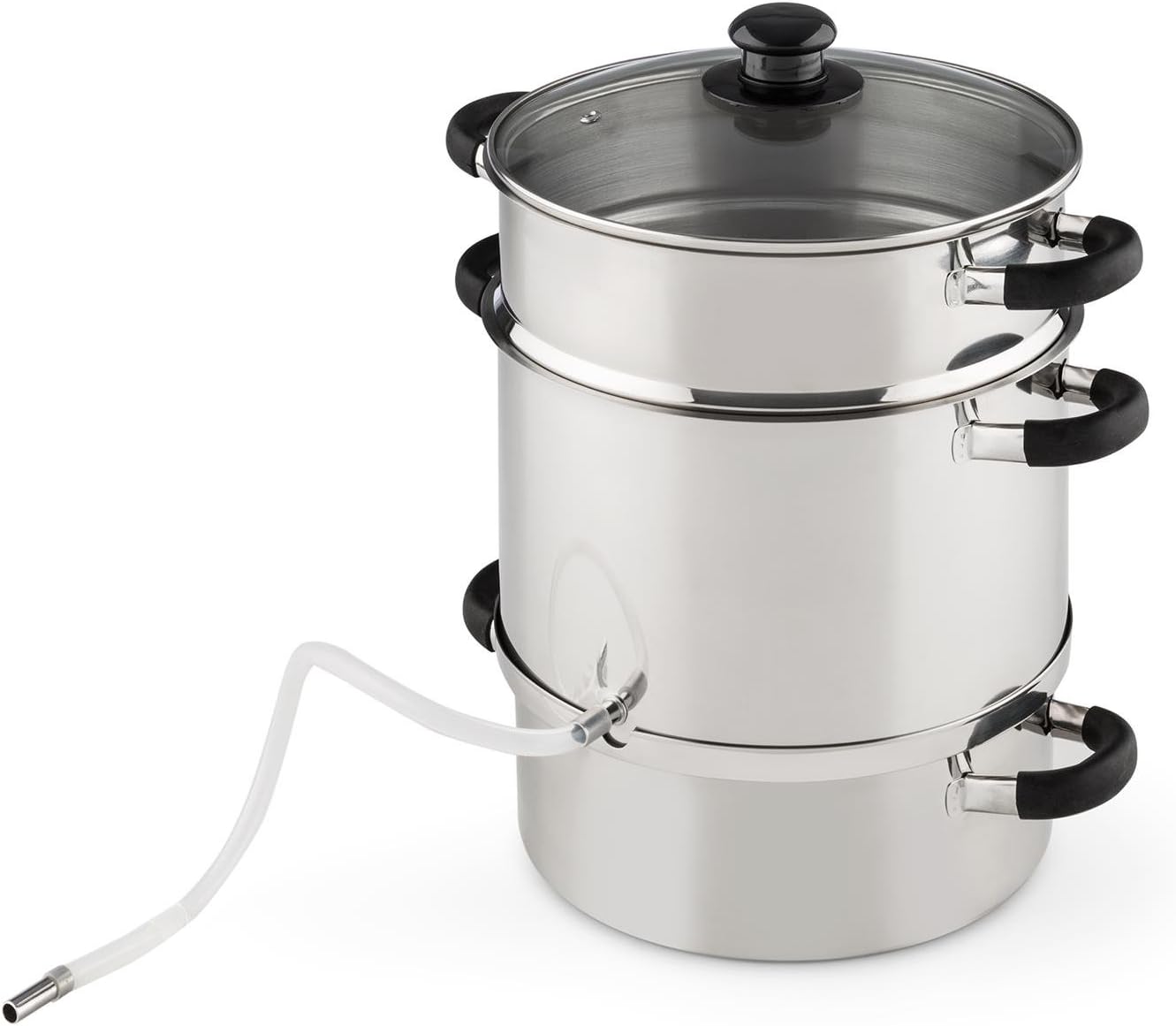 Тристепенна сокоизстисквачка, изработена от неръждаема стомана с обем 8 литра за плодове; включва