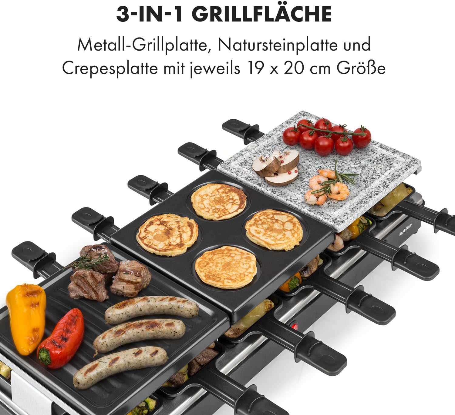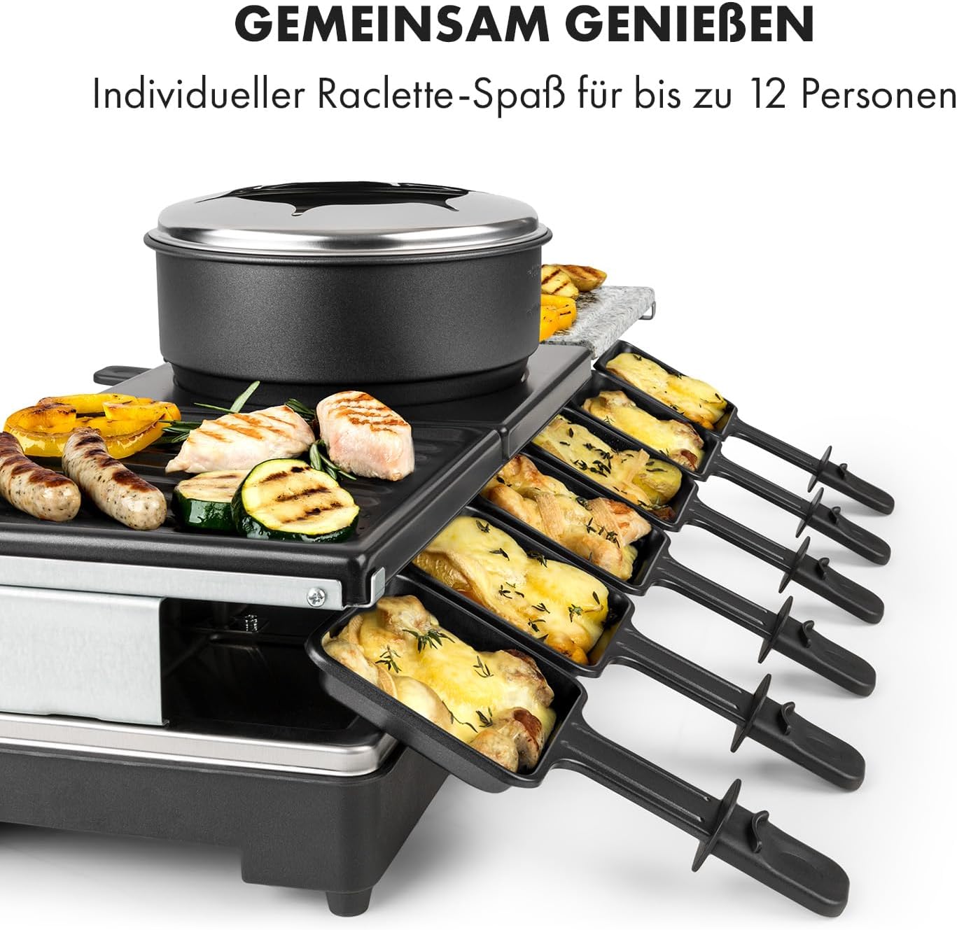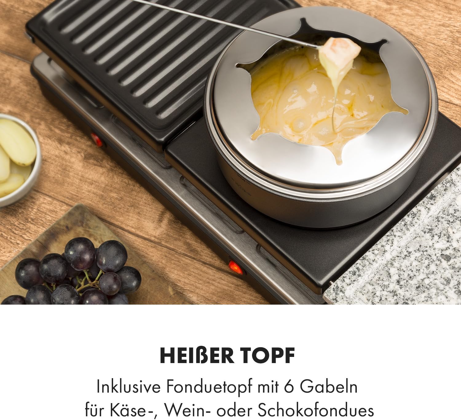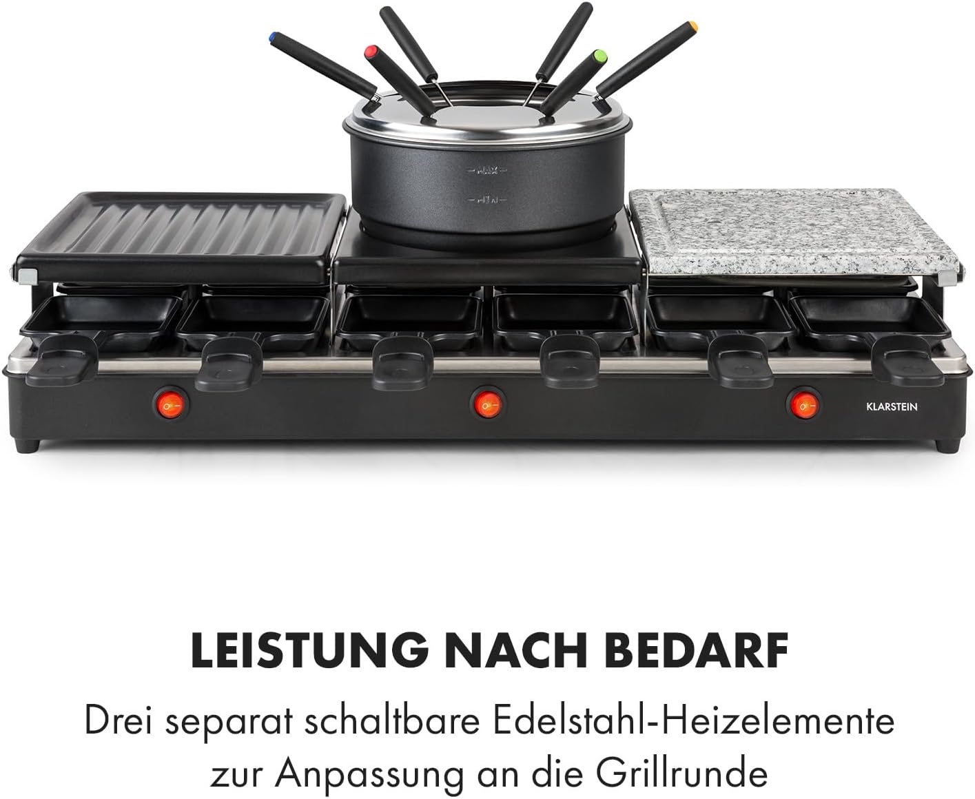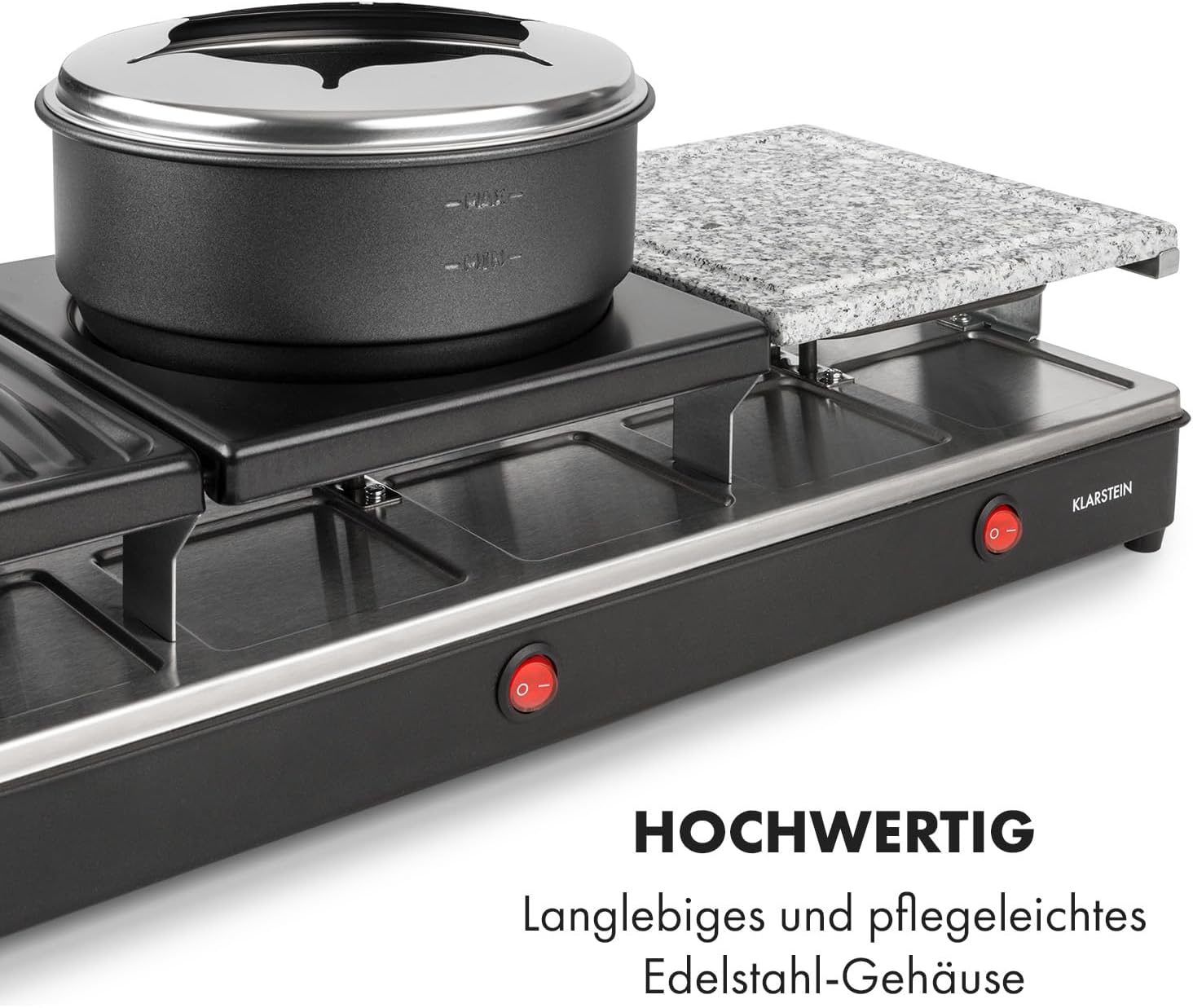 Klarstein Fonduelette XL - 3-в-1 раклет грил и фондю, 1650 вата, 3-в-1 грил: метал / естествен камък / плоча за креп, 3 отделни нагревателни елемента от неръждаема стомана, до 12 души, незалепващо покритие