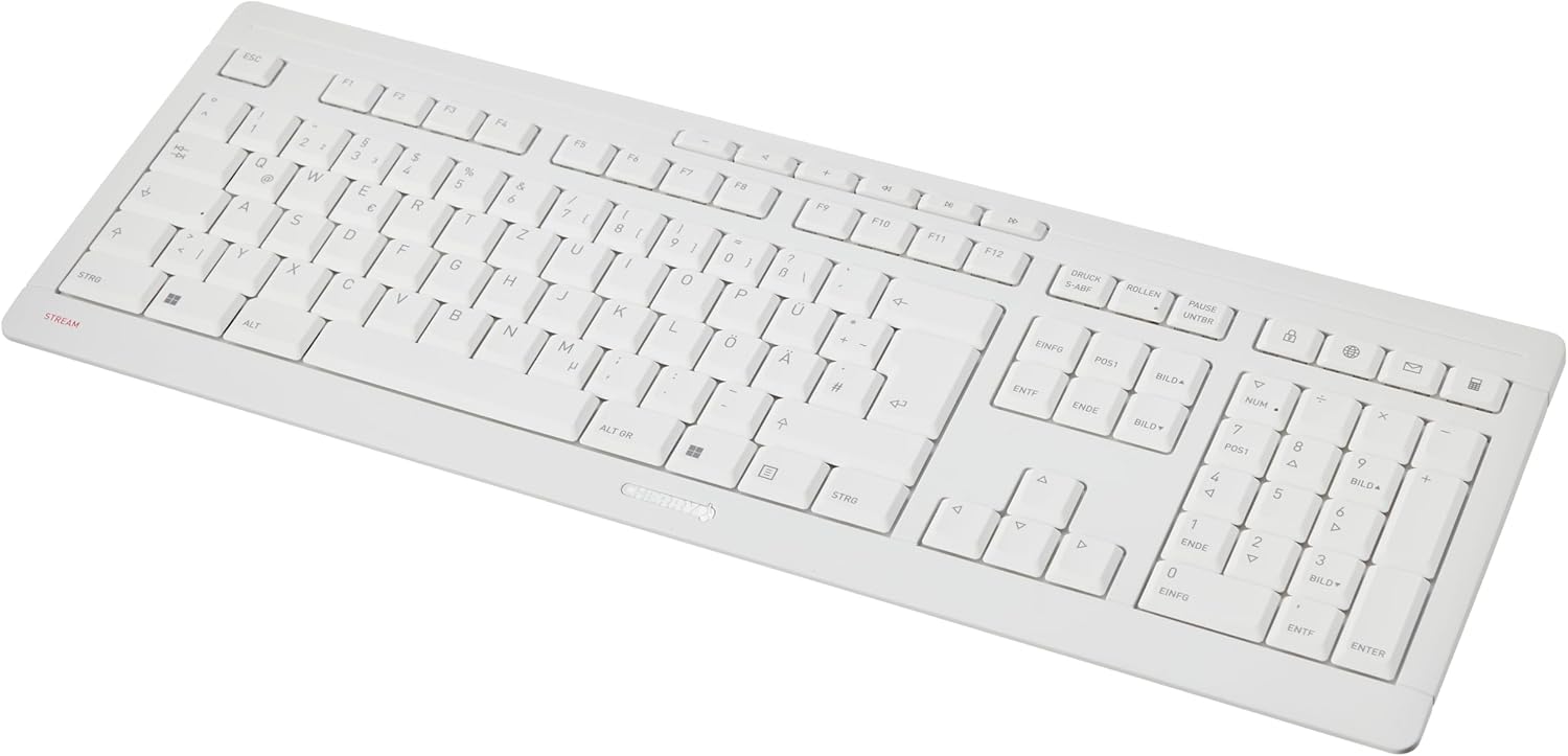 Клавиатура CHERRY Stream, кабелна клавиатура, немска подредба (QWERTZ), тихо натискане на клавишите, уникално усещане при писане, плосък дизайн, бяло/сиво