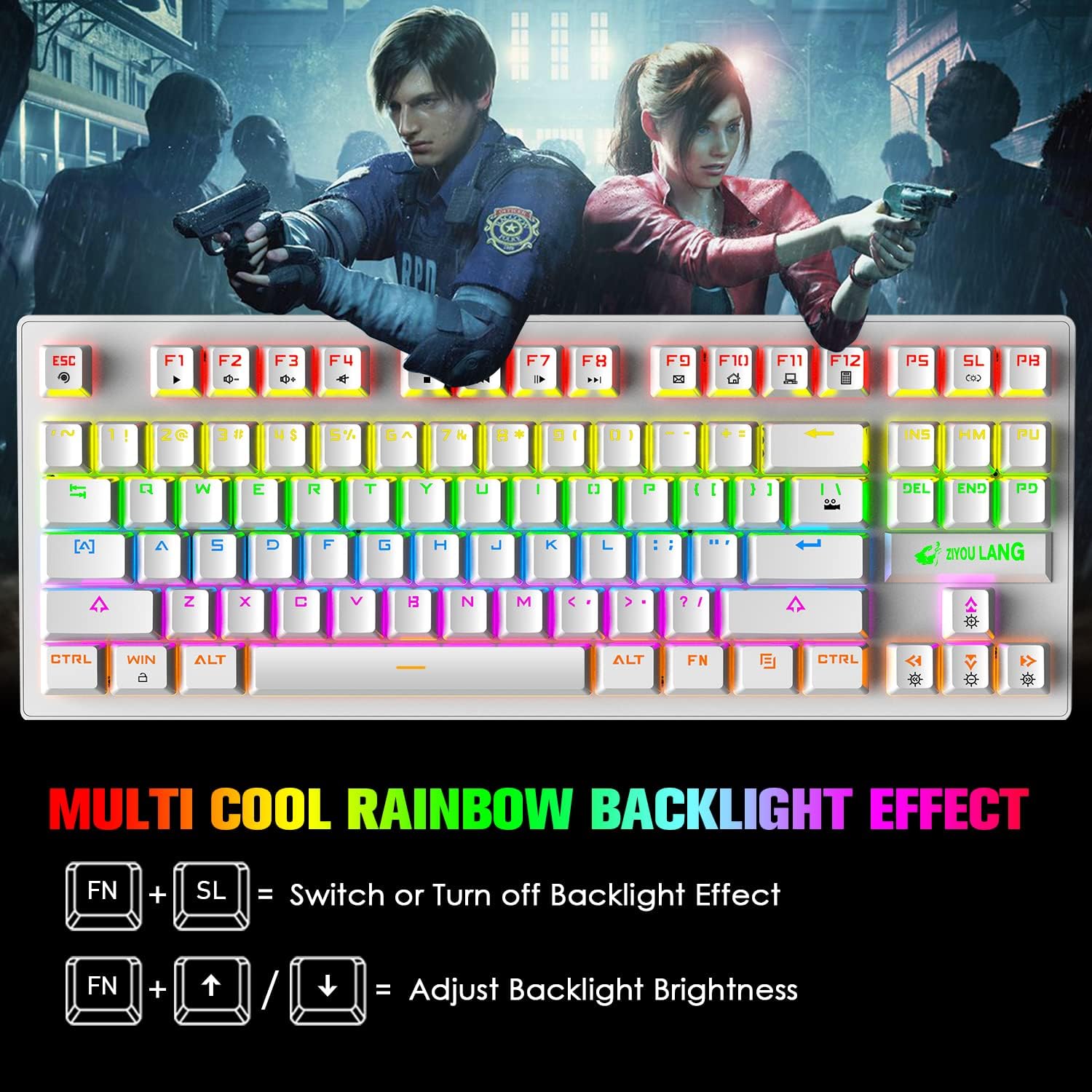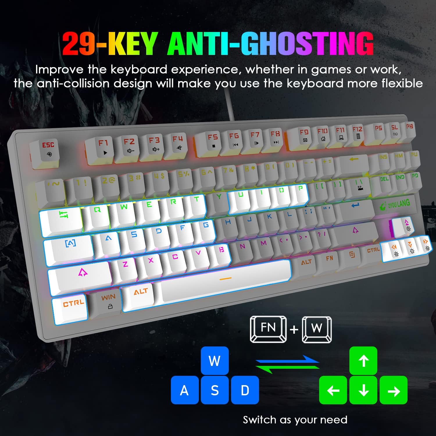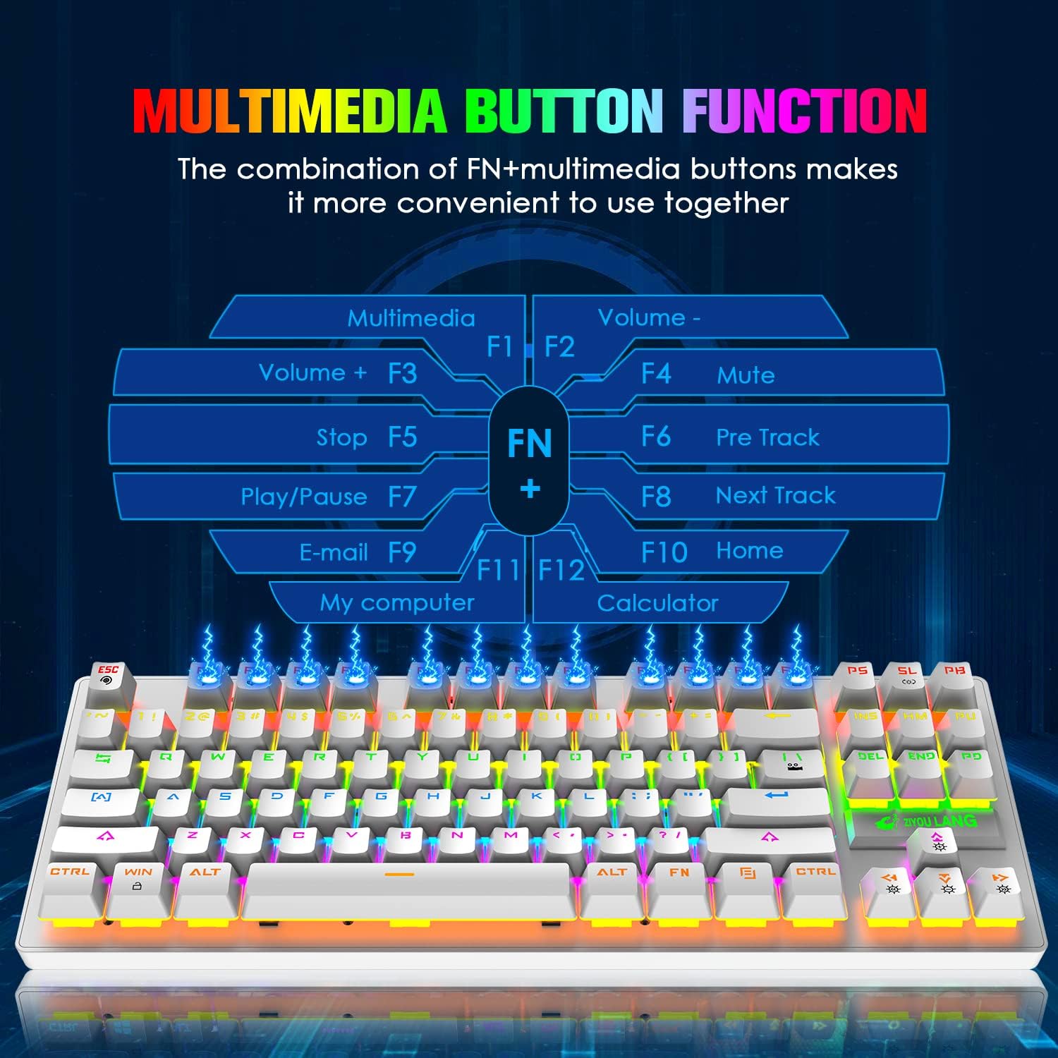 • Компактна клавиатура с 87 клавиша: Всичките 87 механични клавиша на игралната клавиатура са анализирани в конфликт. С 12 мултимедийни бутона, ергономичност, противоплъзгаща защита, защита от пръски вода, регулируема скоба на клавиатурата, регулиране на най-подходящия ъгъл на писане, високоустойчив на корозия високоскоростен USB кабел и конектори, които могат да се използват за надеждна връзка, перфектно съответстващи на атомната ширина.
