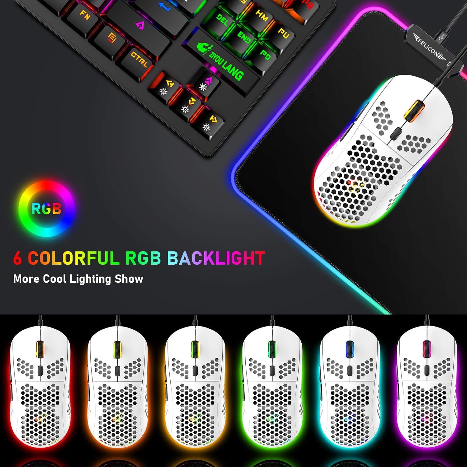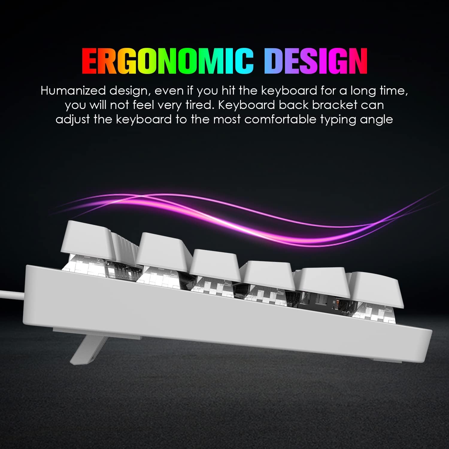 • Компютърна RGB подсветка за игра с клавиатура: 9 различни RGB режима и ефекта на осветление, 3 подсветки, регулируема скорост на дишане. Може да осигури ясна подсветка. Клавиатурата е базирана на ергономичен дизайн, който натоварва китката ви и е висококачествен инструмент за офис работа и развлекателни игри.