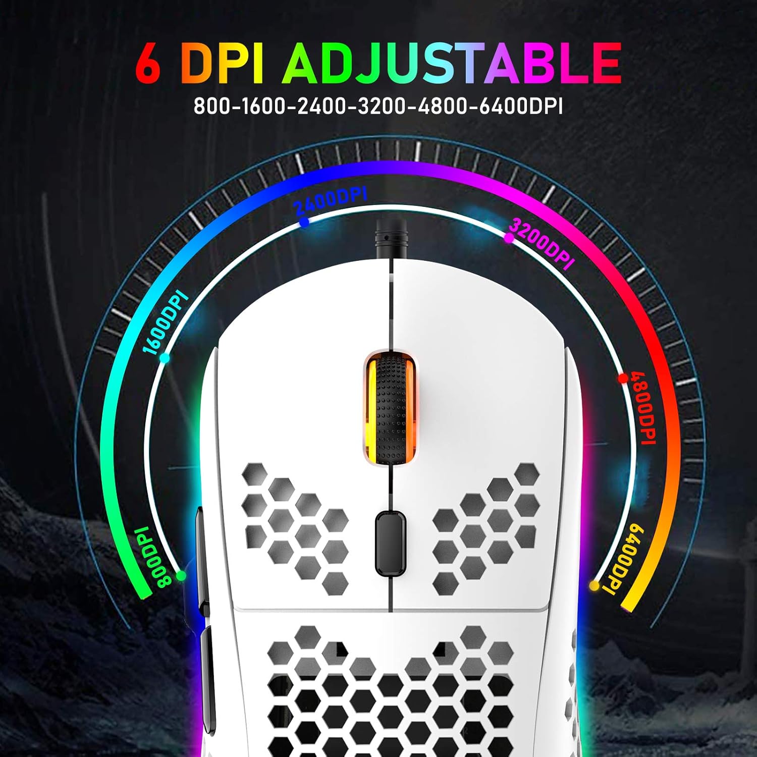 • Регулируема DPI мишка с 6400 DPI: Кабелната професионална геймърска мишка използва твърд персонализиран чип, до 6400 dpi (6/редактируеми), може да издържи на ускорение от 20 g, тест с 50 000 000 кликвания, добро качество. Високопроизводителната конфигурация на мишката може да отговори на вашите изисквания за бързо сърфиране в мрежата и игри.
