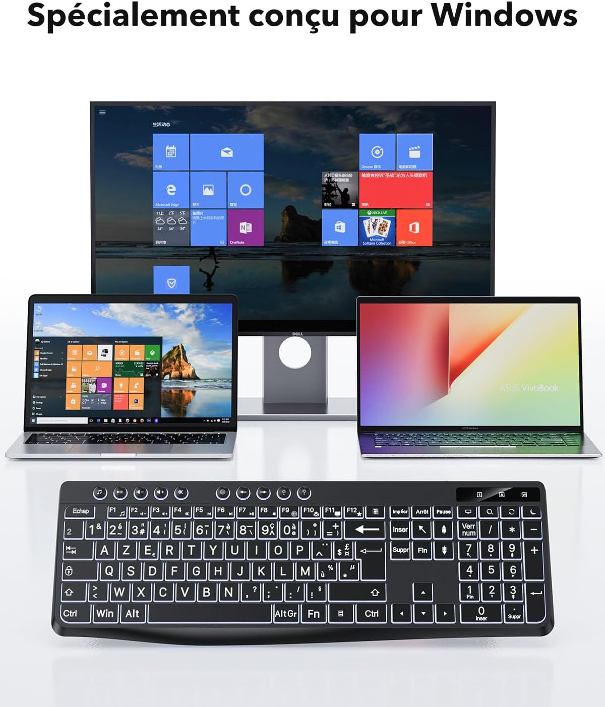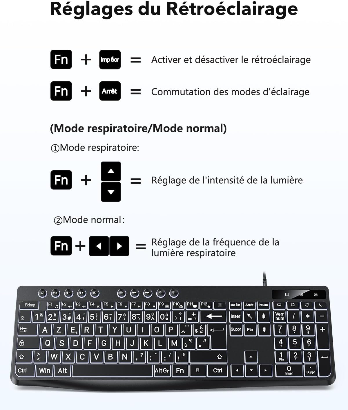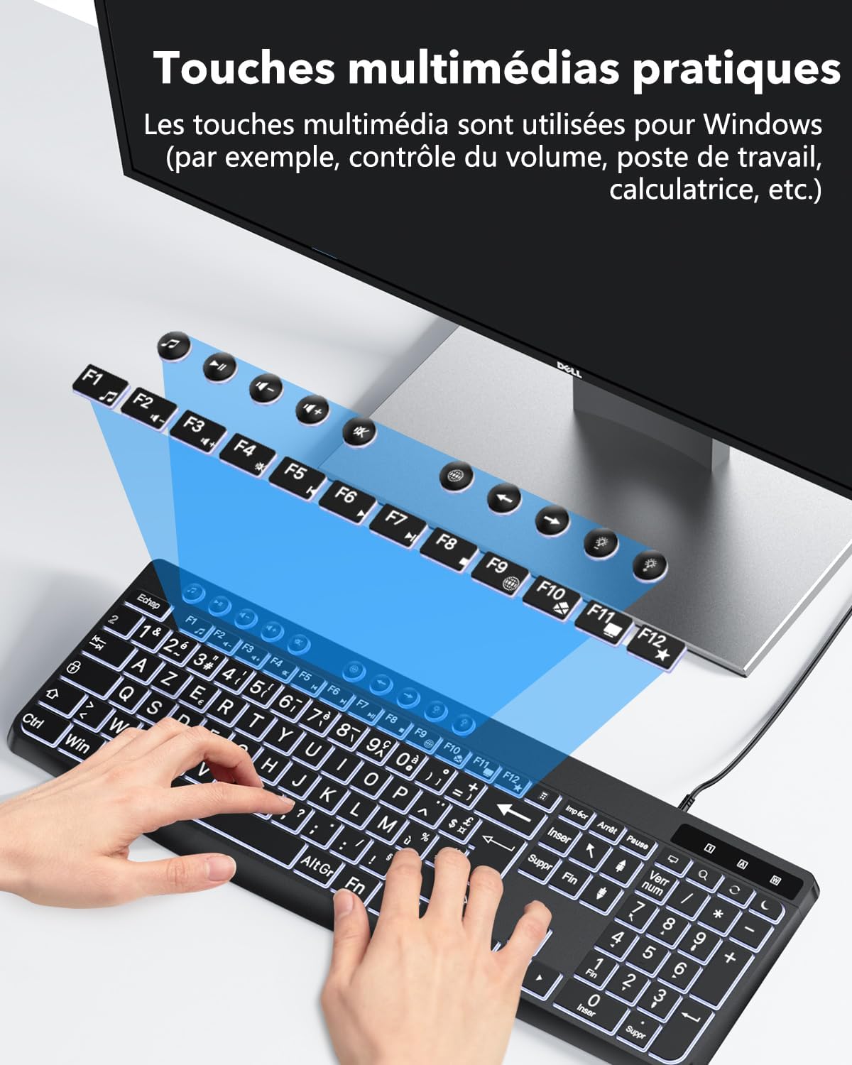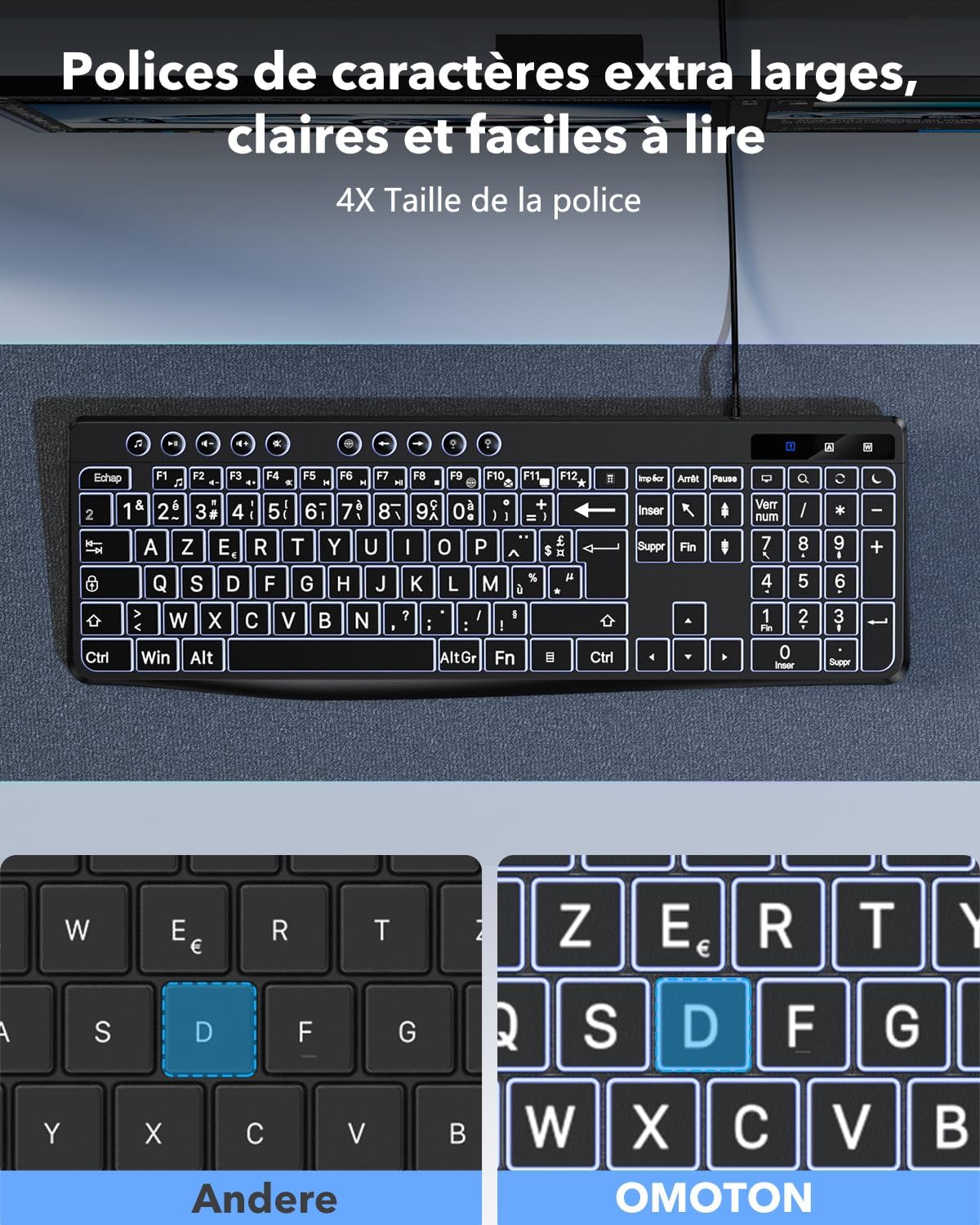 Клавиатура OMOTON с подсветка, кабелна клавиатура, AZERTY бяла подсветка с голяма точка на натиск, 2 в 1 USB климатик за възрастни хора, деца, хора с увредено зрение за Windows с мултимедия