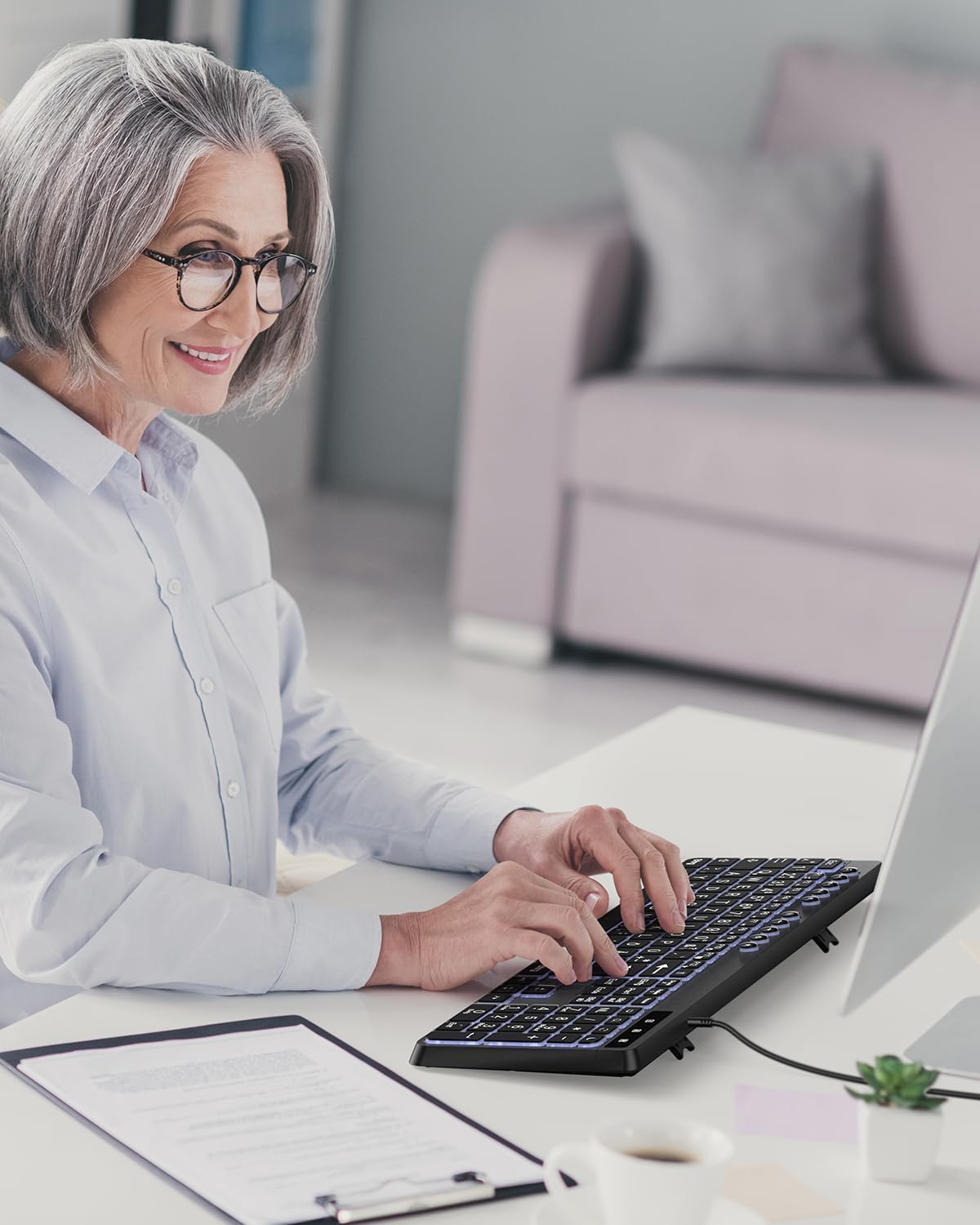 • 4. ЕРГОНОМИЧЕН ДИЗАЙН: Осветената клавиатура е с лесен за употреба, ергономичен дизайн, който осигурява комфорт на възрастни хора и хора с увредено зрение при продължително писане. Идеална е за използване като компютърна клавиатура и помага за намаляване на напрежението върху ръцете и китките.
