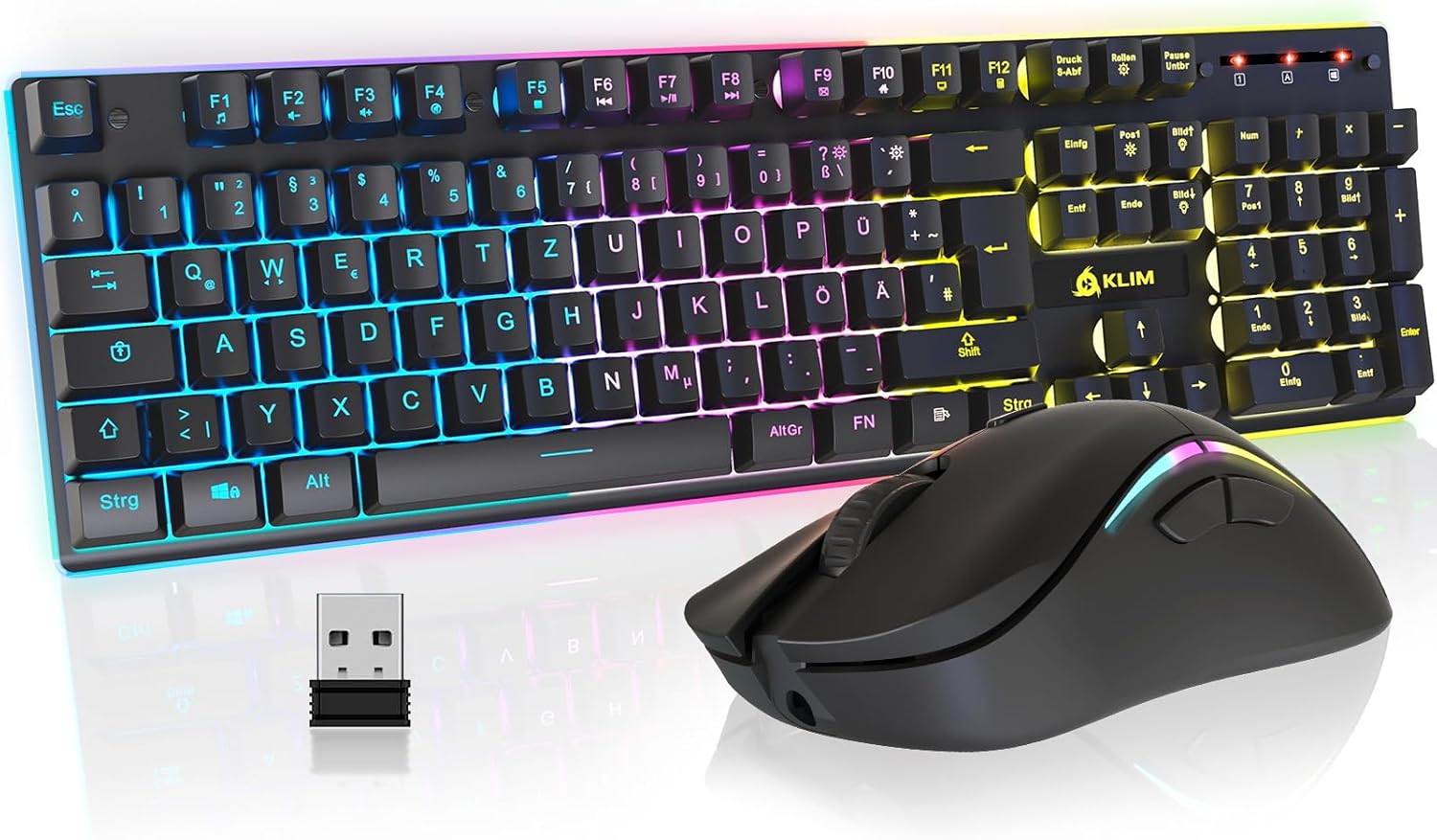 KLIM Thunder Безжична геймърска клавиатура и мишка - Безжична клавиатура с подсветка и издръжлива вградена батерия + 4800 DPI RGB безжична геймърска мишка за компютър