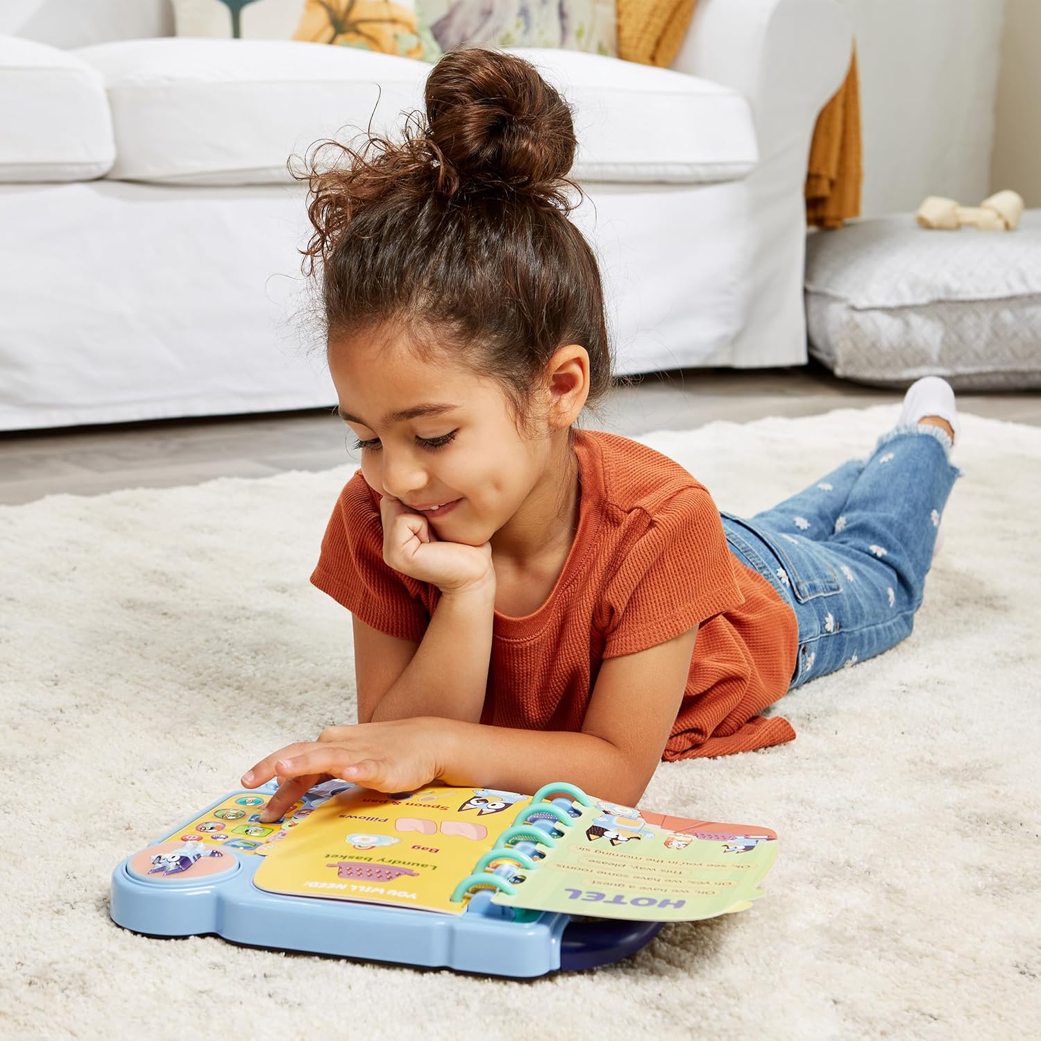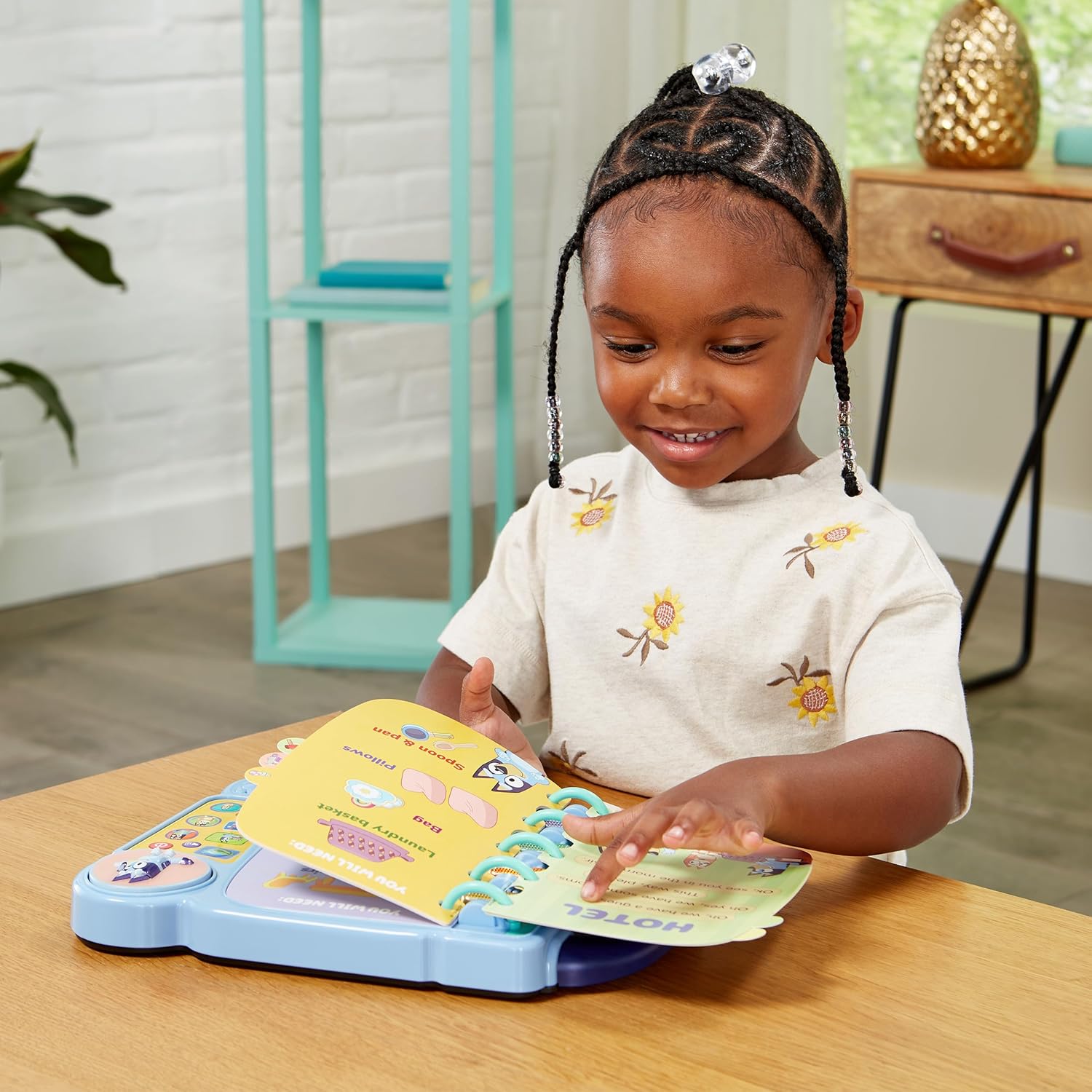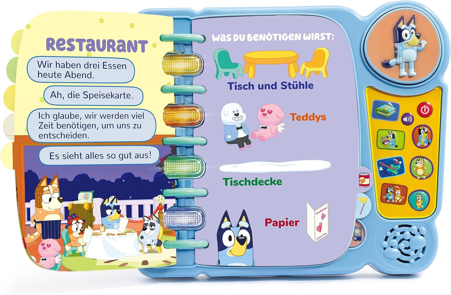 1. Извадете образователната книга-игри Bluey от опаковката. 2. Натиснете големия бутон Bluey, за да чуете типичните фрази на Bluey. 3. Използвайте 4-те бутона с герои (Bluey, Bingo, Chilli и Bandit) и 4-те светлинни бутона за интерактивни игри. 4. Изберете от 4 режима на игра: Story, Together, Music и Follow. 5. Използвайте дръжката за носене за забавление в движение.