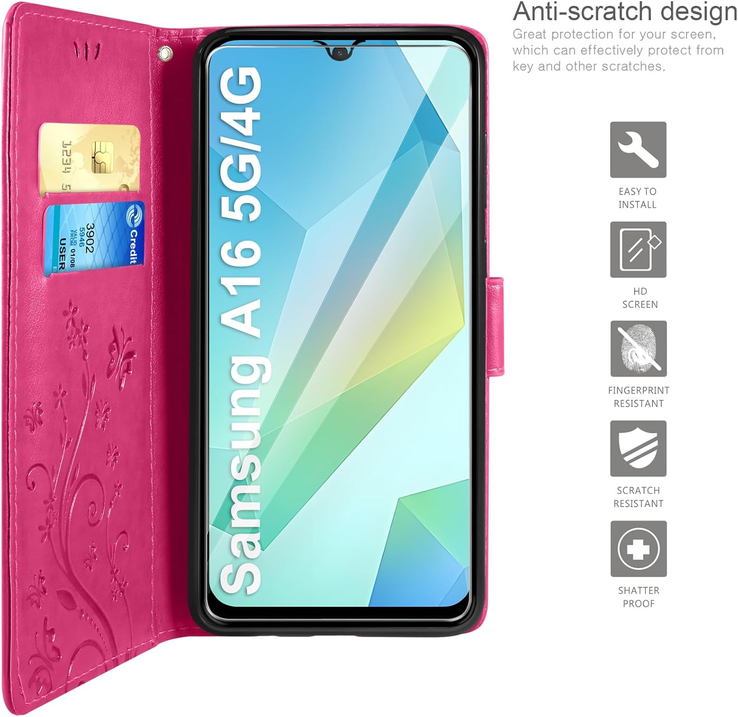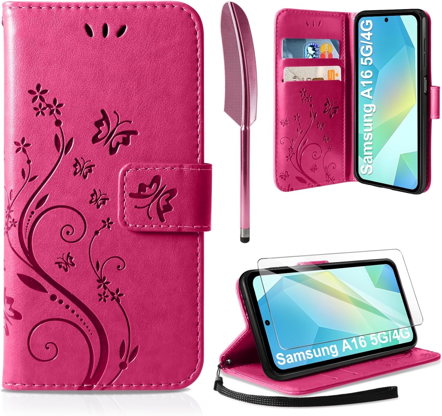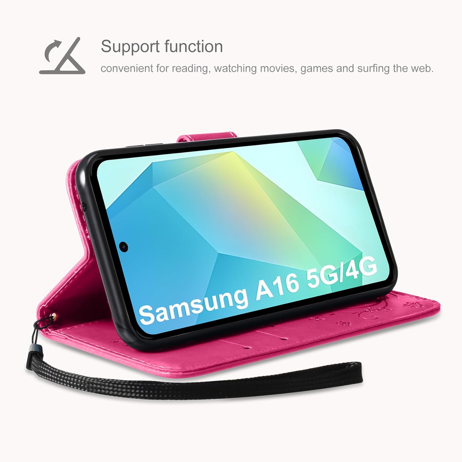 • Флип калъфът е съвместим със Samsung Galaxy A16 5G/4G и предлага отлична 360-градусова защита. Многофункционален флип калъф от PU кожа с цветя на пеперуда и мека вътрешна подплата от TPU, защитно фолио за защита на екрана от прах и драскотини.