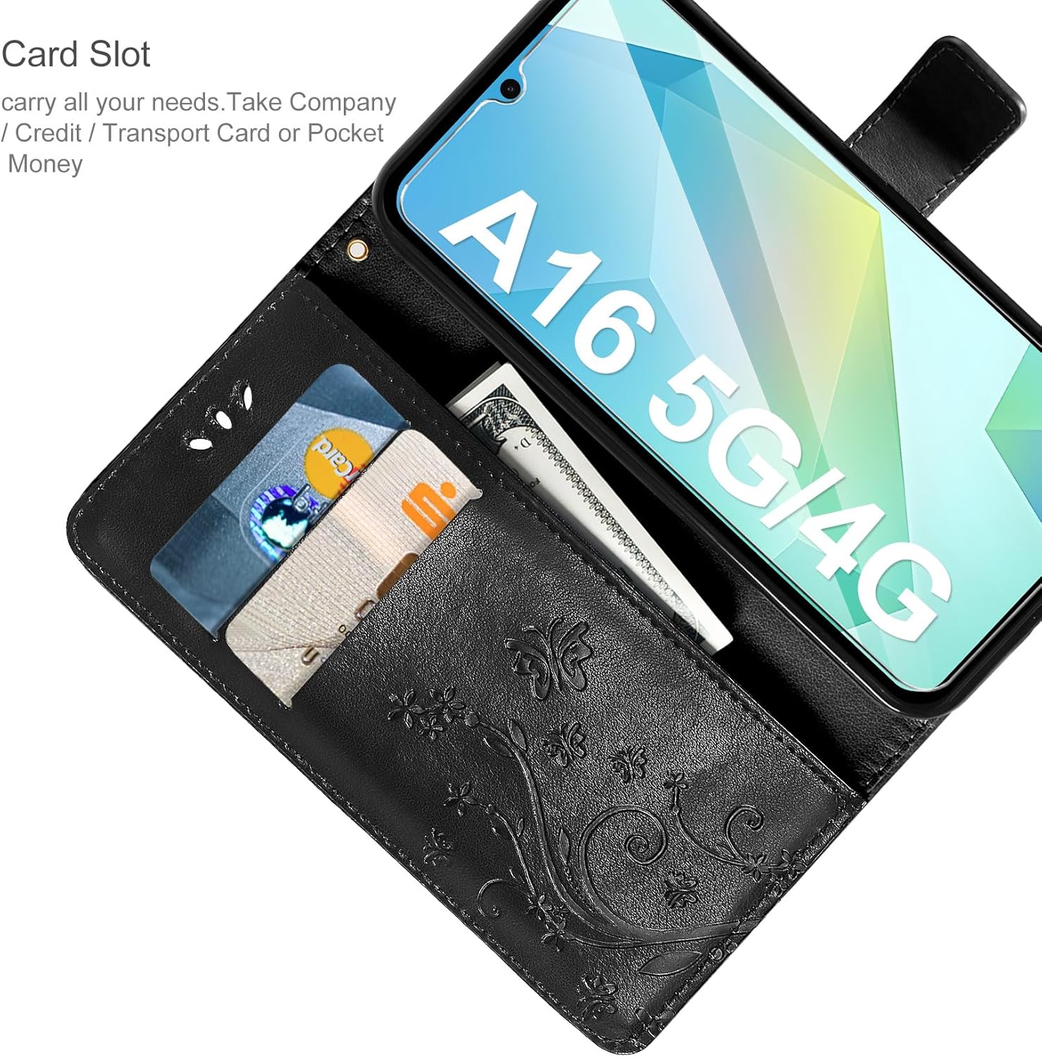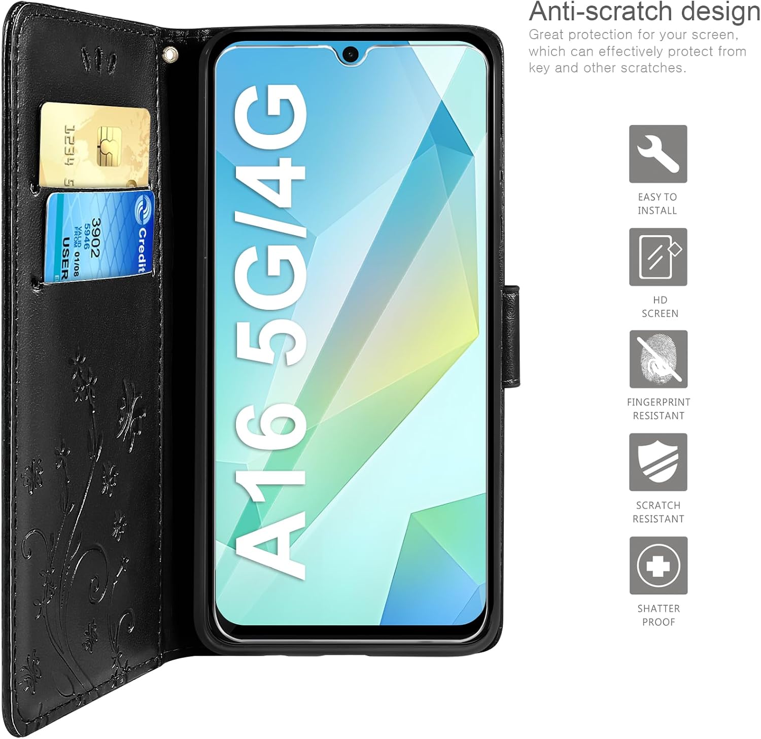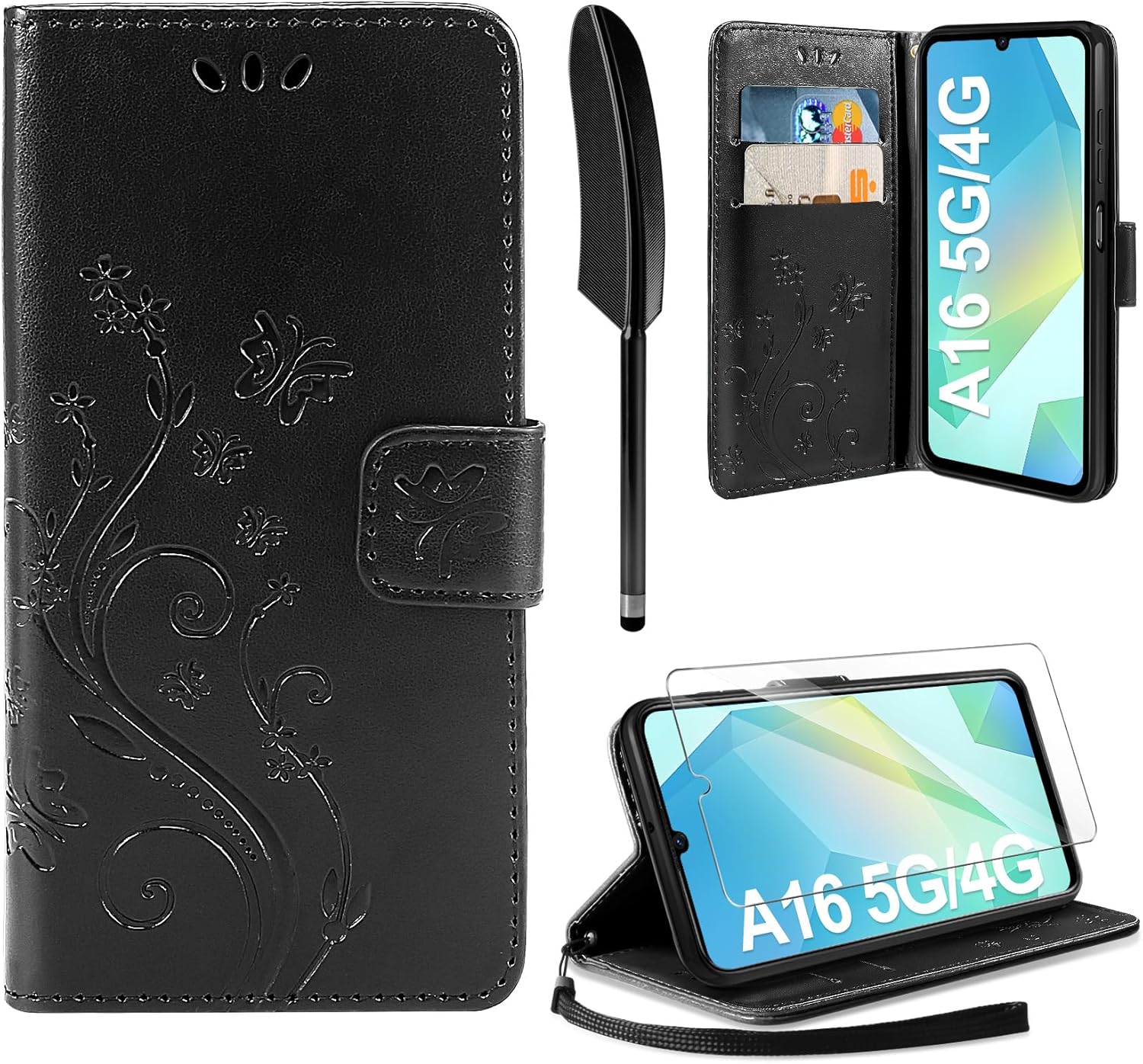 • Флип калъфът е съвместим със Samsung Galaxy A16 5G/4G и предлага отлична 360-градусова защита. Многофункционален флип калъф от PU кожа с цветя на пеперуда и мека вътрешна подплата от TPU, защитно фолио за защита на екрана от прах и драскотини.