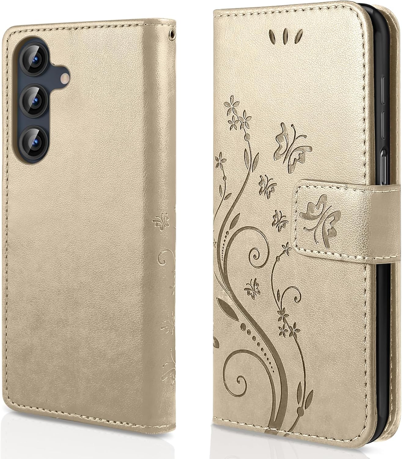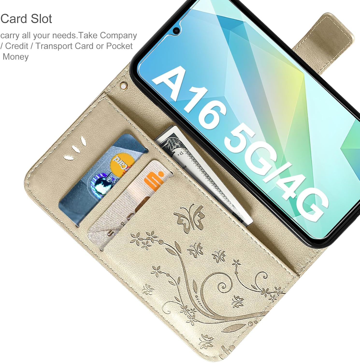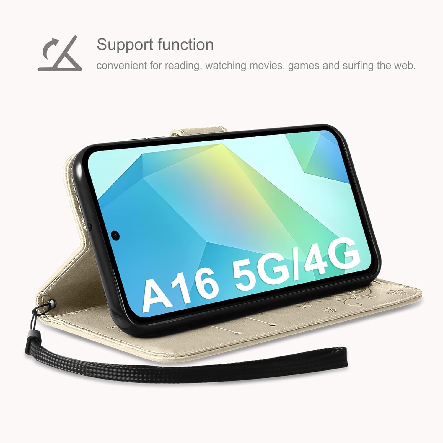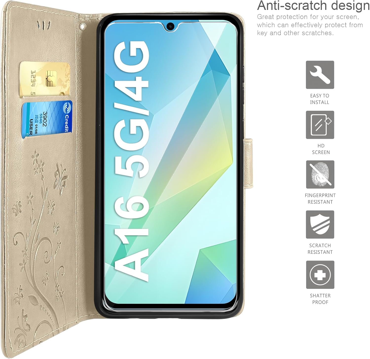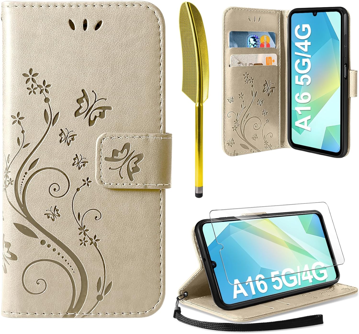 • Флип калъфът е съвместим със Samsung Galaxy A16 5G/4G и предлага отлична 360-градусова защита. Многофункционален флип калъф от PU кожа с цветя на пеперуда и мека вътрешна подплата от TPU, защитно фолио за защита на екрана от прах и драскотини.