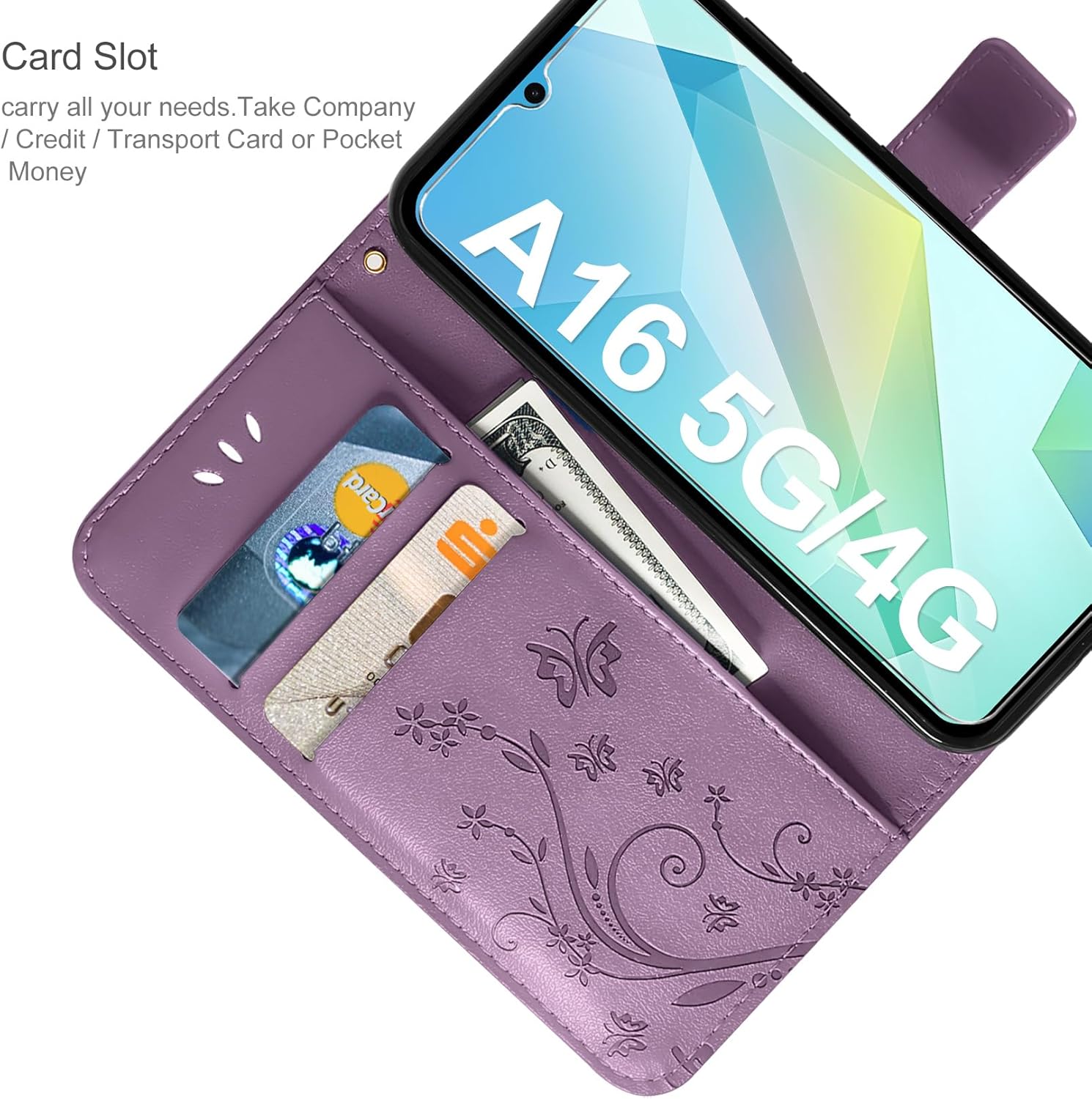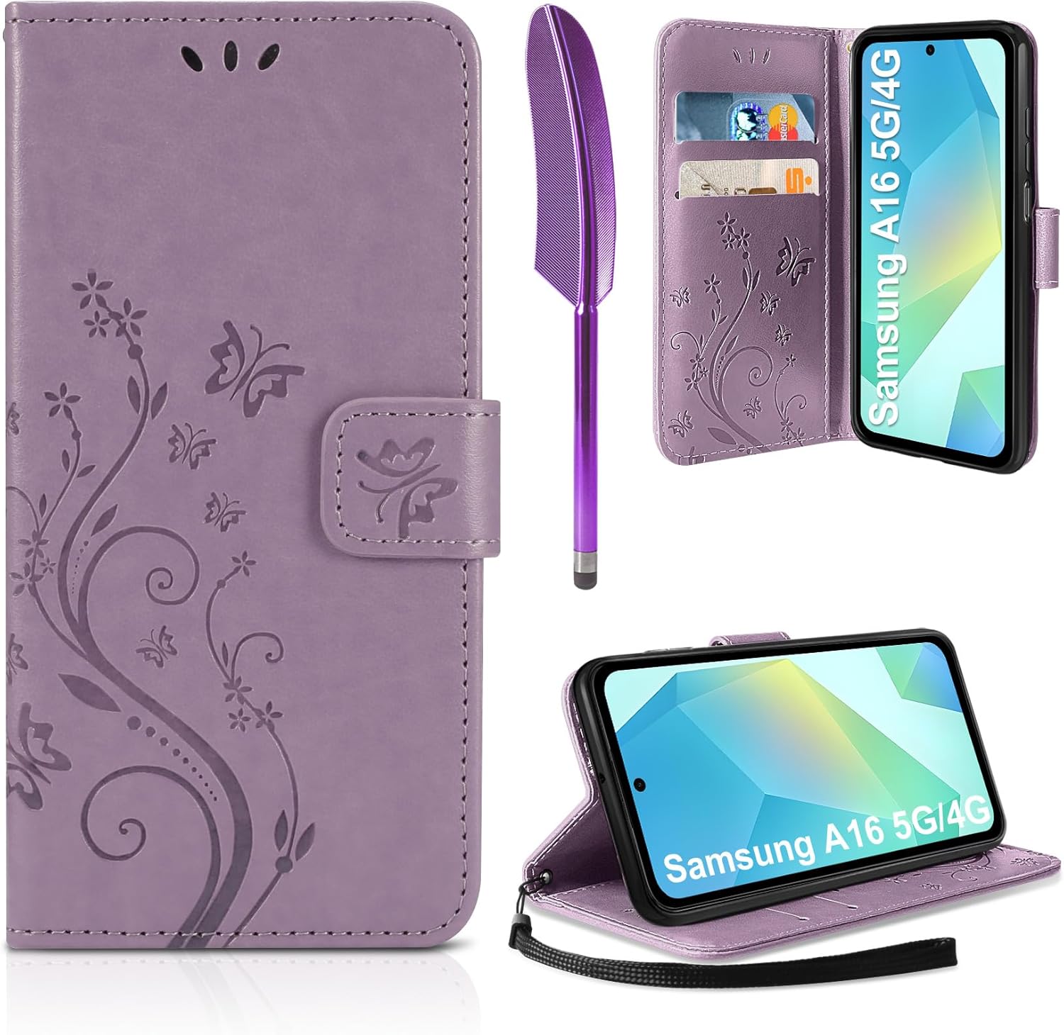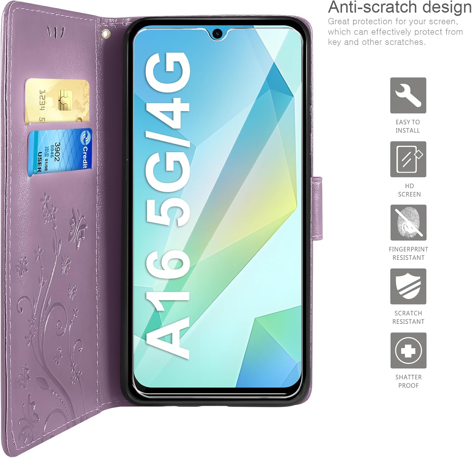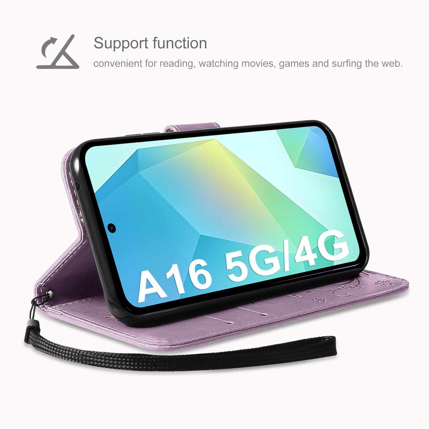 • Флип калъфът е съвместим със Samsung Galaxy A16 5G/4G и предлага отлична 360-градусова защита. Многофункционален флип калъф от PU кожа с цветя на пеперуда и мека вътрешна подплата от TPU, защитно фолио за защита на екрана от прах и драскотини.
