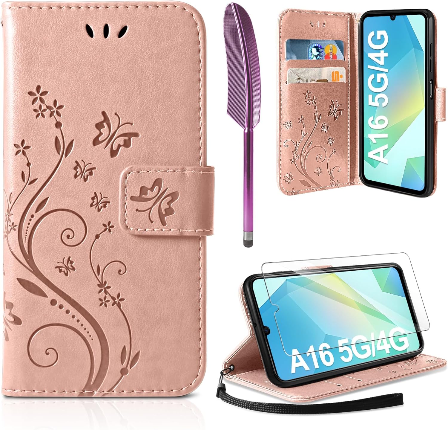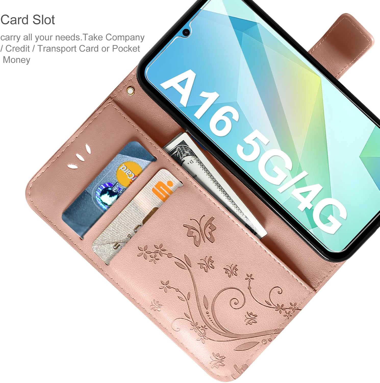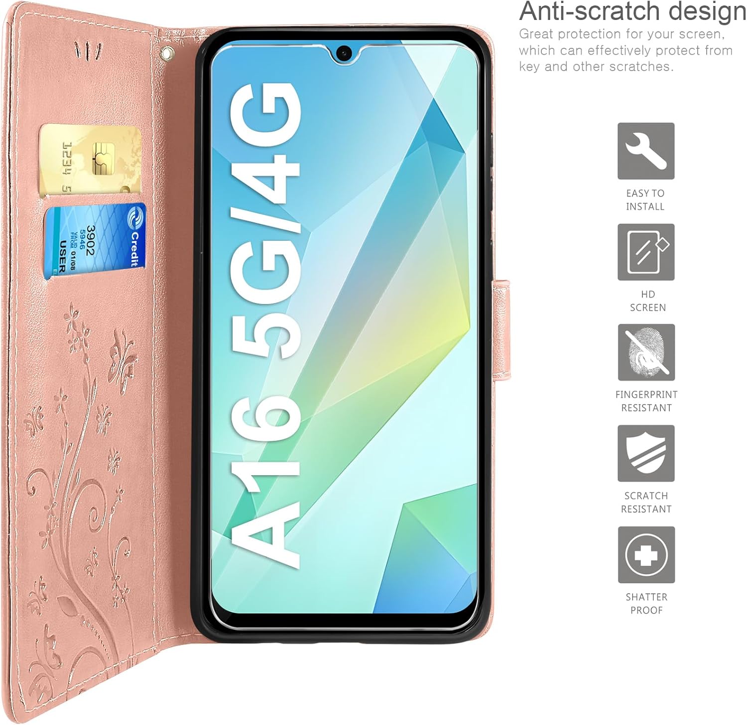 • Флип калъфът е съвместим със Samsung Galaxy A16 5G/4G и предлага отлична 360-градусова защита. Многофункционален флип калъф от PU кожа с цветя на пеперуда и мека вътрешна подплата от TPU, защитно фолио за защита на екрана от прах и драскотини.