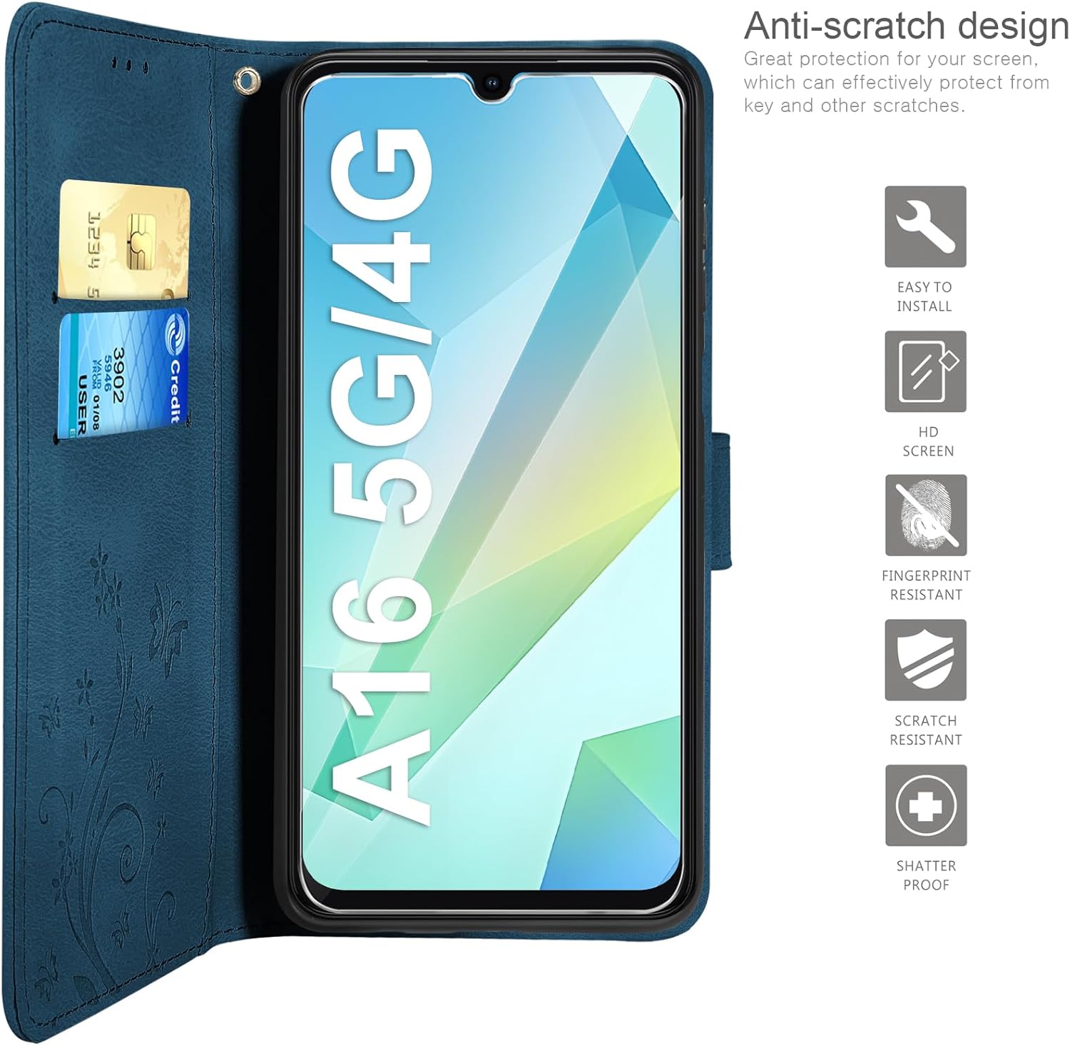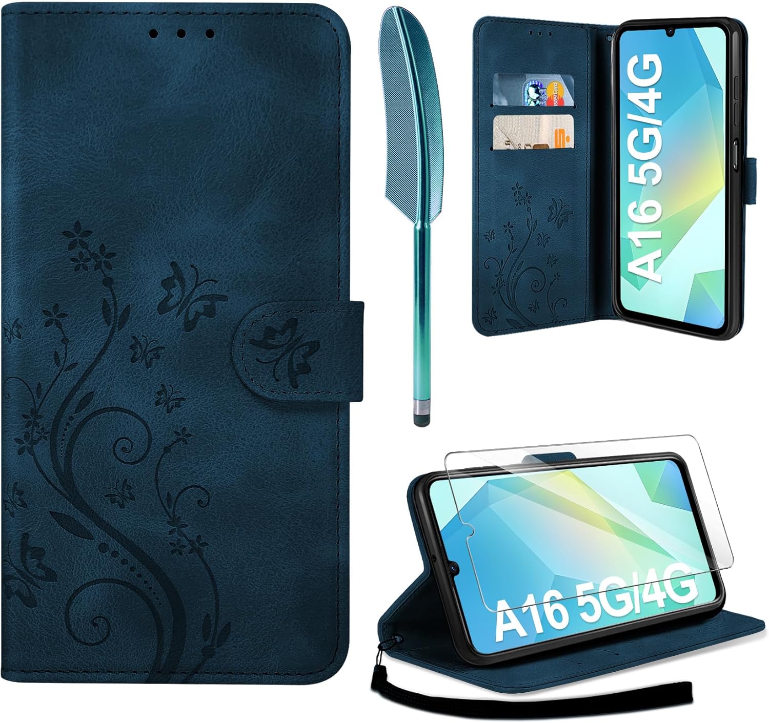 • Флип калъфът е съвместим със Samsung Galaxy A16 5G/4G и предлага отлична 360-градусова защита. Многофункционален флип калъф от PU кожа с цветя на пеперуда и мека вътрешна подплата от TPU, защитно фолио за защита на екрана от прах и драскотини.