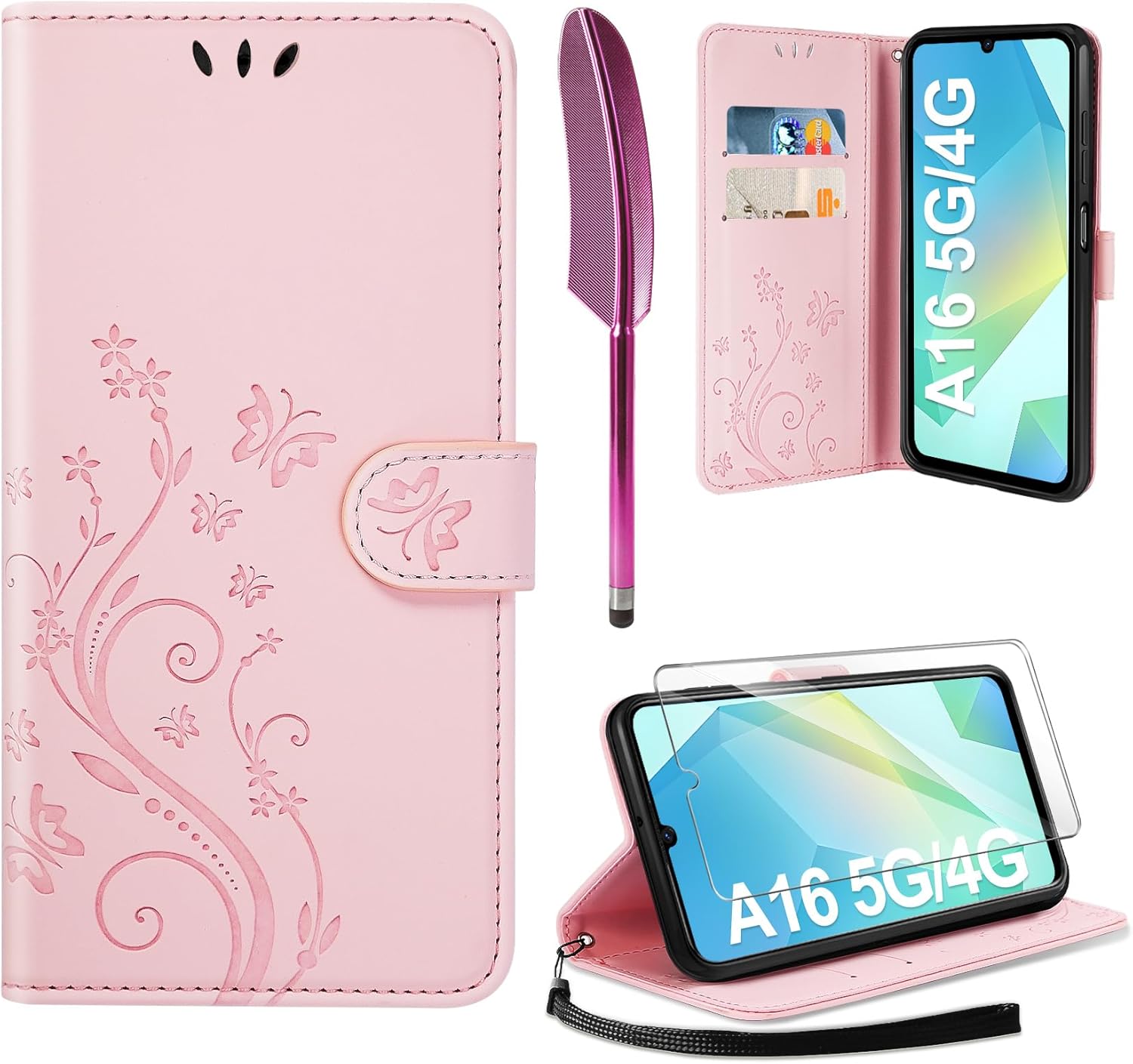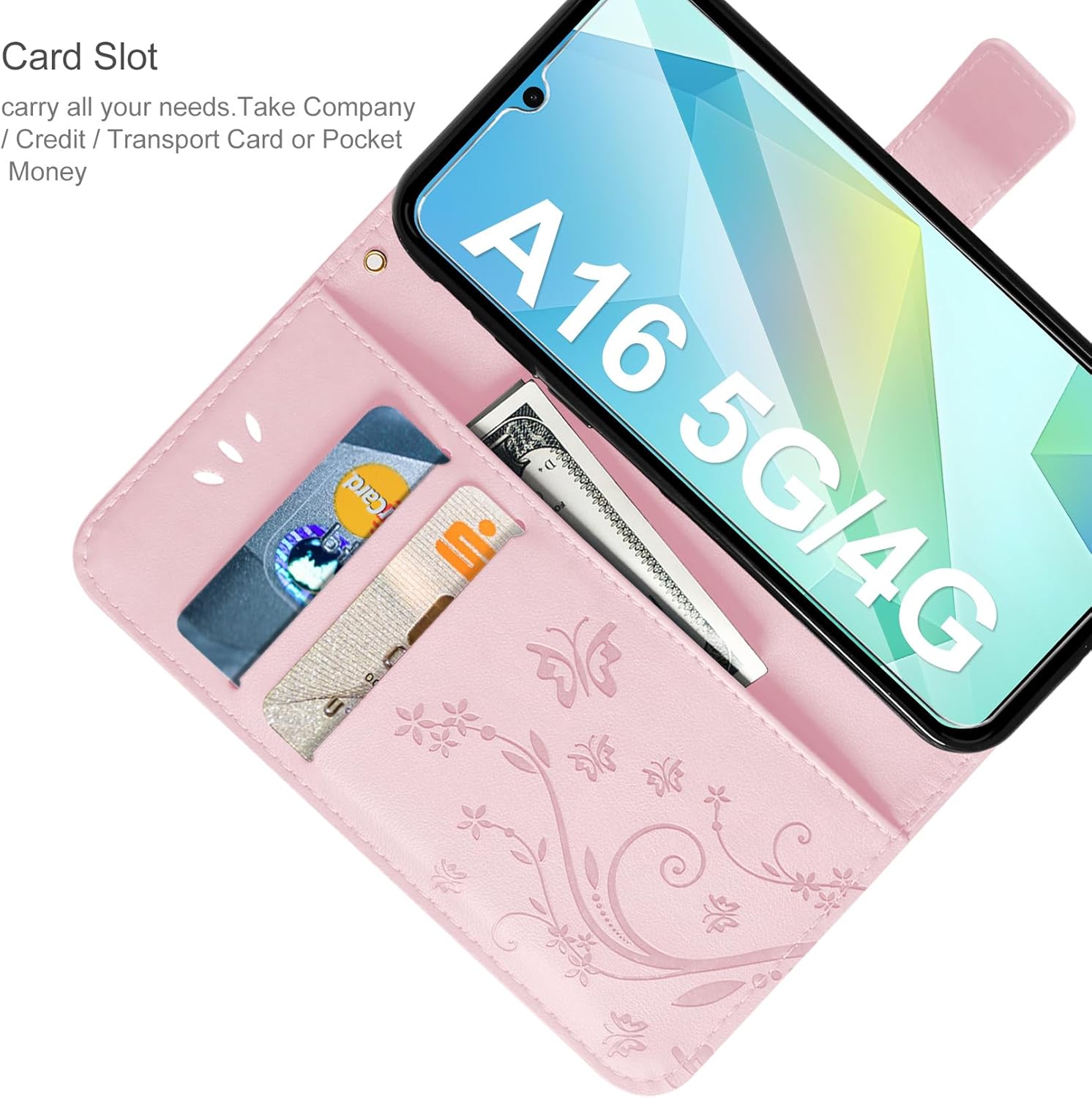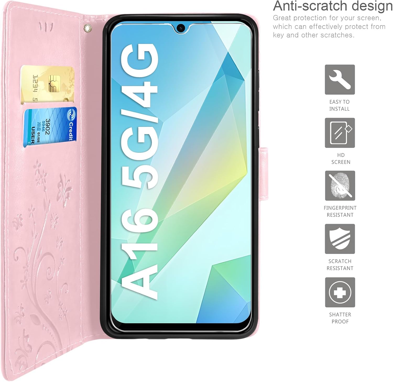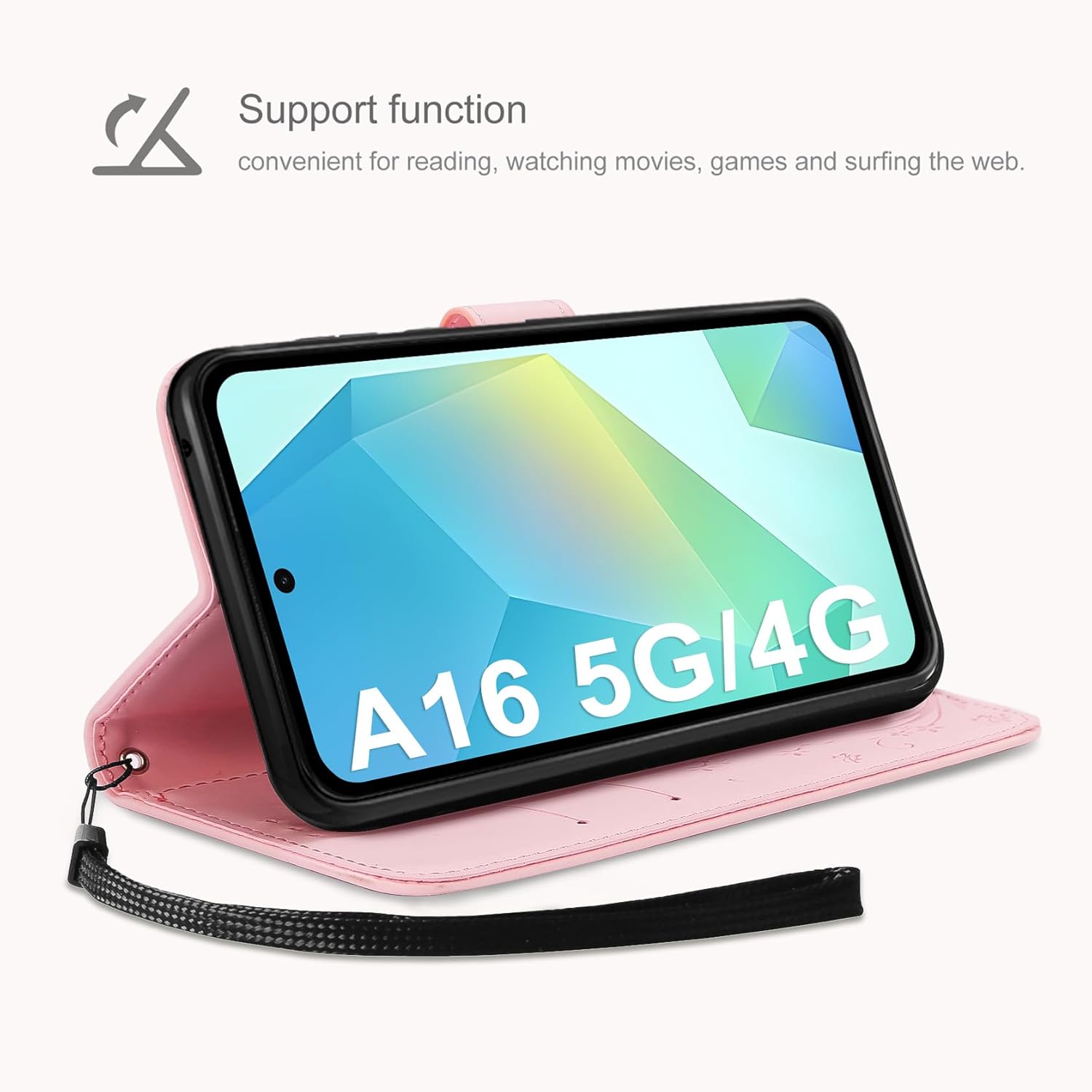 • Флип калъфът е съвместим със Samsung Galaxy A16 5G/4G и предлага отлична 360-градусова защита. Многофункционален флип калъф от PU кожа с цветя на пеперуда и мека вътрешна подплата от TPU, защитно фолио за защита на екрана от прах и драскотини.