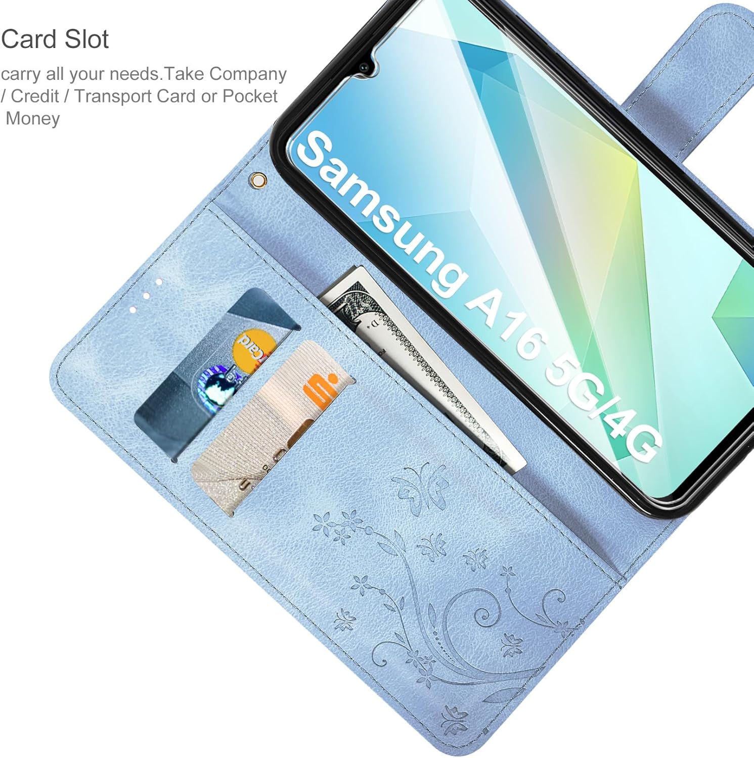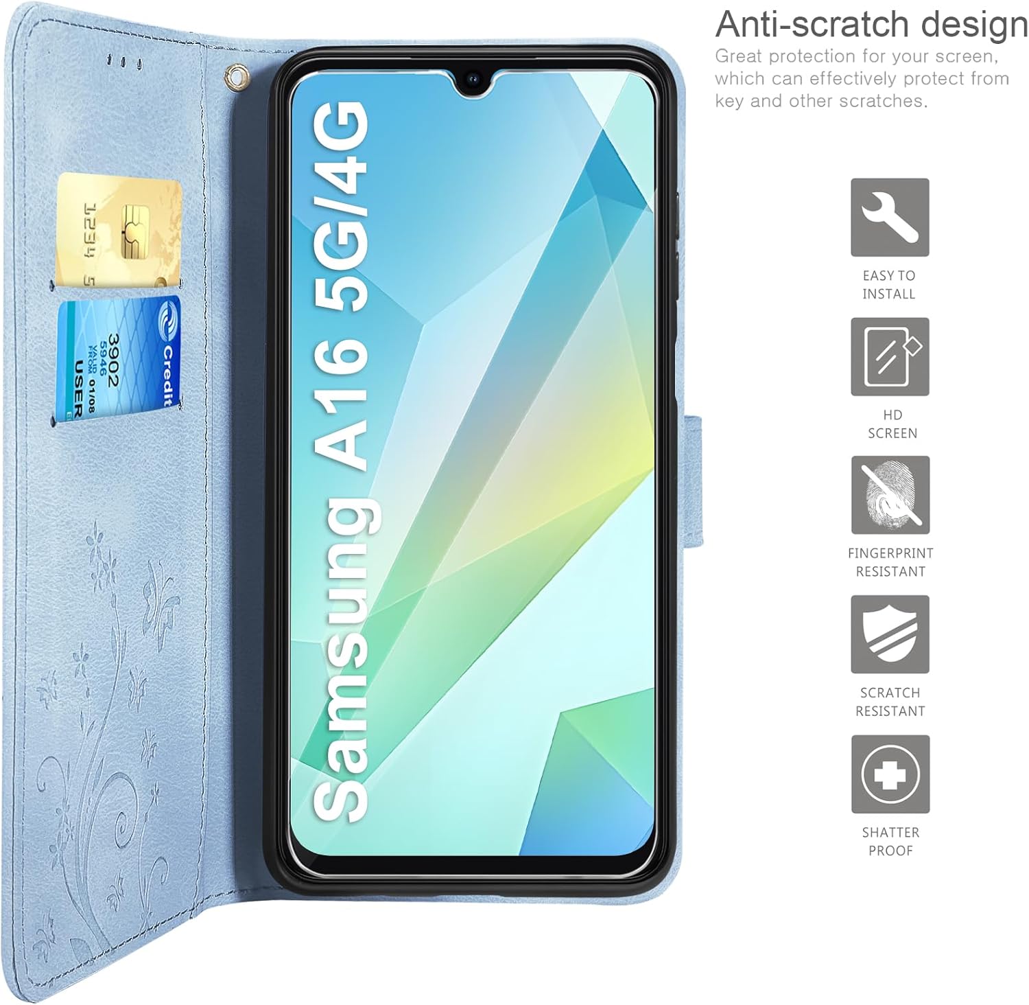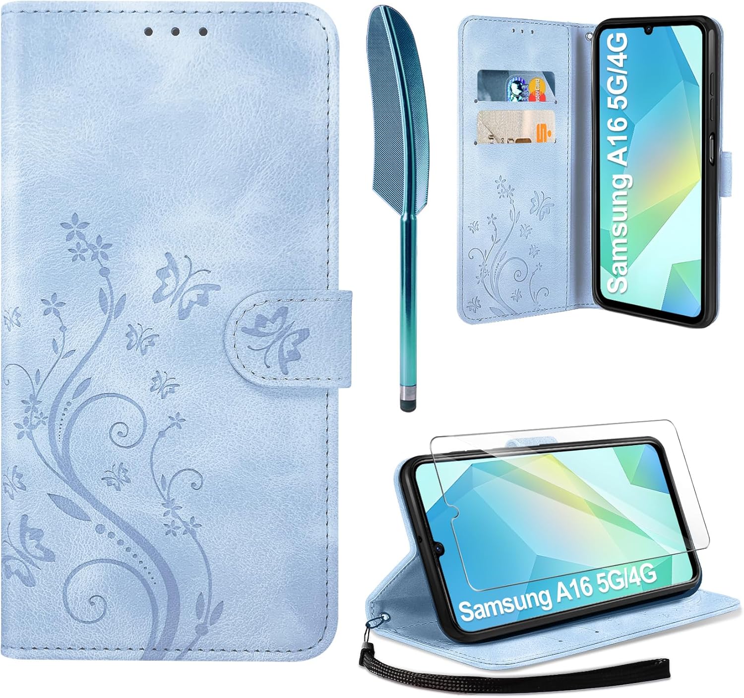 • Флип калъфът е съвместим със Samsung Galaxy A16 5G/4G и предлага отлична 360-градусова защита. Многофункционален флип калъф от PU кожа с цветя на пеперуда и мека вътрешна подплата от TPU, защитно фолио за защита на екрана от прах и драскотини.