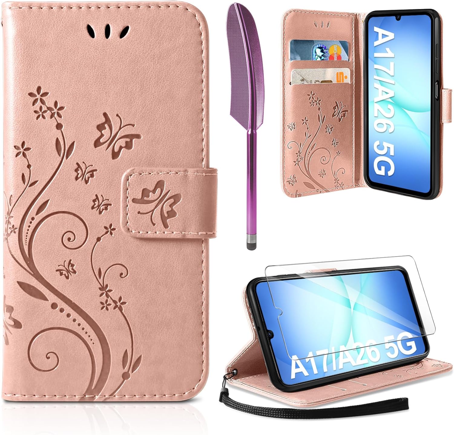 Кожен калъф AROYI, съвместим с Samsung Galaxy A26 5G, калъф и протектор за екран, флип-портфейл, калъф за мобилен телефон, PU кожен калъф, слотове за карти, защитен калъф, съвместим с Samsung Galaxy A26 5G, розов
