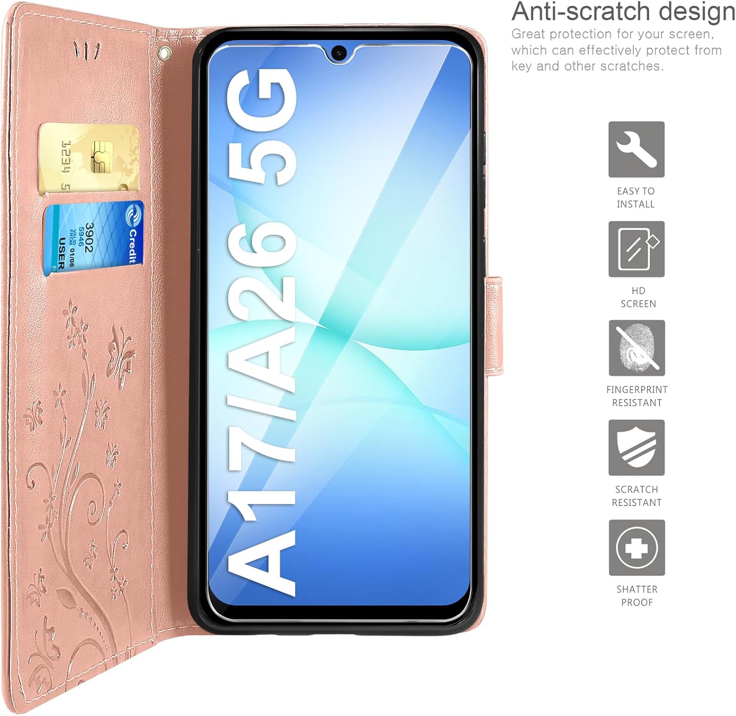 • Флип калъфът е съвместим със Samsung Galaxy A16 5G/4G и предлага отлична 360-градусова защита. Многофункционален флип калъф от PU кожа с цветя на пеперуда и мека вътрешна подплата от TPU, защитно фолио за защита на екрана от прах и драскотини.