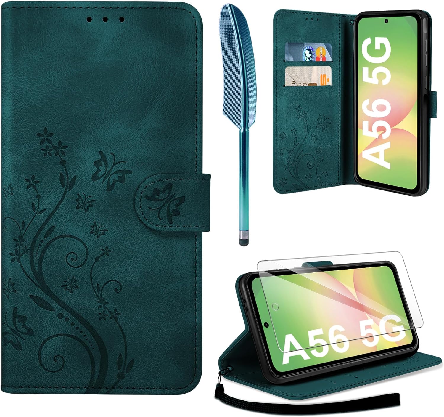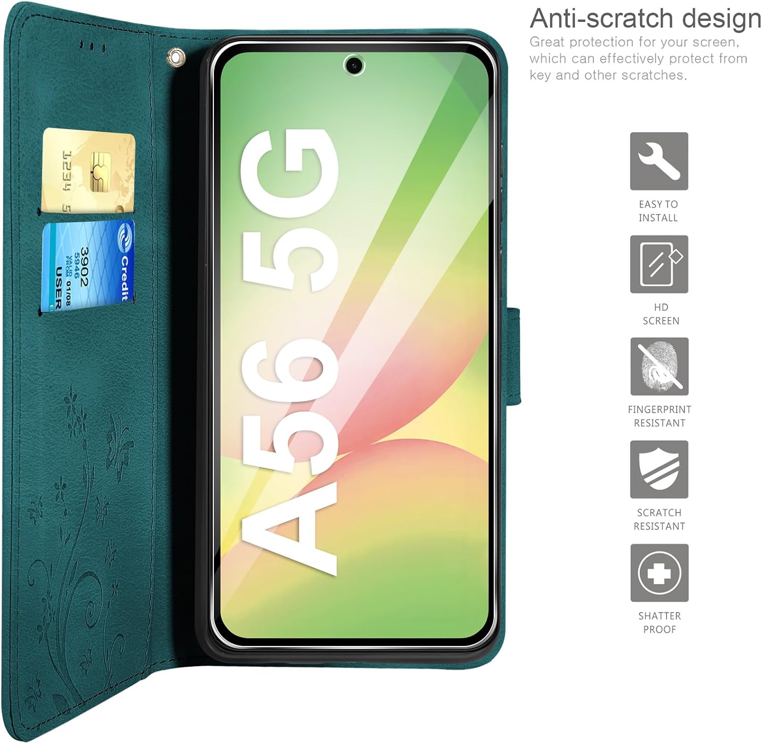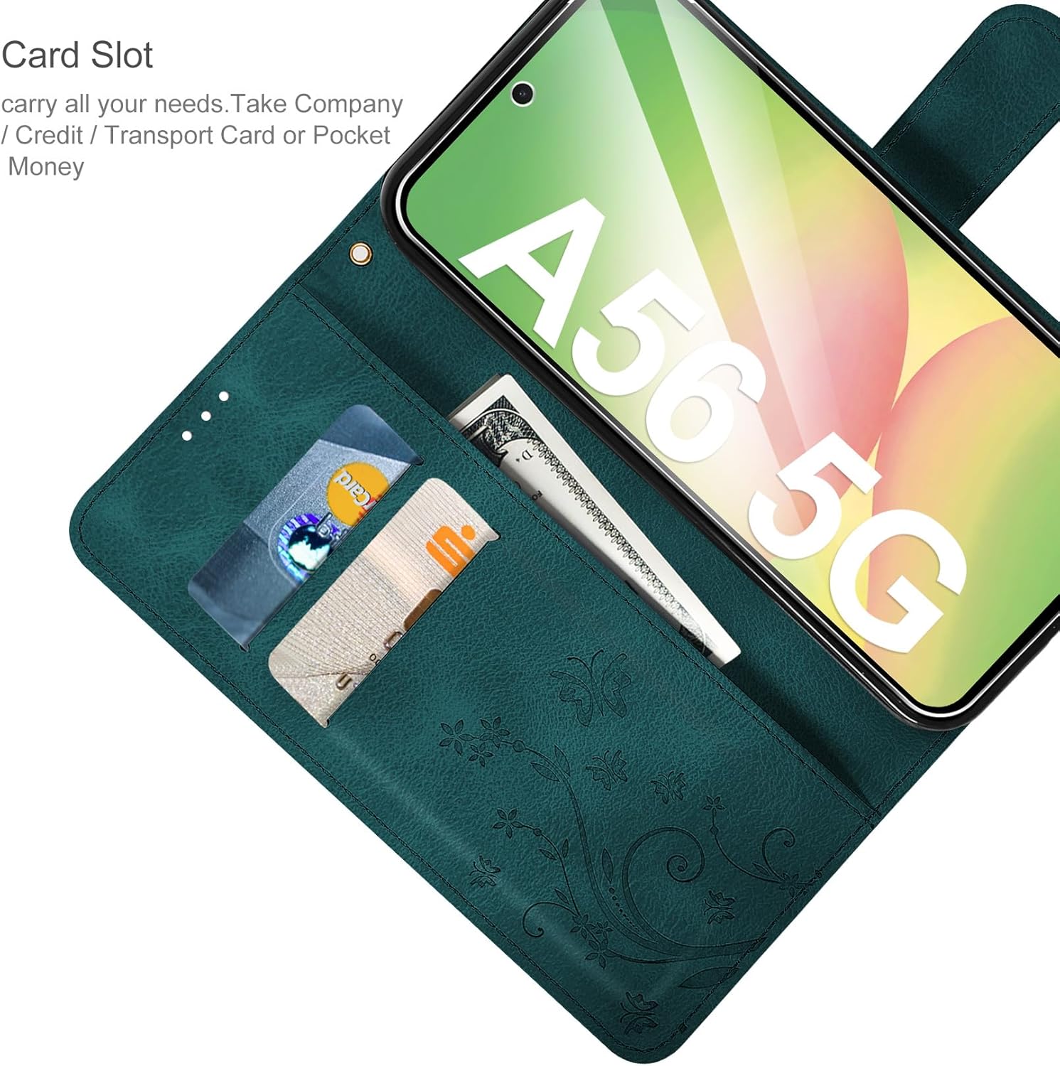 Кожен калъф AROYI, съвместим с Samsung Galaxy A56 5G, калъф и протектор за екран, флип-портфейл, калъф за мобилен телефон, PU кожен калъф със слотове за карти, защитен калъф, съвместим с Samsung Galaxy A56 5G, синьо-зелен