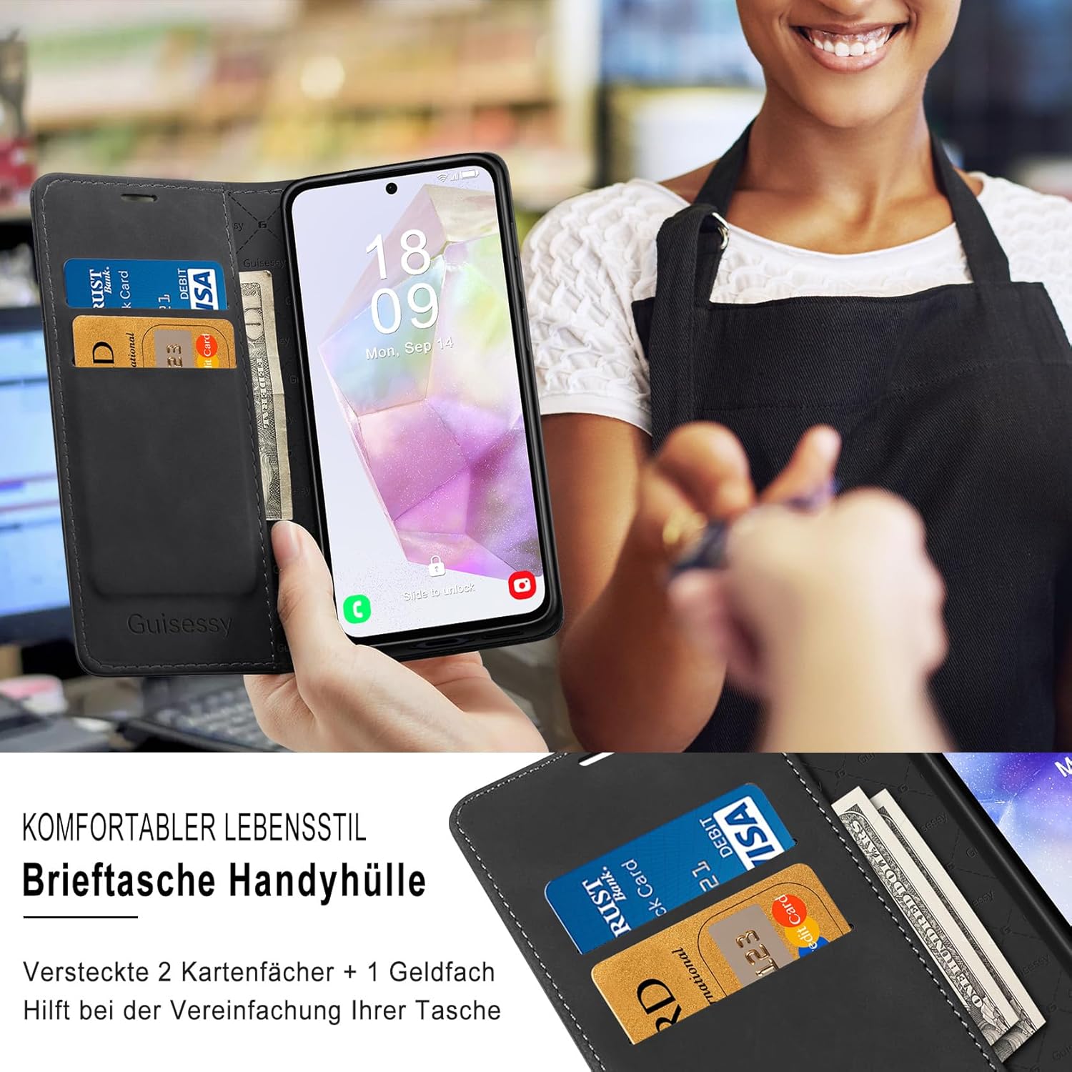 • Стил портфейл: съвместим с Samsung Galaxy S25 FE, сгъваем кожен калъф, перфектна комбинация от калъф за мобилен телефон и портфейл. Два слота за карти за кредитни карти, лична карта, визитки и страничен джоб за пари, касови бележки и сметки. Може да служи като калъф и сигурен преносим портфейл.