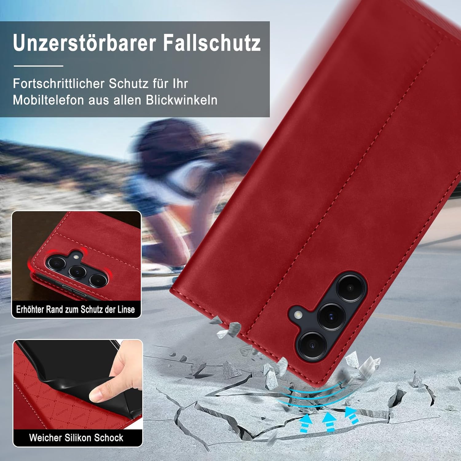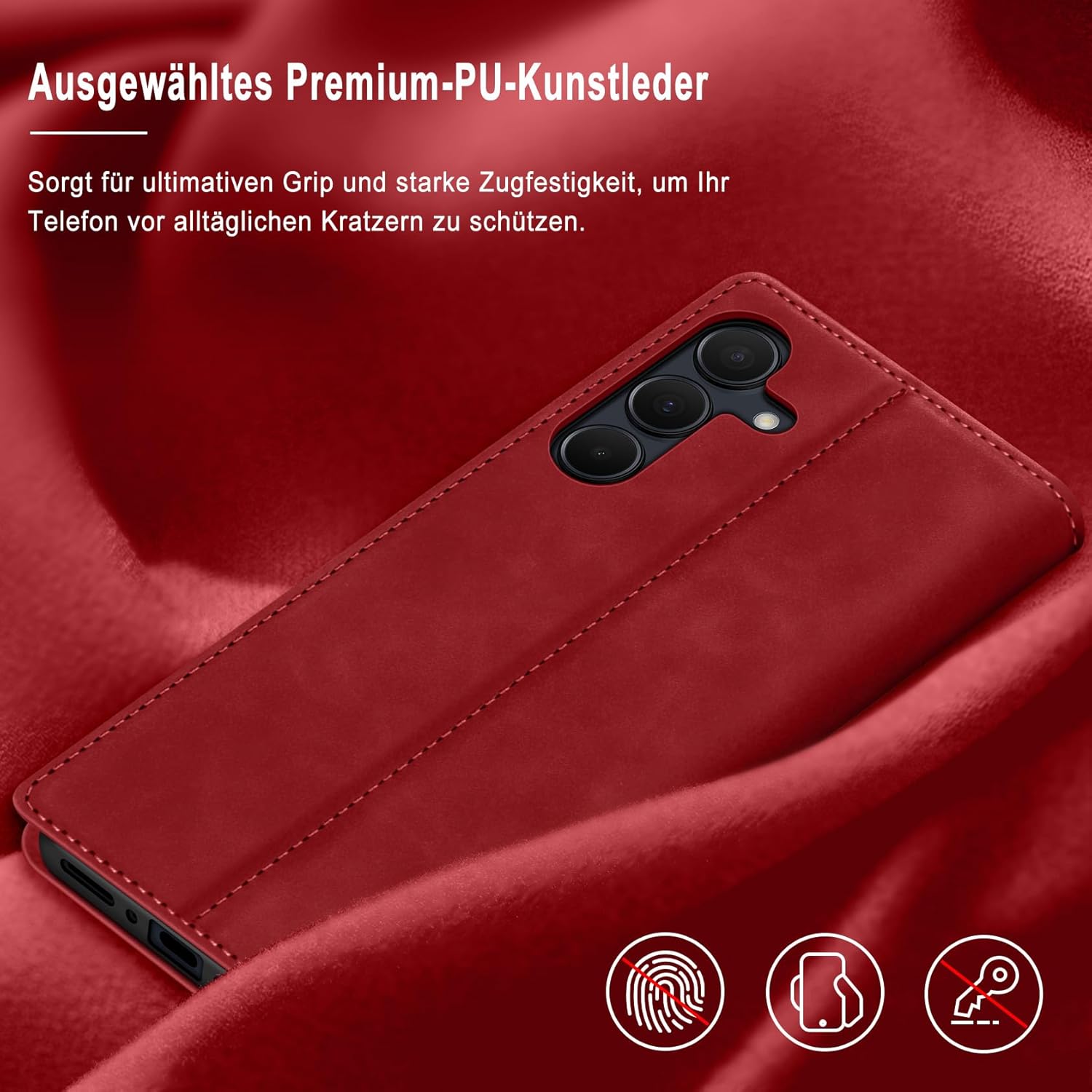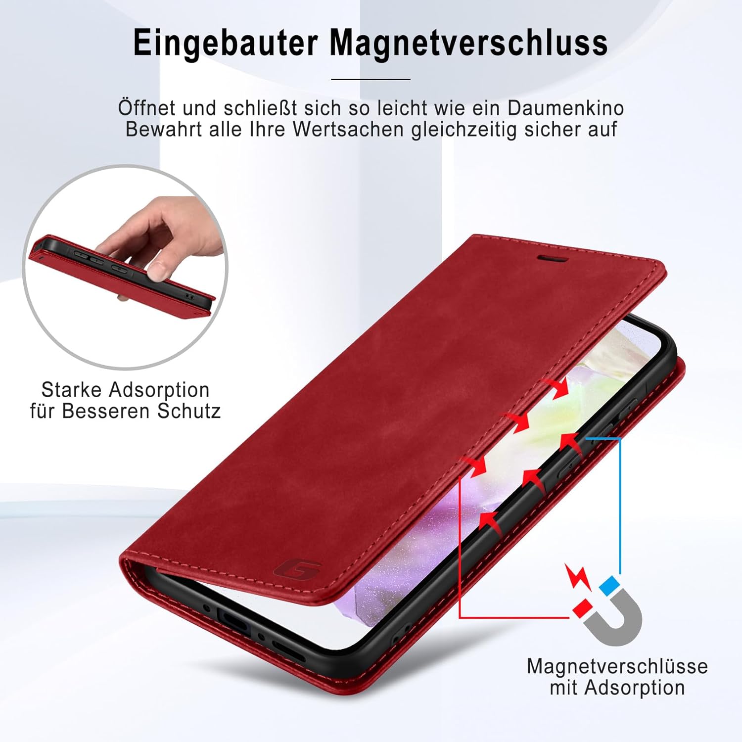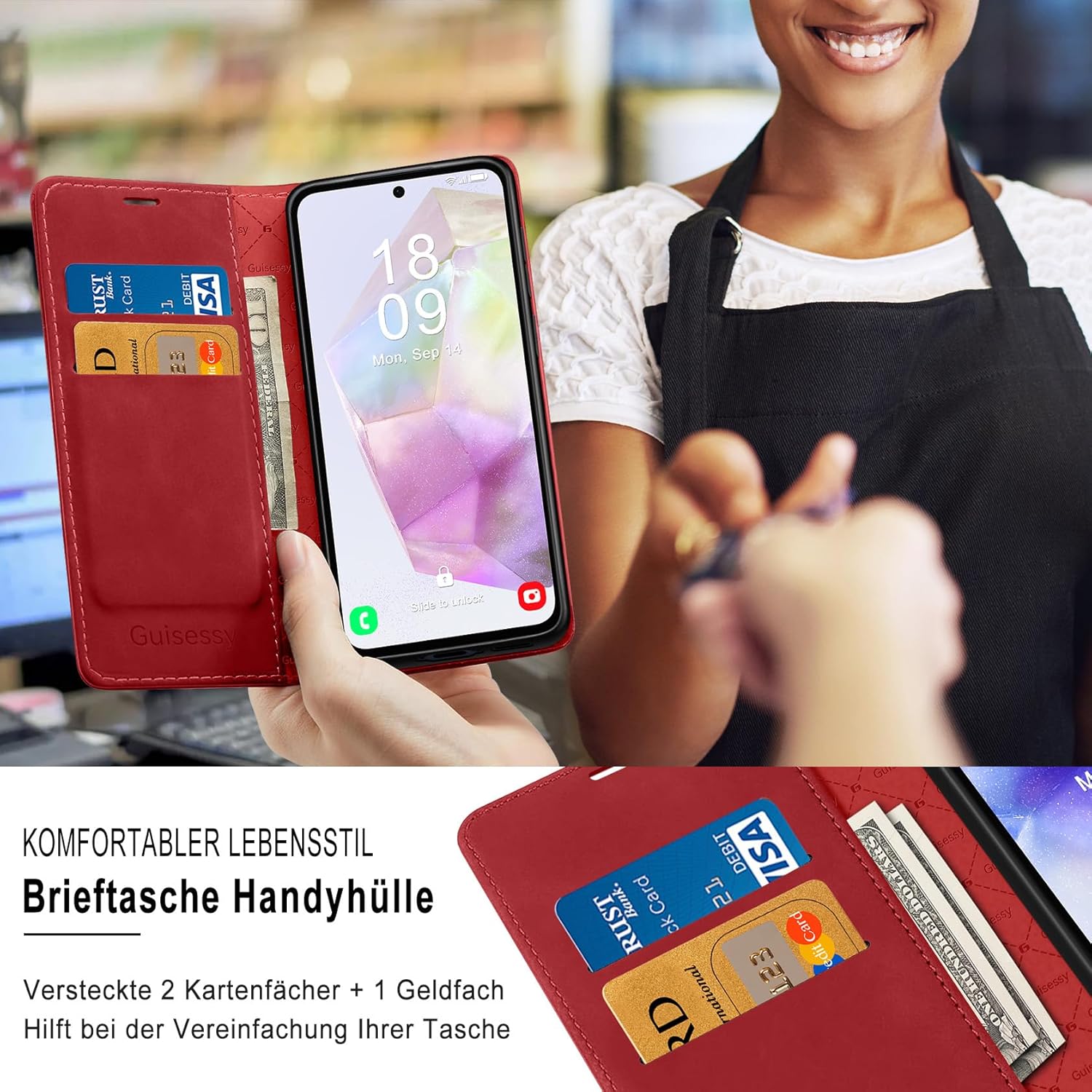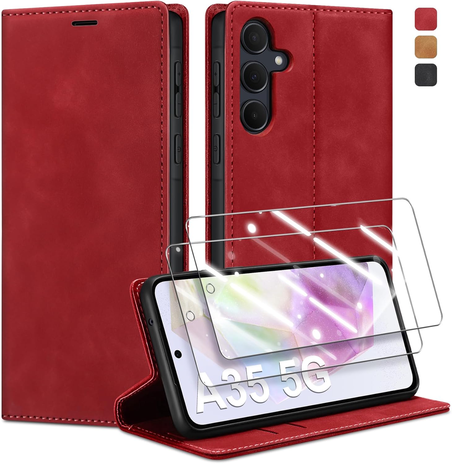 Кожен калъф за мобилен телефон за Samsung Galaxy A35 5G и 2 протектора за екран, първокласен сгъваем портфейл с магнитен слот за карти и функция стойка, защитен калъф за Samsung A35 5G, червен