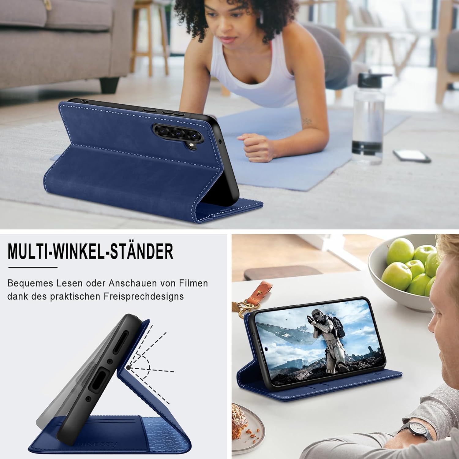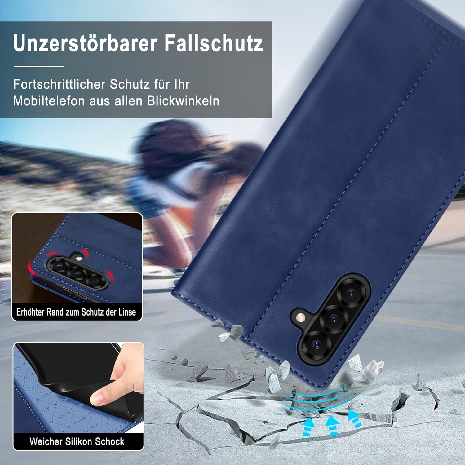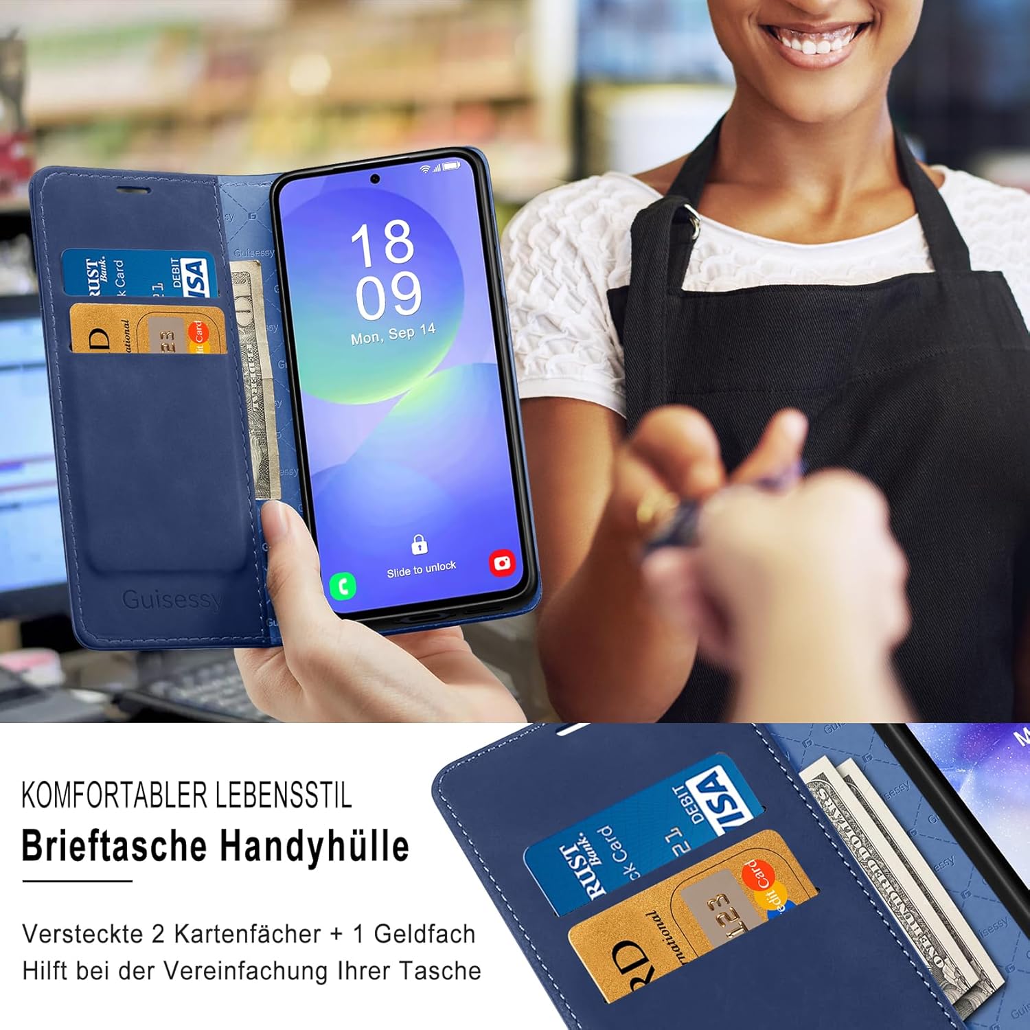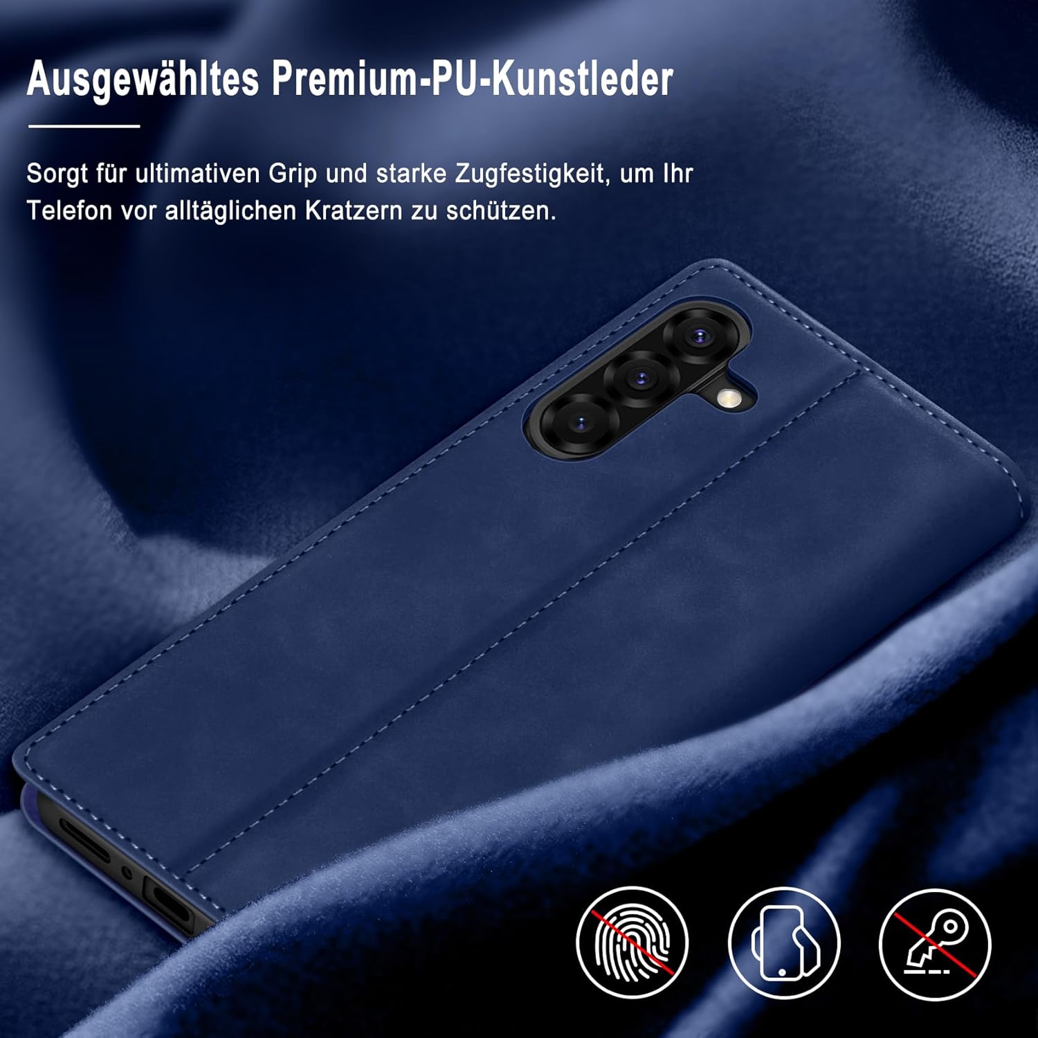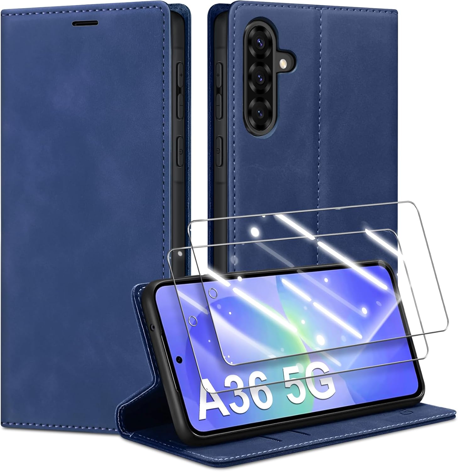 Кожен калъф за мобилен телефон за Samsung Galaxy A36 5G и 2 протектора за екран, първокласен сгъваем калъф-портфейл с магнитен слот за карти, функция стойка, защитен калъф за Samsung A36, син