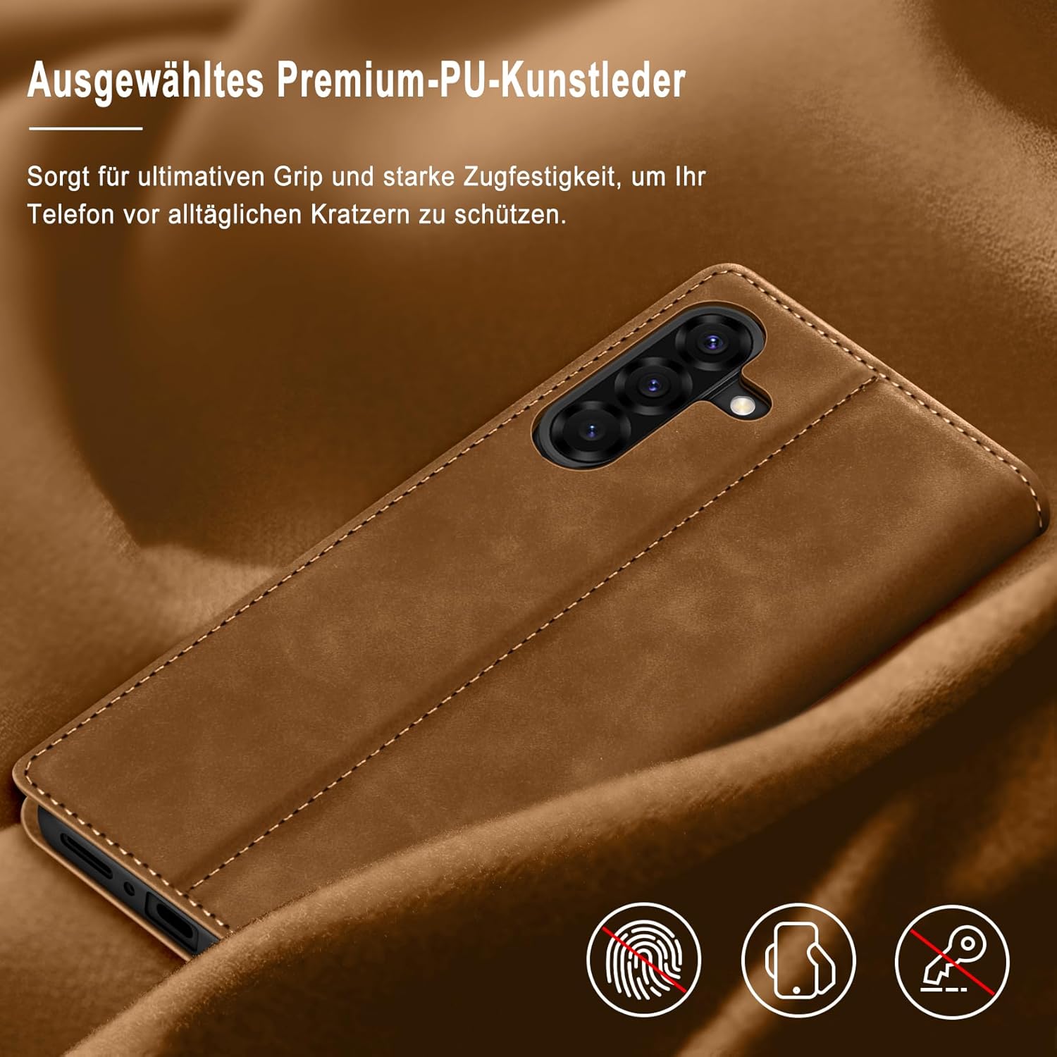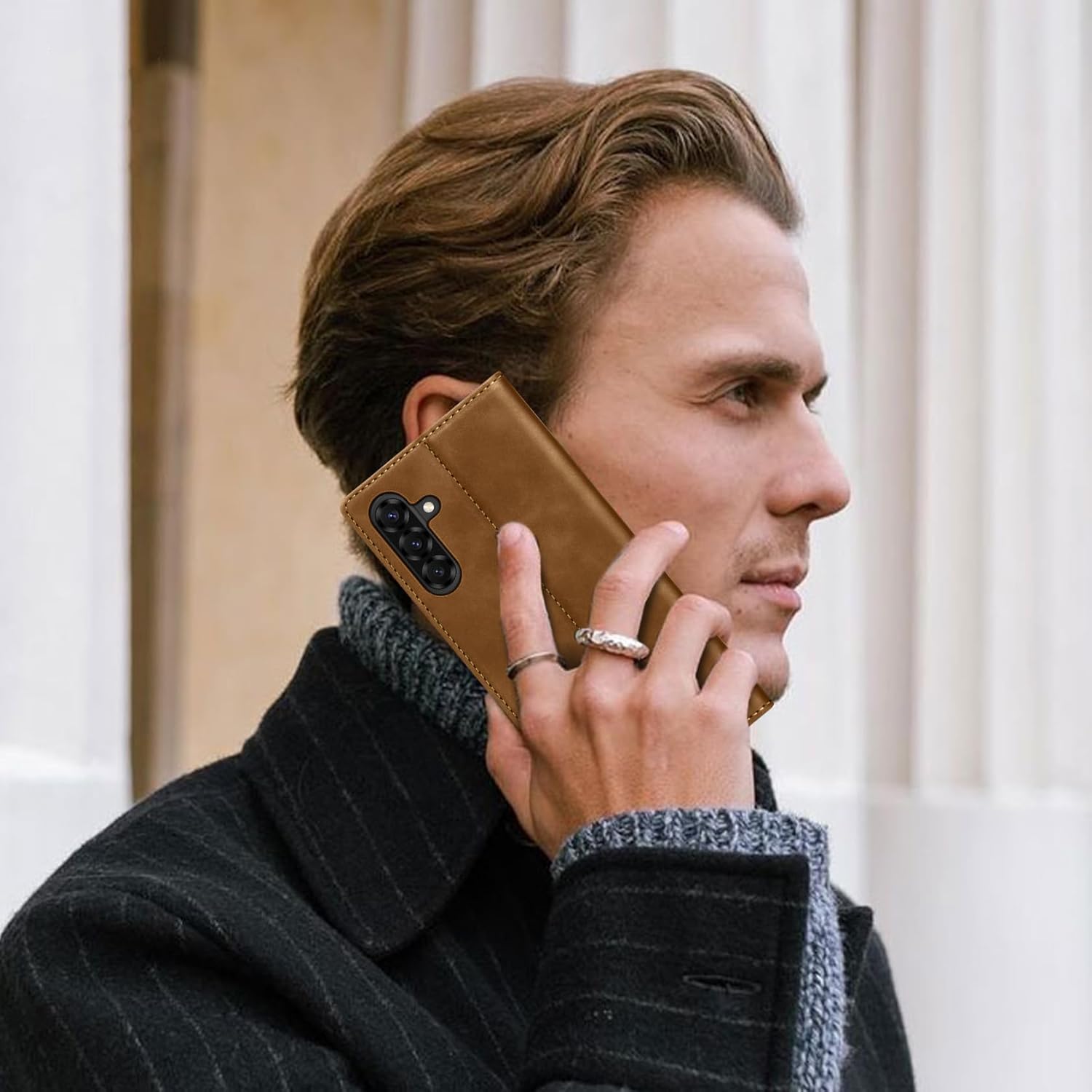 • Премиум PU кожа: Този калъф-портфейл за Samsung Galaxy S25 FE 5G е изработен от висококачествена изкуствена кожа PU и мек и гладък силиконов TPU. Елегантен външен вид, качествената PU има деликатен захват и силна якост на опън, но също така е удароустойчив и осигурява максимална защита от замърсявания, удари и драскотини, осигурявайки отлична 360-градусова всестранна защита.