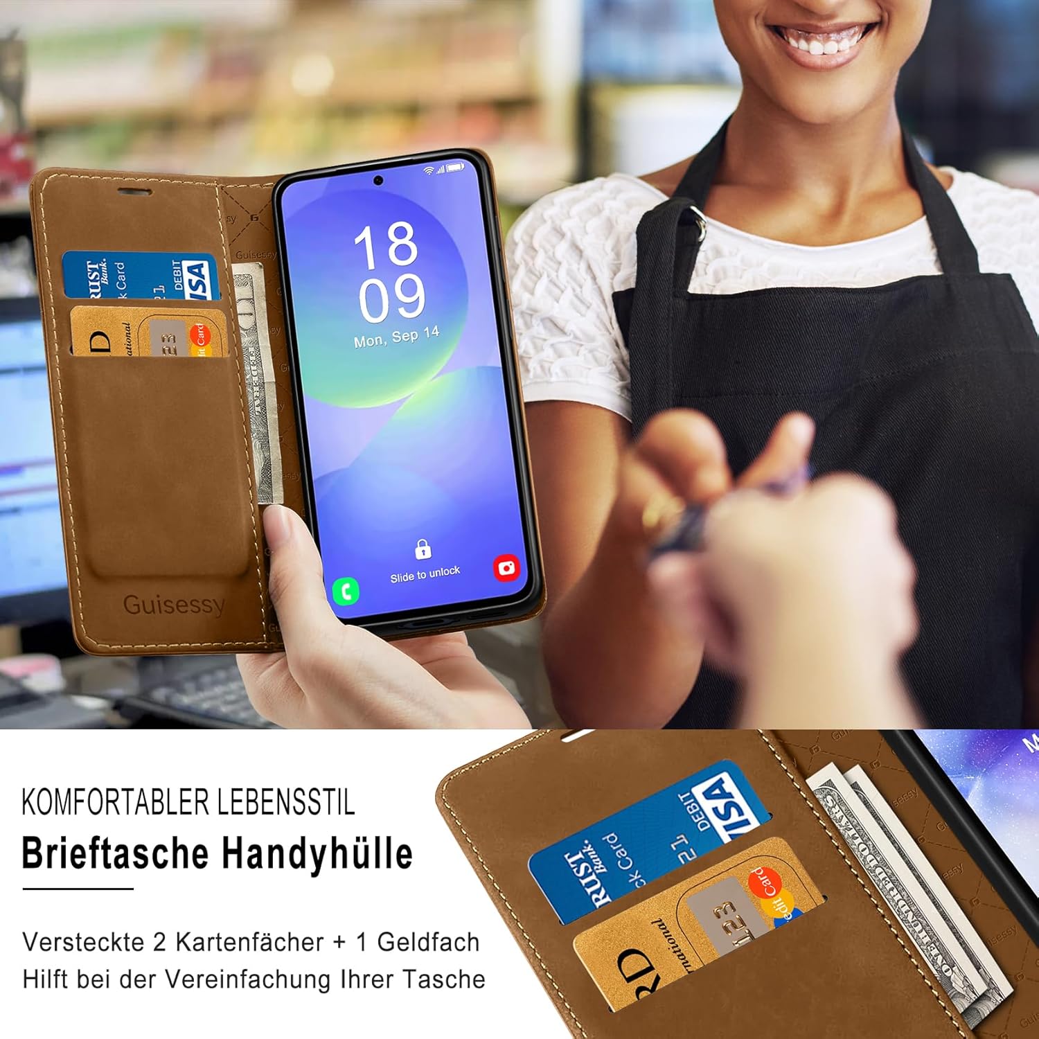 • Стил портфейл: съвместим с Samsung Galaxy S25 FE, сгъваем кожен калъф, перфектна комбинация от калъф за мобилен телефон и портфейл. Два слота за карти за кредитни карти, лична карта, визитки и страничен джоб за пари, касови бележки и сметки. Може да служи като калъф и сигурен преносим портфейл.