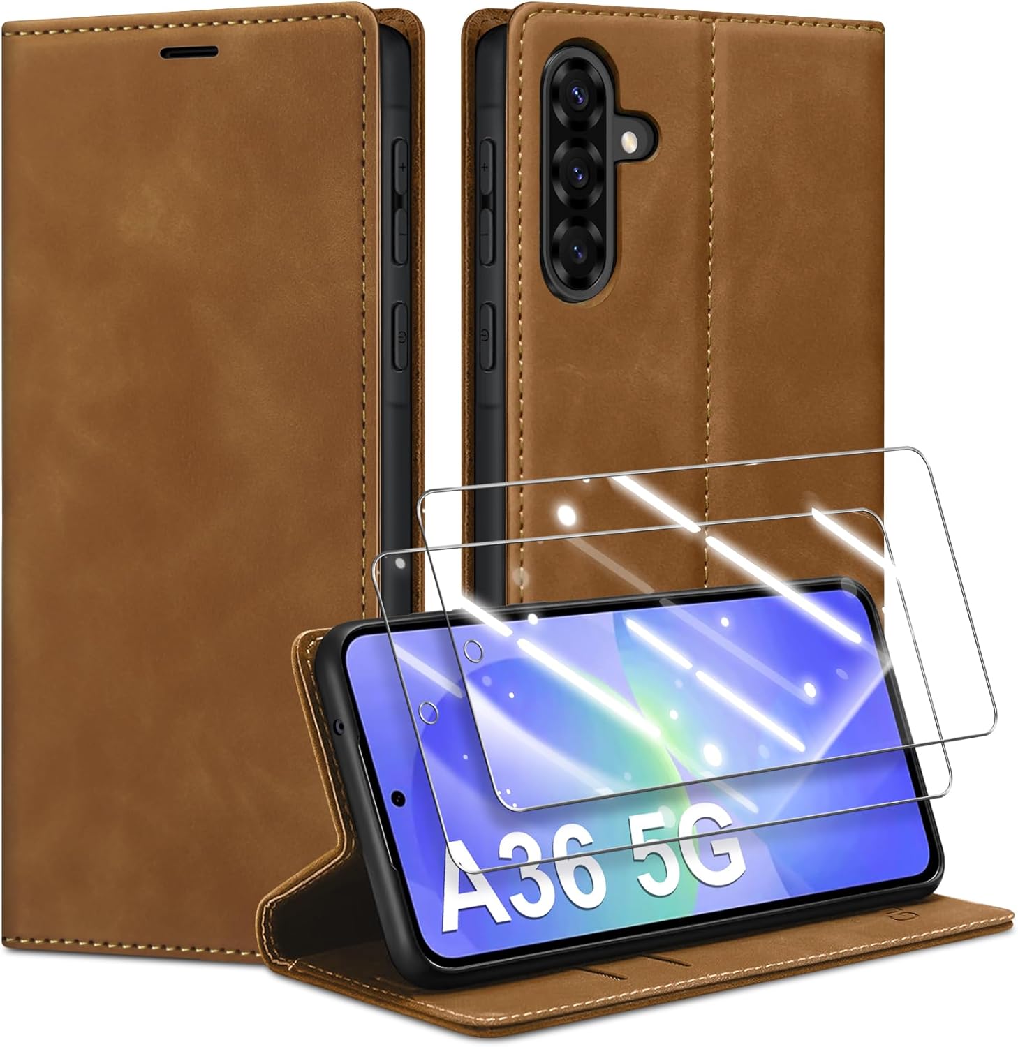 Кожен калъф за мобилен телефон за Samsung Galaxy A36 5G и 2 протектора за екран, първокласен сгъваем калъф-портфейл с магнитен слот за карти, функция стойка, защитен калъф за Samsung A36,