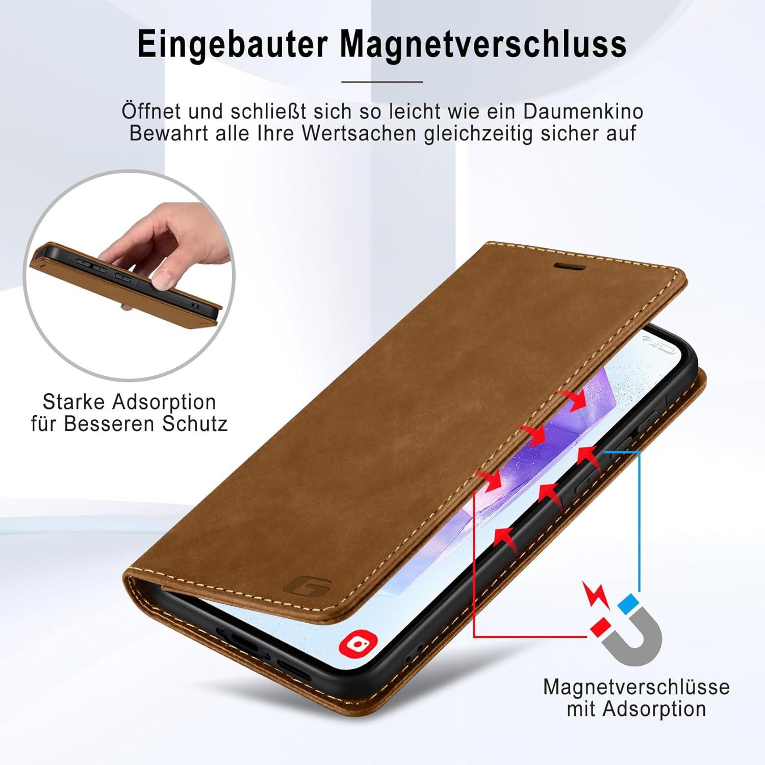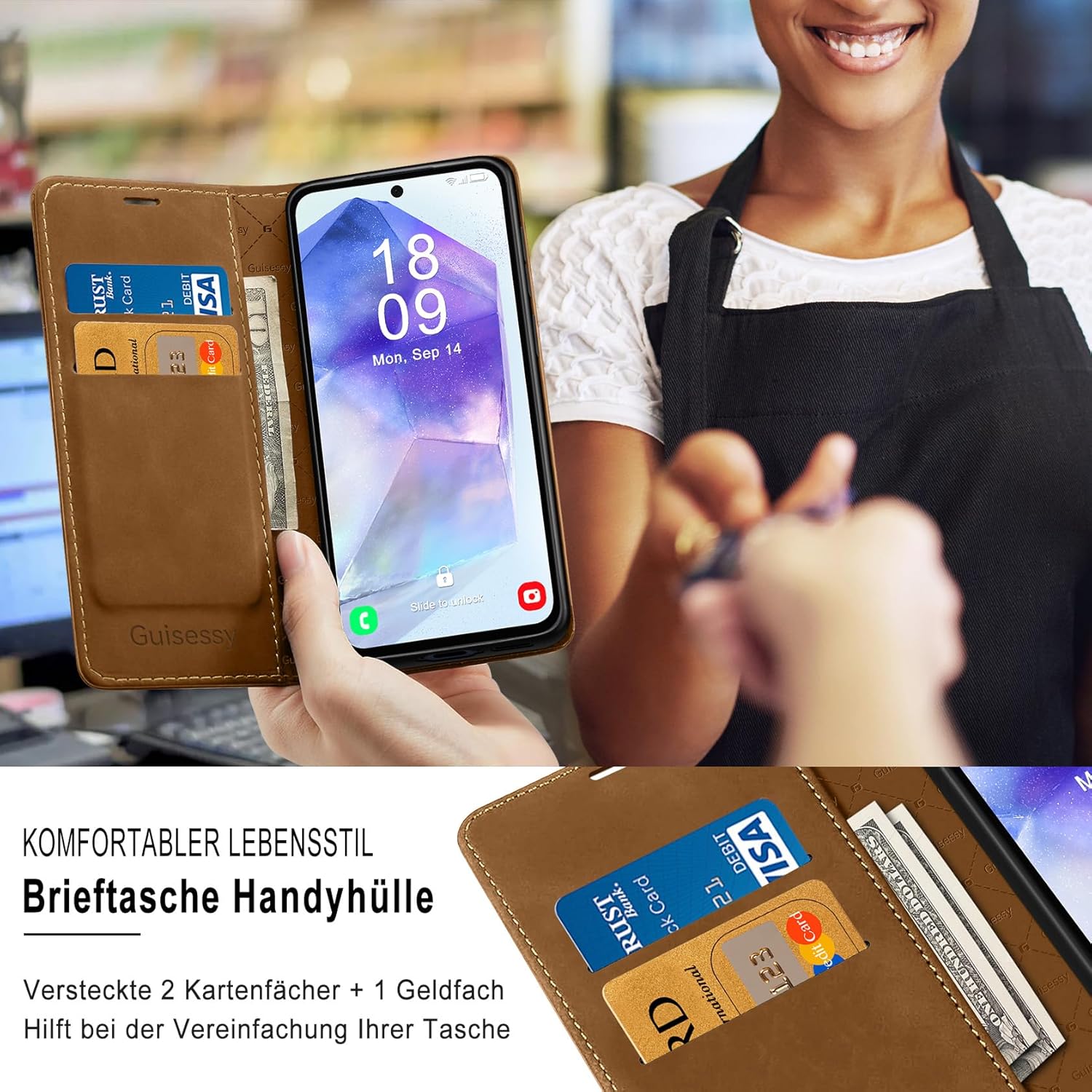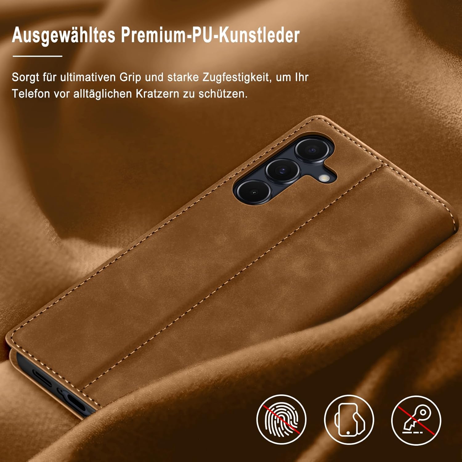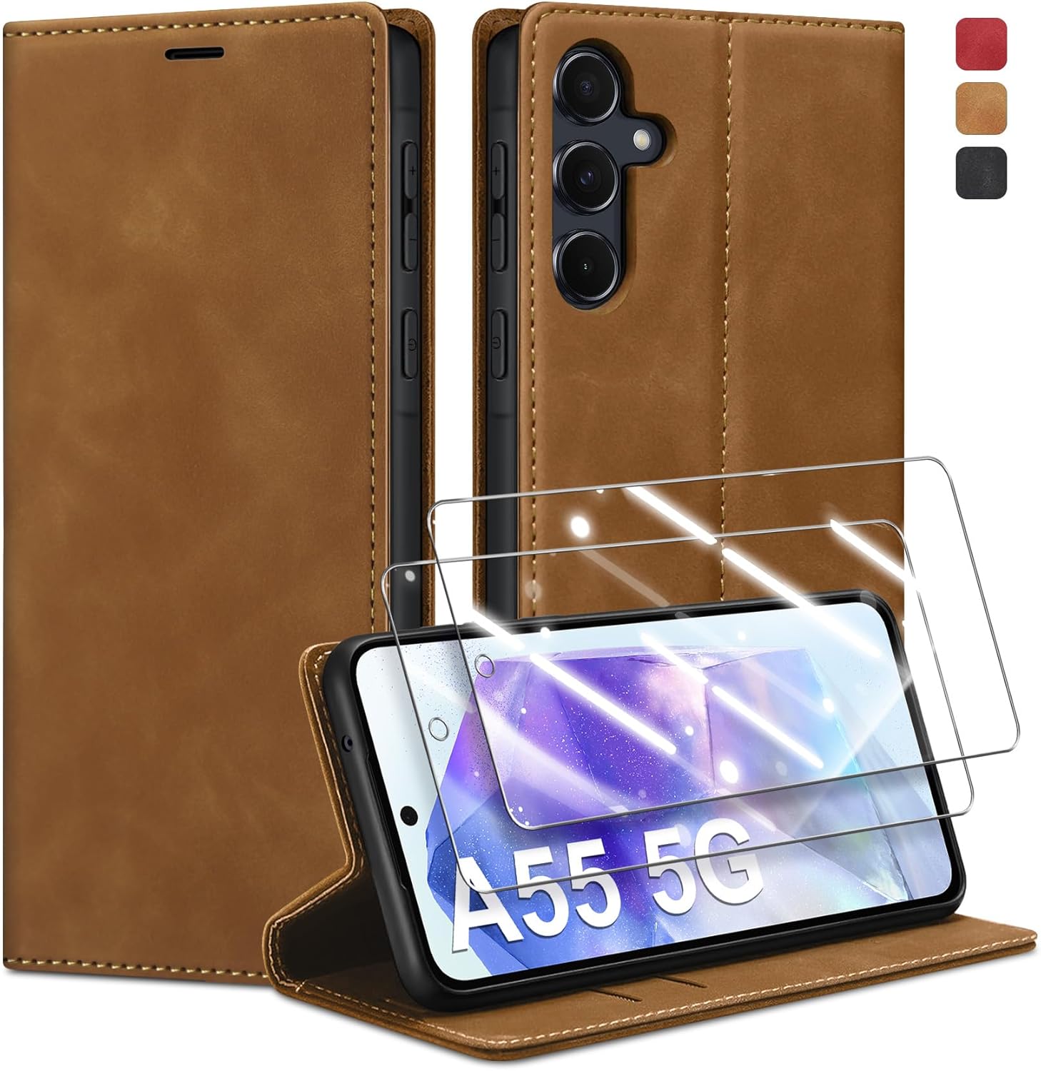 Кожен калъф за мобилен телефон за Samsung Galaxy A55 5G и 2 протектора за екран, първокласен сгъваем портфейл с магнитен слот за карти и функция стойка, защитен калъф за Samsung A55 5G, кафяв