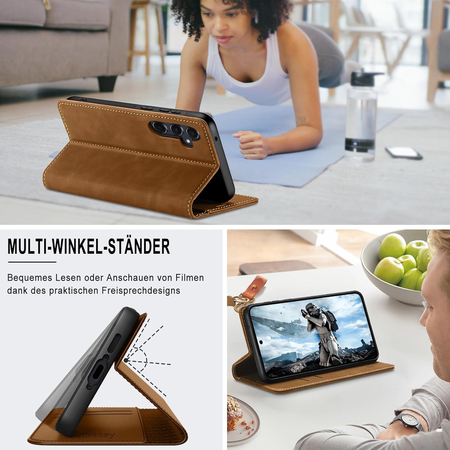 • Стил портфейл: съвместим с Samsung Galaxy S25 FE, сгъваем кожен калъф, перфектна комбинация от калъф за мобилен телефон и портфейл. Два слота за карти за кредитни карти, лична карта, визитки и страничен джоб за пари, касови бележки и сметки. Може да служи като калъф и сигурен преносим портфейл.