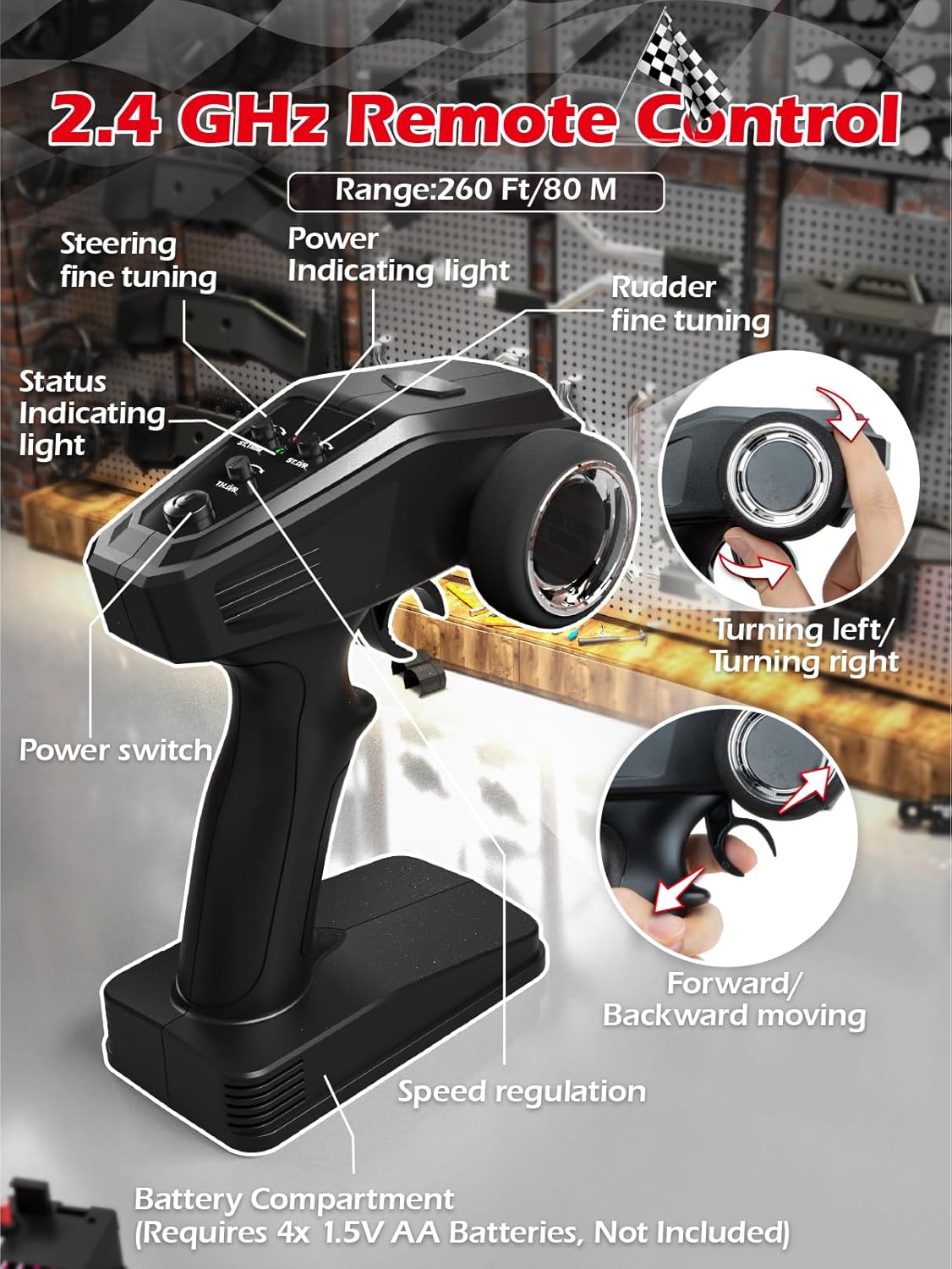 Дистанционно управляваната кола има задвижване на четирите колела и независимо окачване. С висококачествено найлоново шаси, водоустойчив и устойчив на пръски ESC, както и гуми за всякакъв терен с високо сцепление, тя може да се справи с различни терени като пясък, трева и дива природа. Това позволява на децата да управляват високоскоростната кола в различни среди, доставяйки им повече удоволствие. Забележка: RC колата не трябва да се потапя във вода или да се кара в силно кални райони.
