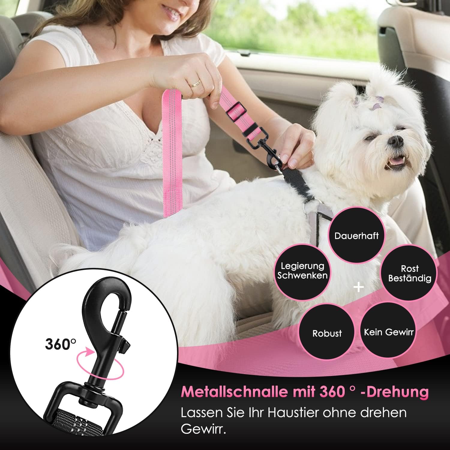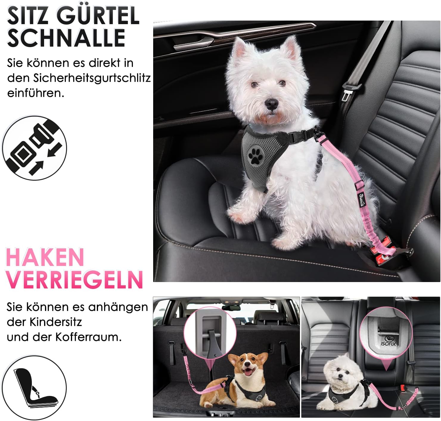 {'1. Choose the appropriate size for the dog safety belt, depending on the size of your dog. 2. Attach the dog safety belt to the LATCH system, seat belt or boot of your vehicle with the included hardware. 3. Adjust the length of the dog protection belt to ensure a comfortable fit for your dog. 4. Attach the dog protection belt to your dog's harness or collar with the enclosed clamps. 5. Make sure the dog safety belt is securely attached before driving
