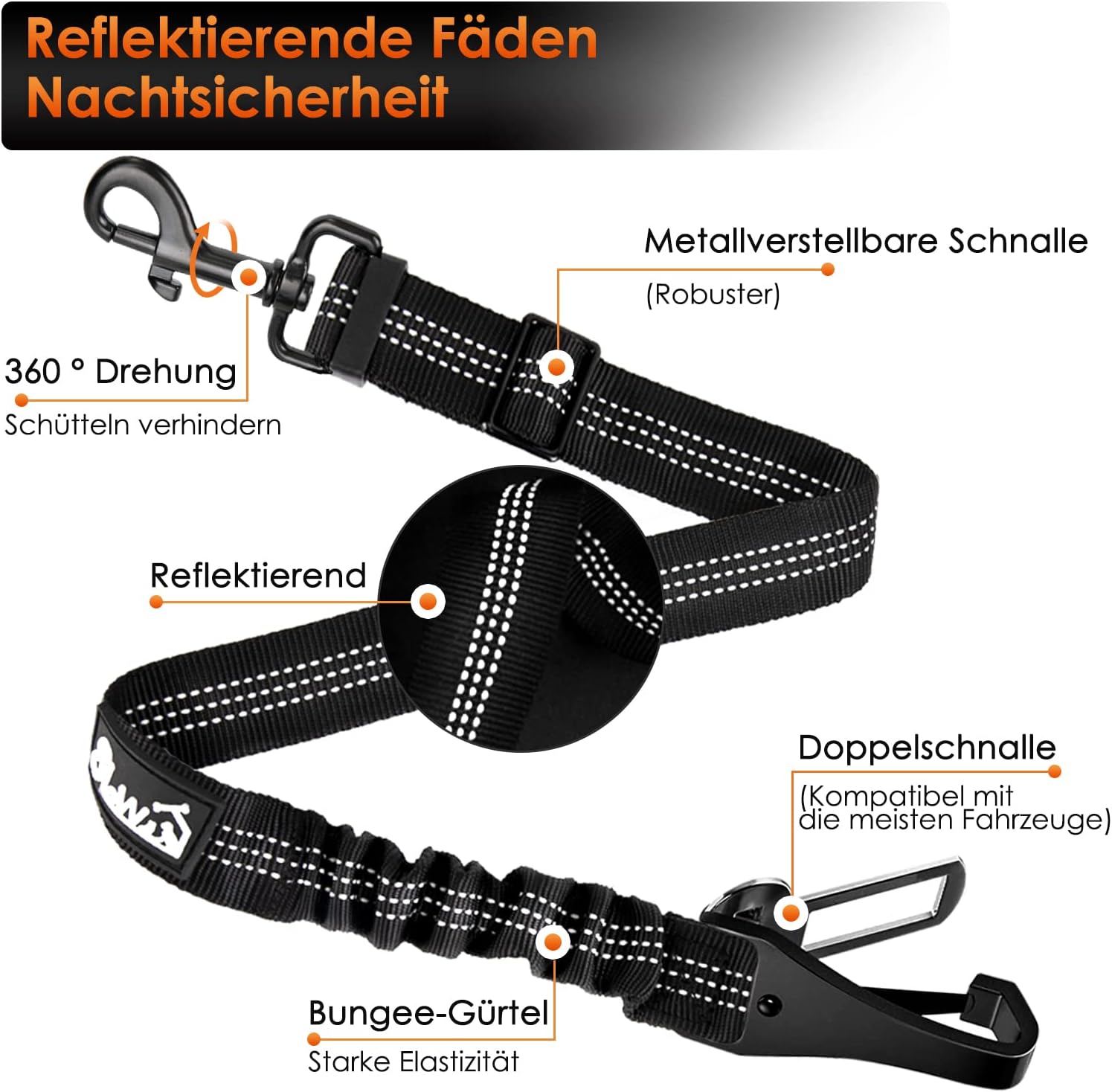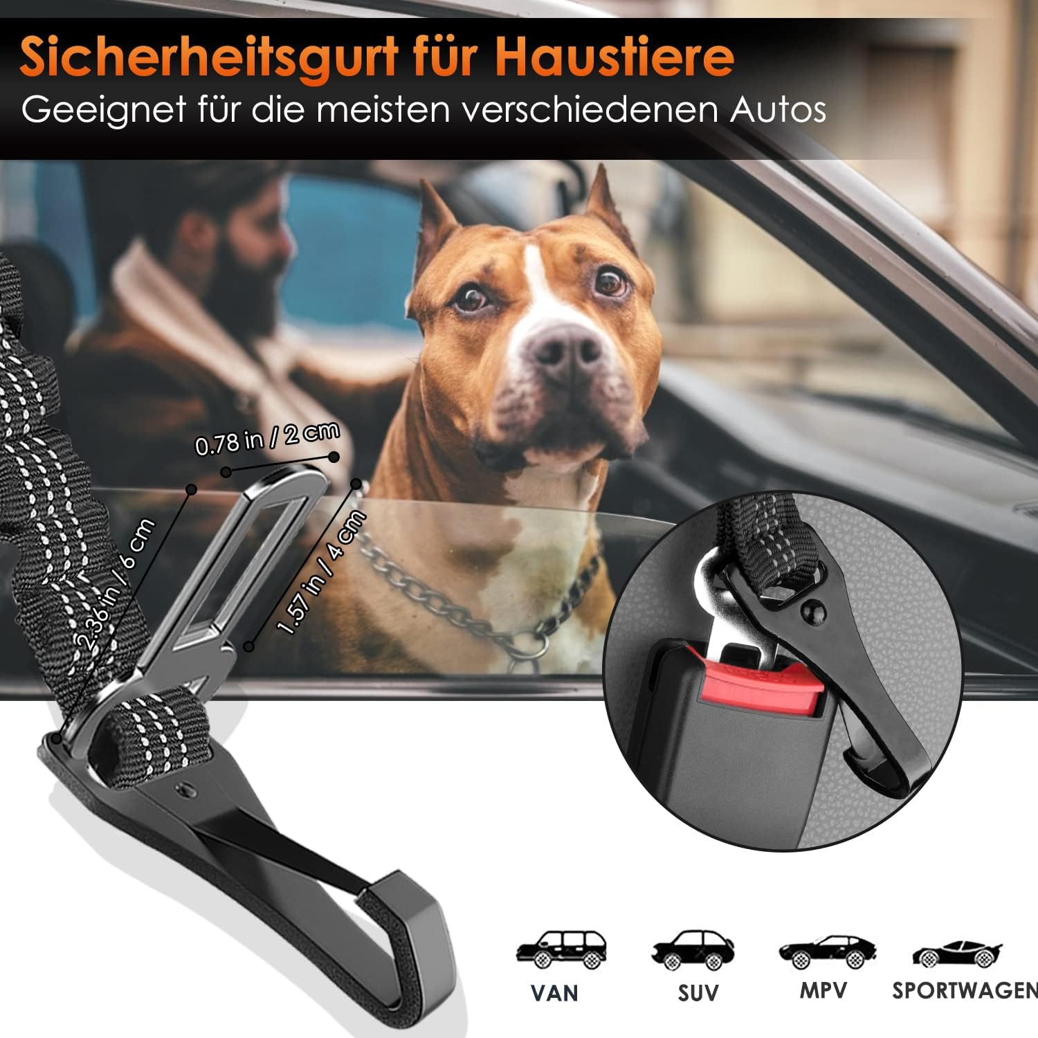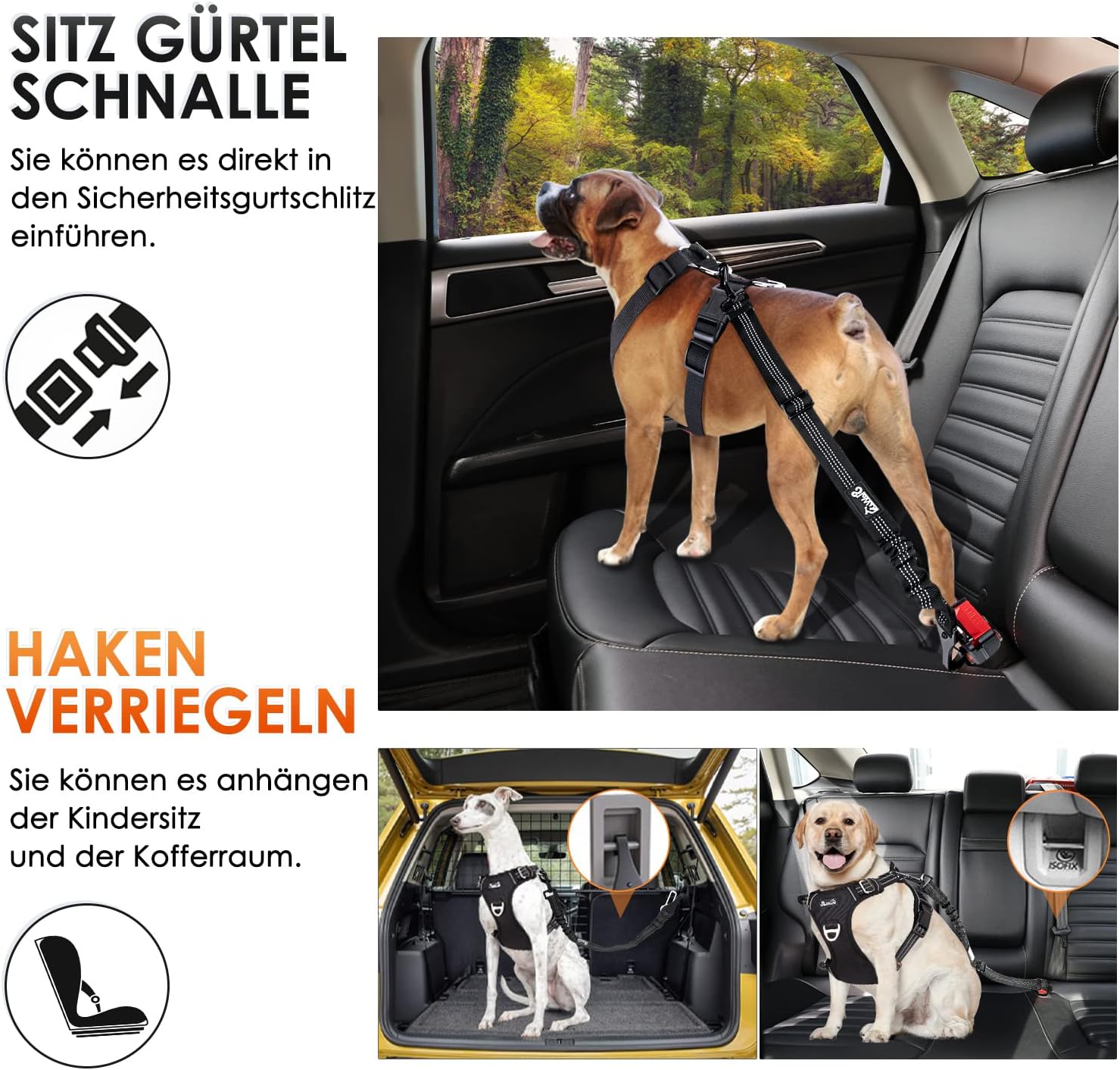 {'1. Choose the appropriate size for the dog safety belt, depending on the size of your dog. 2. Attach the dog safety belt to the LATCH system, seat belt or boot of your vehicle with the included hardware. 3. Adjust the length of the dog protection belt to ensure a comfortable fit for your dog. 4. Attach the dog protection belt to your dog's harness or collar with the enclosed clamps. 5. Make sure the dog safety belt is securely attached before driving