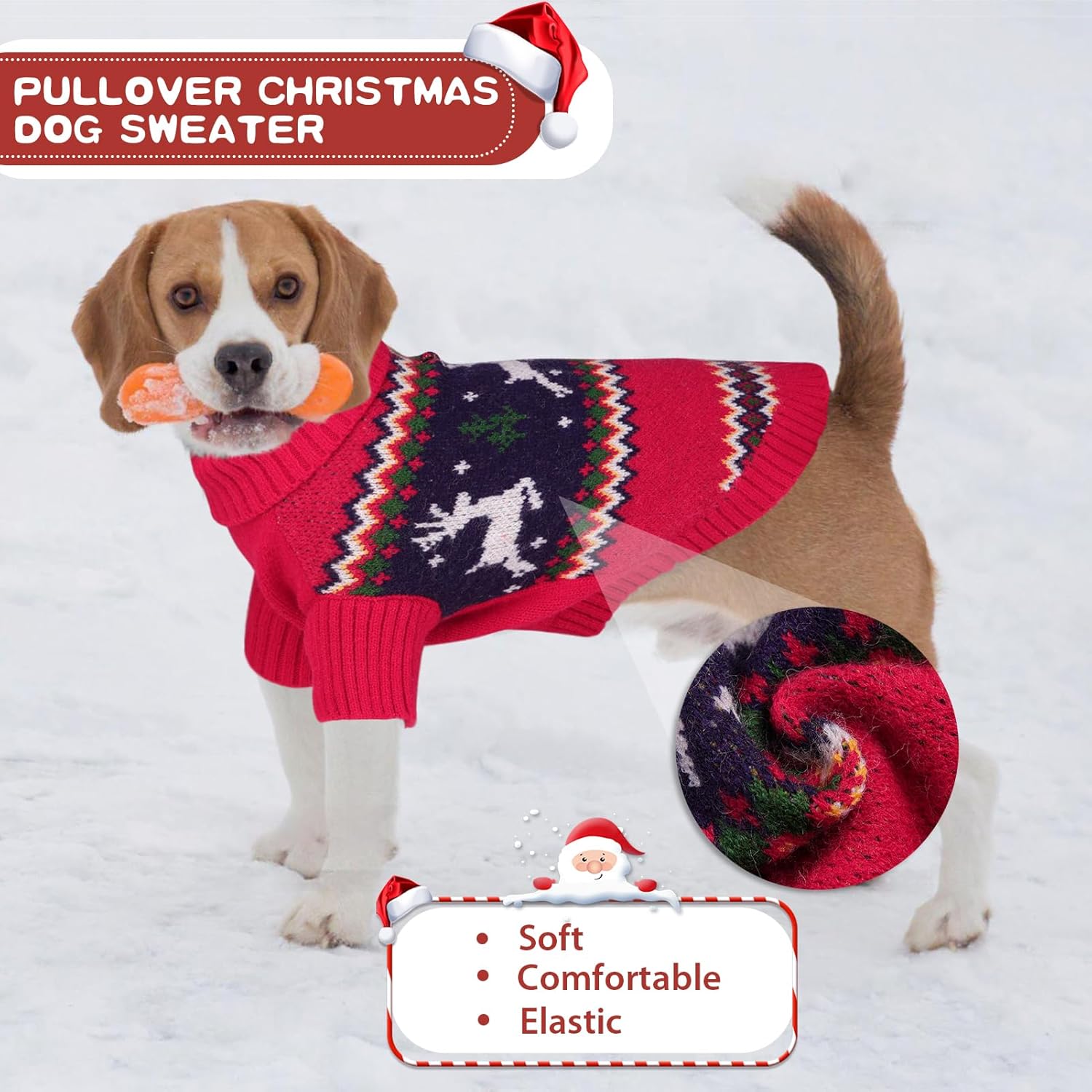 • Класически коледен пуловер: Коледният пуловер за кучета е с традиционен, класически коледен модел. Това е стилен и функционален коледен тоалет за домашни любимци. Високата яка осигурява допълнителна защита и топлина; перфектно зимно облекло за малки и средни кучета.