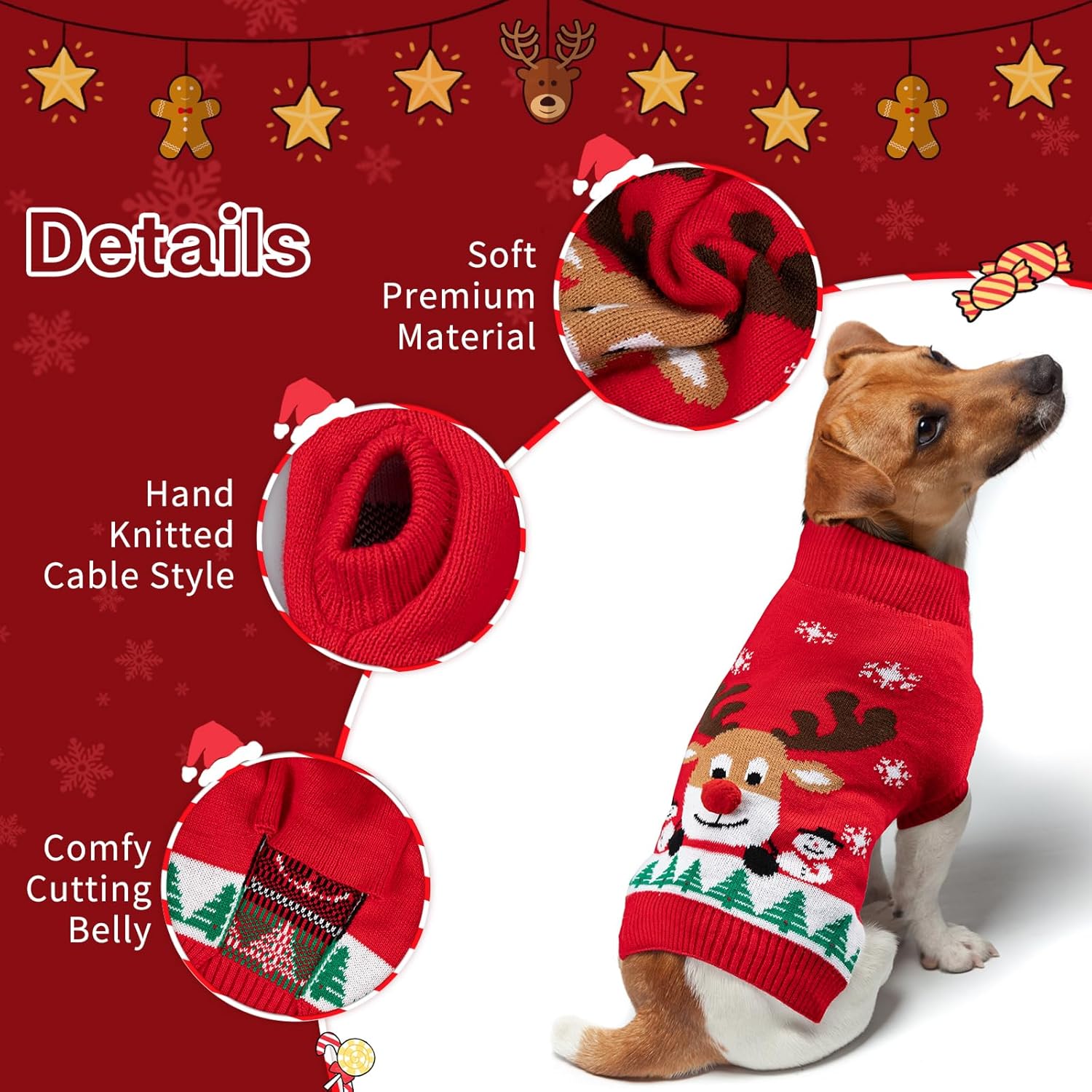 • Лесна грижа за пуловера на вашето куче: Предлага се в пет размера за малки, средни и големи породи. Може да се пере в пералня със студена вода или на ръка с подобни цветове за безпроблемна грижа за коледния костюм на вашето куче.