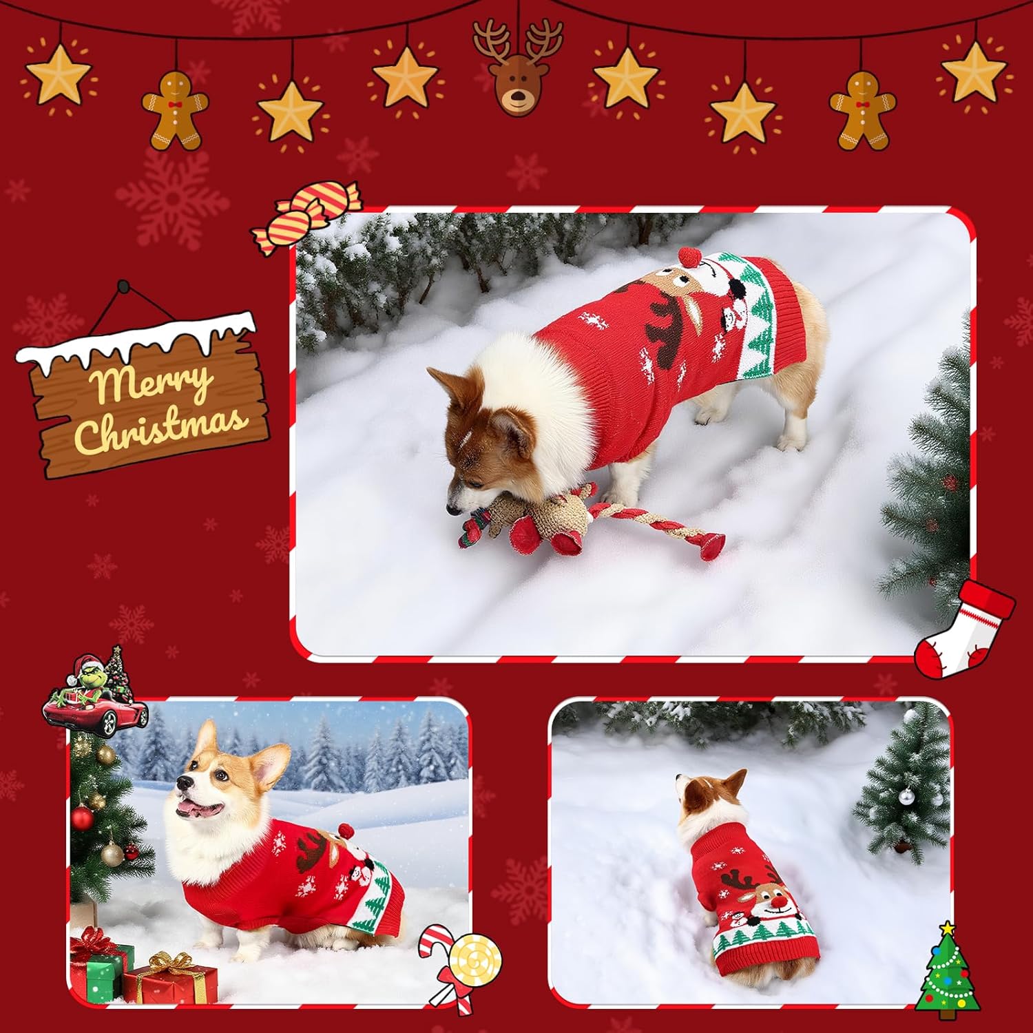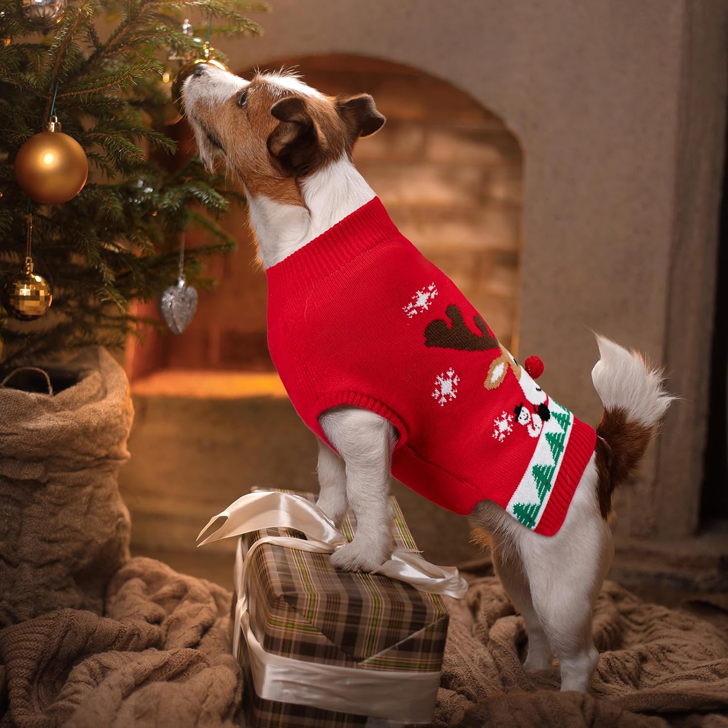 • Празничен коледен пуловер с изображение на куче: Този плетен коледен пуловер с изображение на куче има червен основен тон и е украсен с празнични мотиви като елени, снежинки, снежни човеци и коледни елхи. Перфектен, топъл подарък за коледни кучета тази зима.