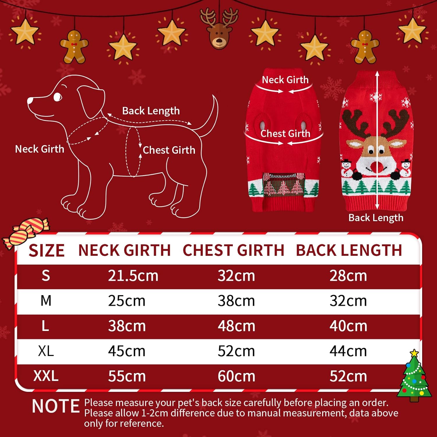 • Перфектен избор за коледен пуловер за кучета: Тази година предлагаме няколко дизайна коледни пуловери с кучета в различни размери. Не поръчвайте само според данните за размера, а винаги измервайте тялото на вашия домашен любимец и внимателно се консултирайте със съответната таблица с размери. Гръден кош: Най-важната мерна единица; измерете най-широката част на гръдния кош на коледния пуловер на вашето куче. За по-голям комфорт добавете 5 см.