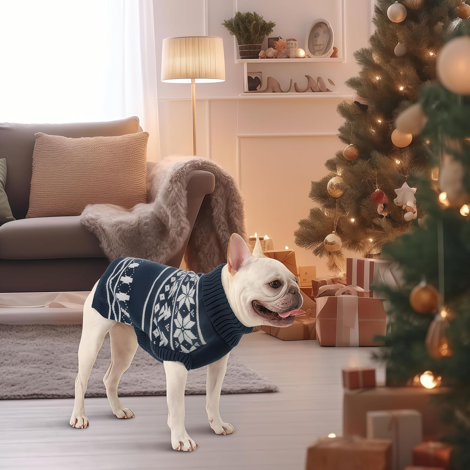 • Зимен стил: нашият зимен пуловер за кучета Коледа е украсен със зимни мотиви като снежинки, коледни елхи и елени, за да облече кучето ви перфектно за празничния сезон.