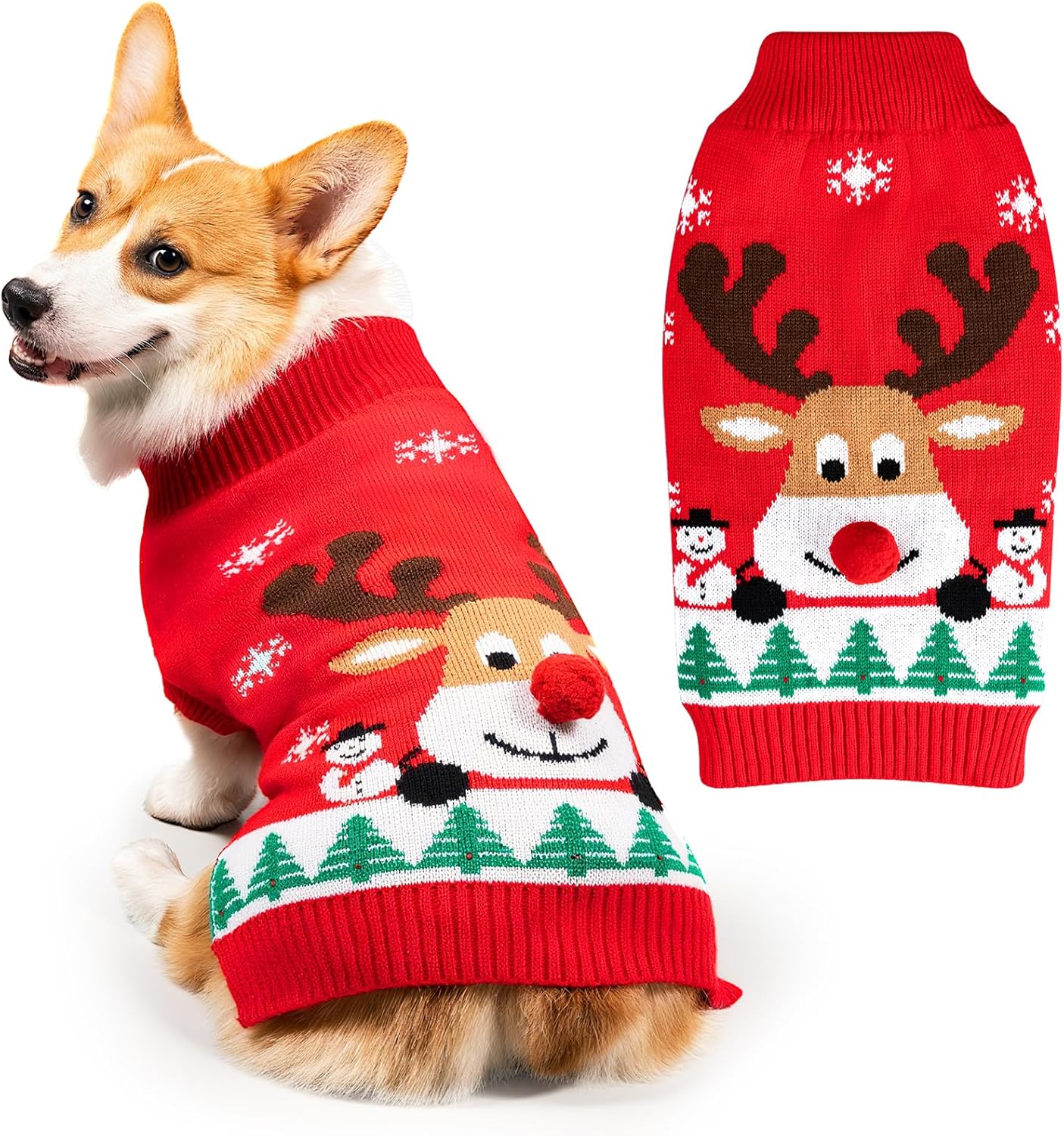 • Празничен коледен пуловер с изображение на куче: Този плетен коледен пуловер с изображение на куче има червен основен тон и е украсен с празнични мотиви като елени, снежинки, снежни човеци и коледни елхи. Перфектен, топъл подарък за коледни кучета тази зима.