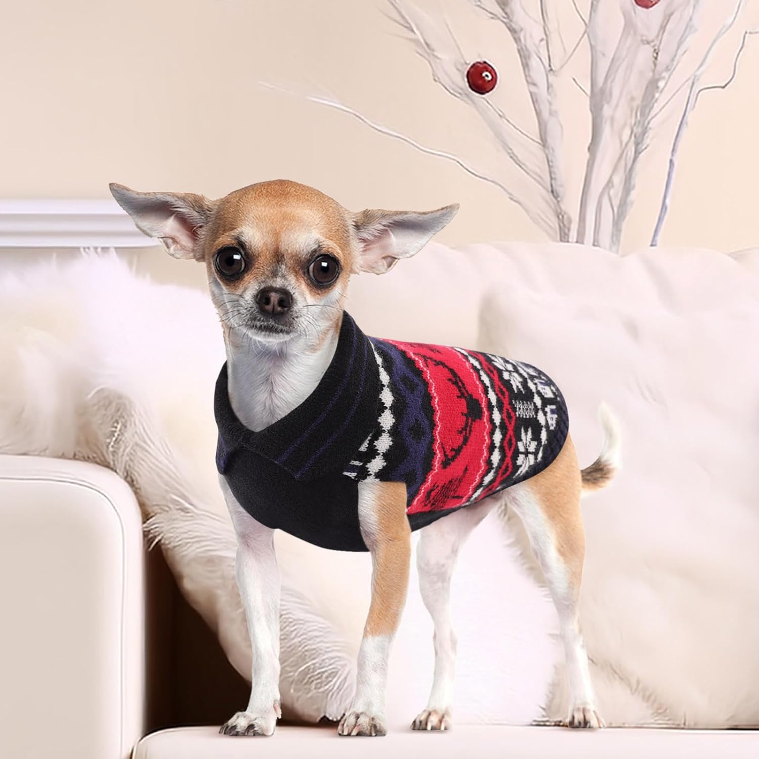 • Топлина и комфорт: изработен от висококачествени материали, пуловерът за кучета не само предлага празнична визия, но и държи кучето ви топло и уютно в студа