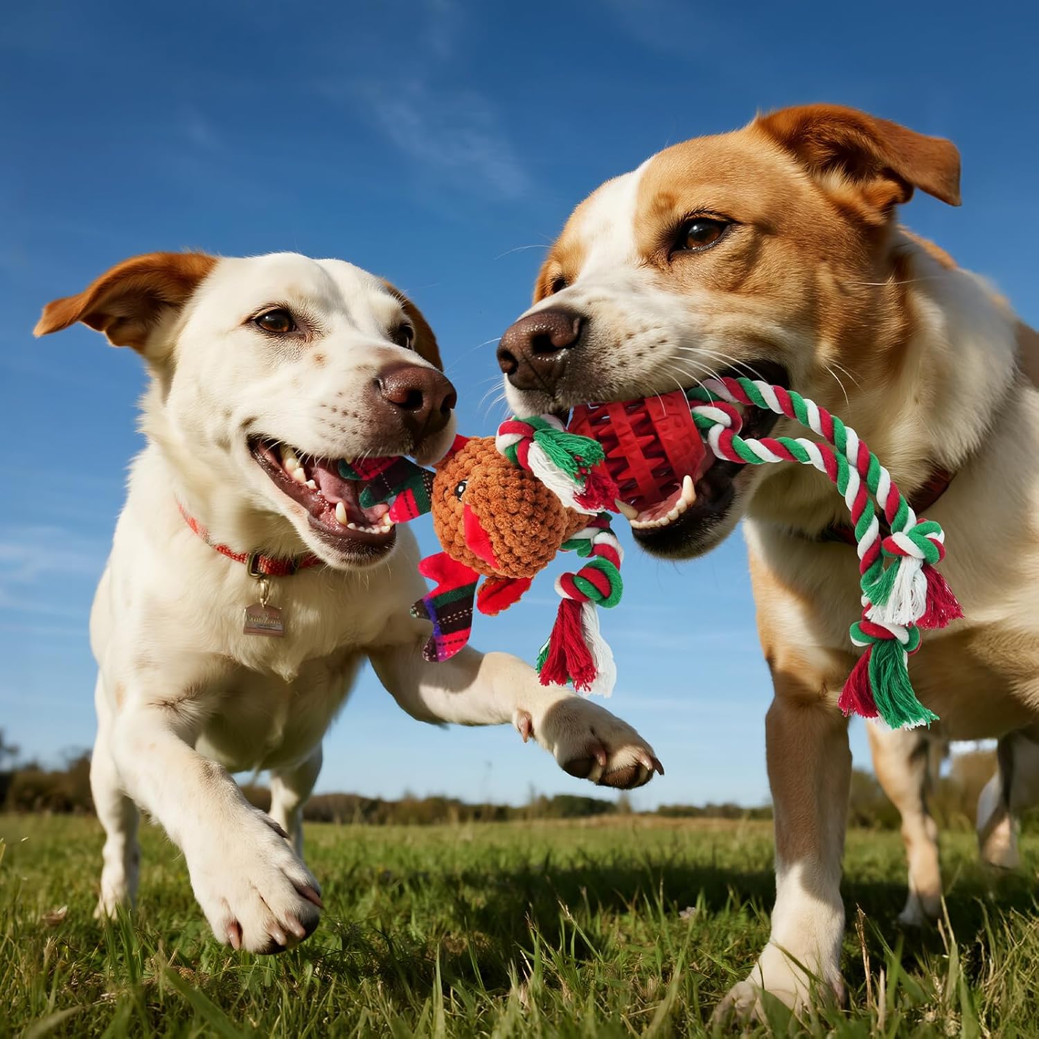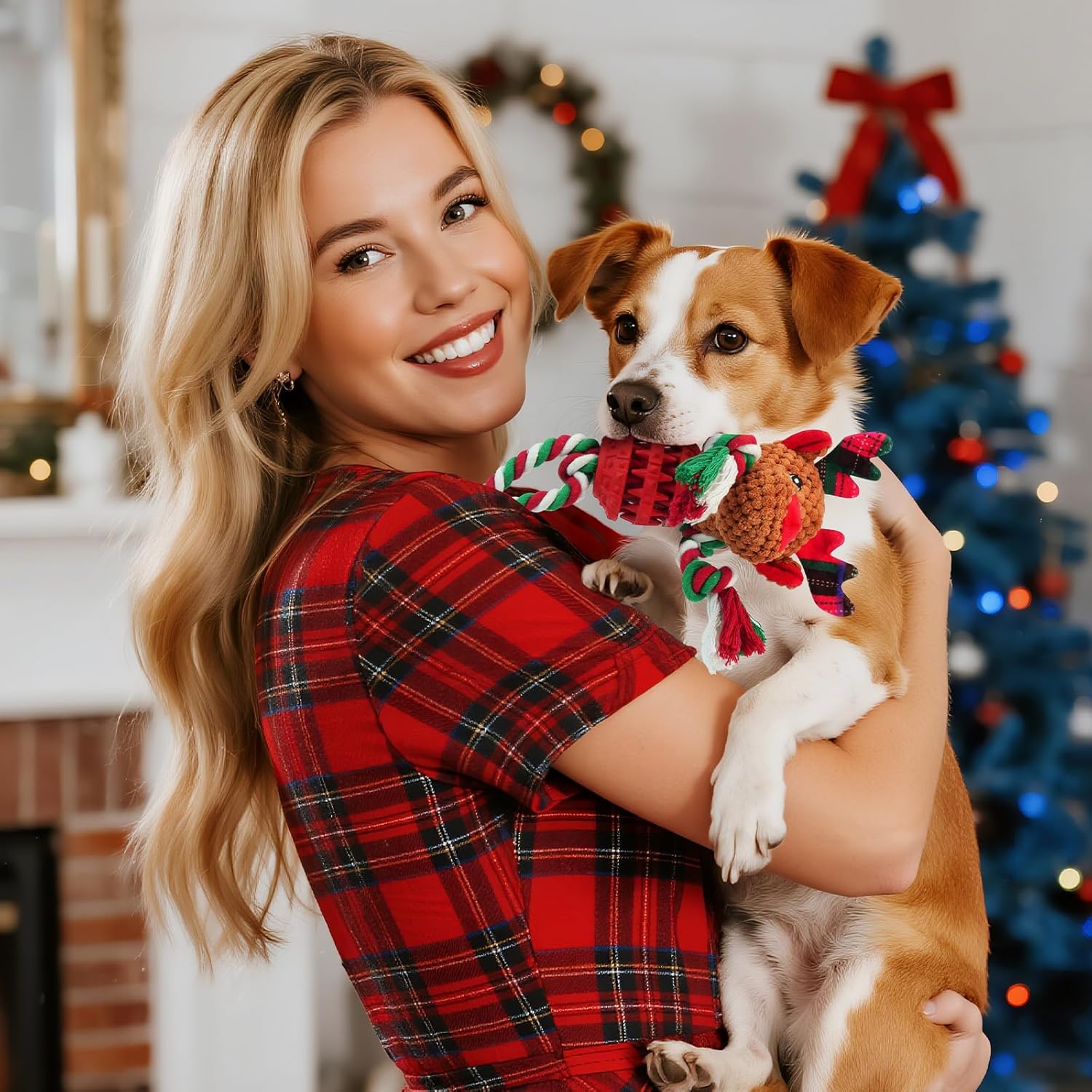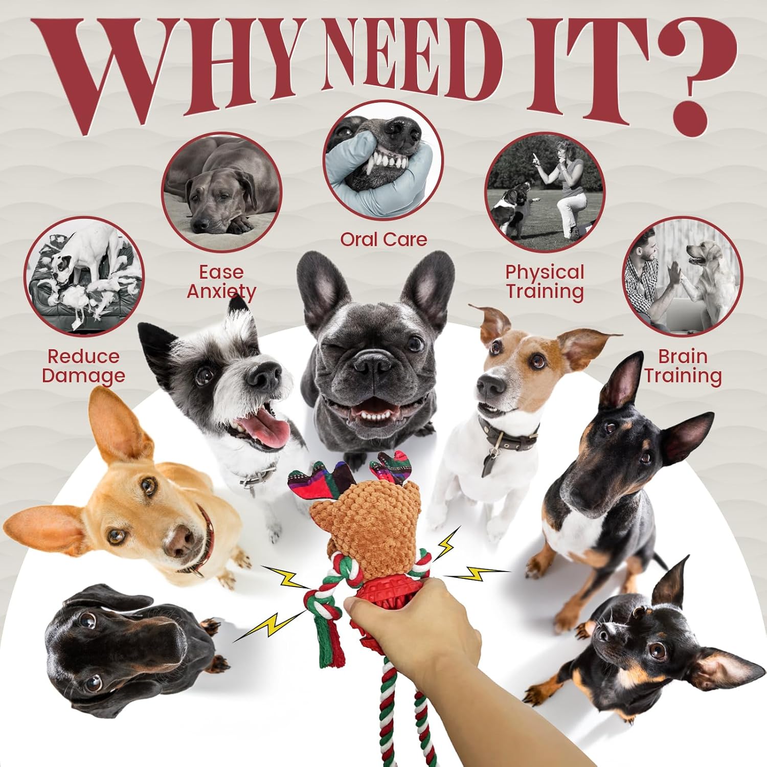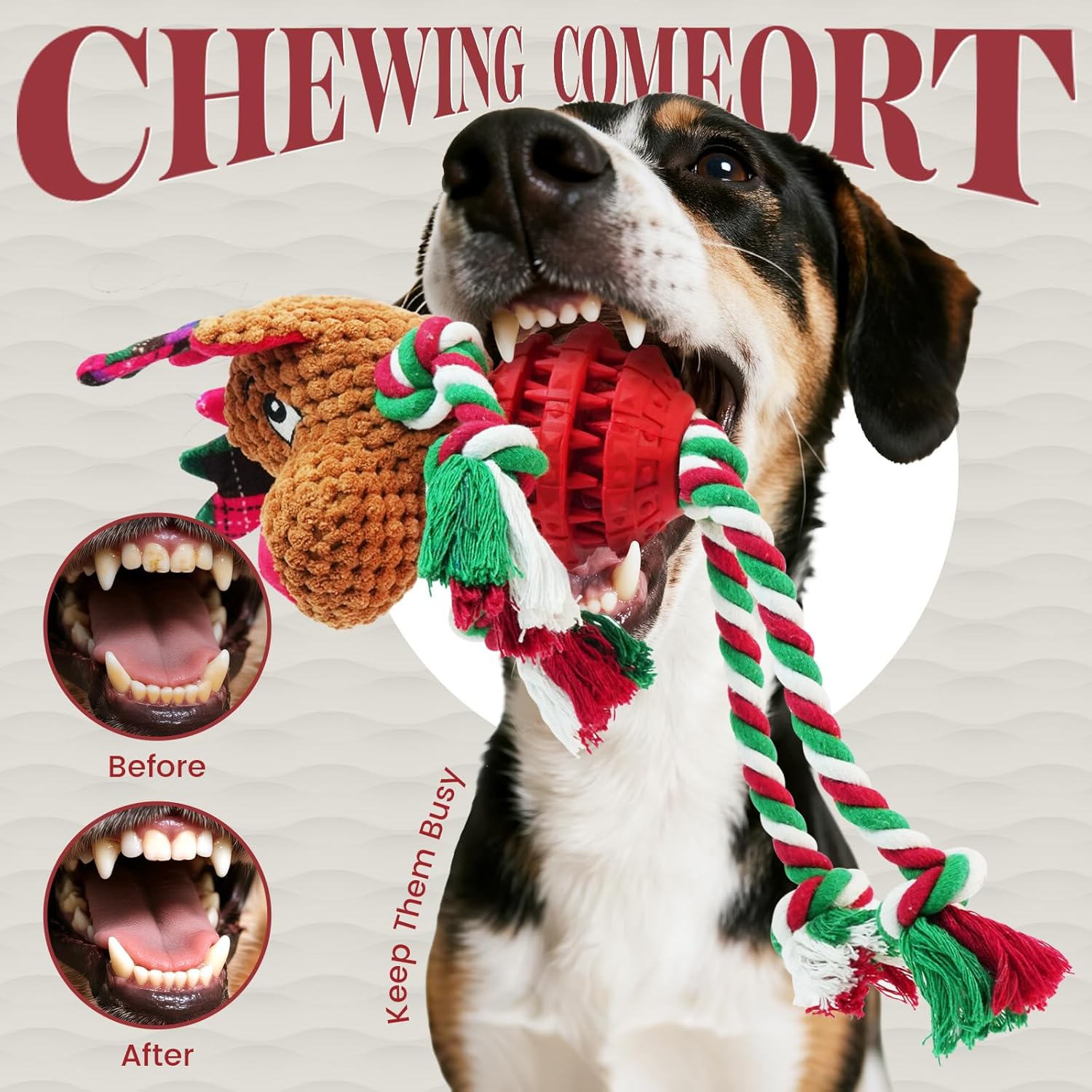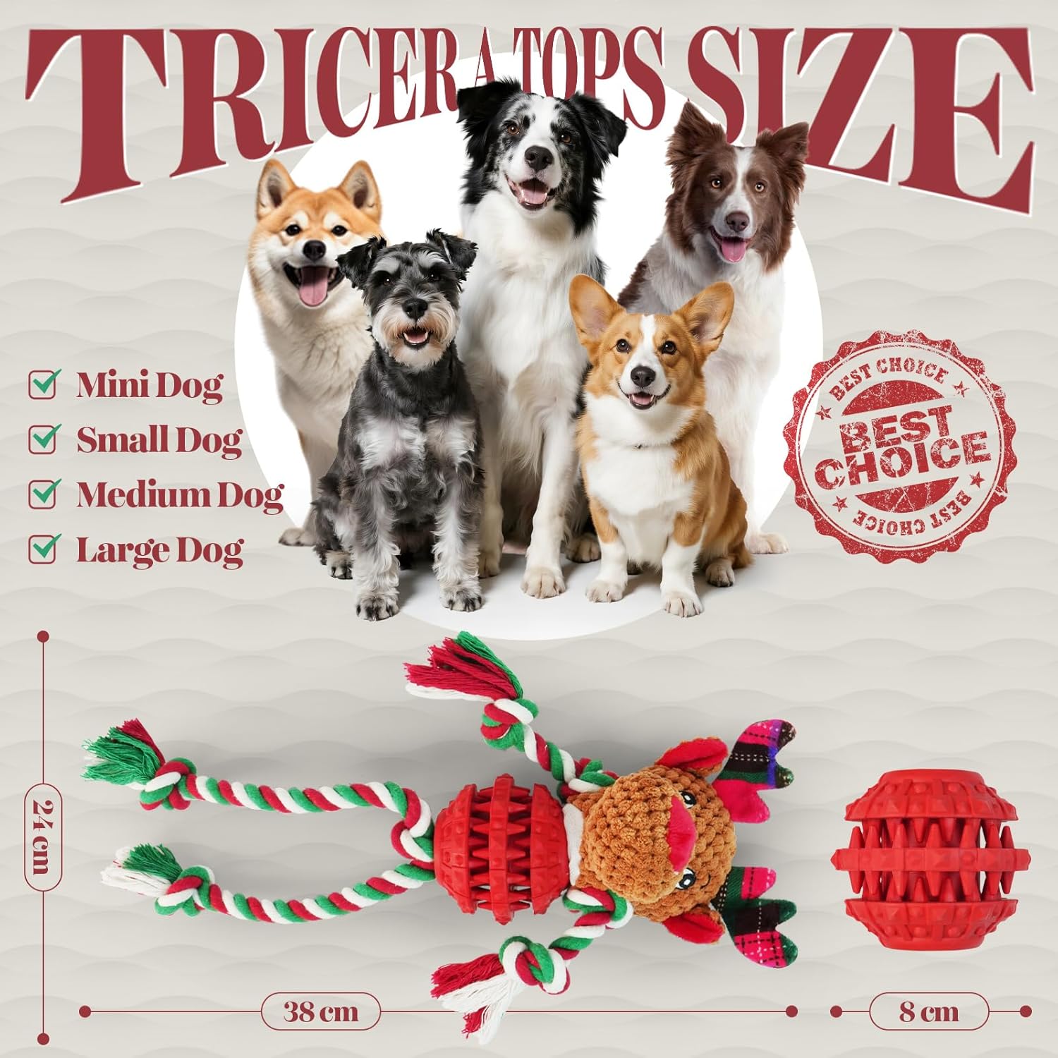 Коледна играчка за кучета с елени и въжени крака и топка за хапване - Плюшена скърцаща играчка, интерактивна играчка за дъвчене, кученца и малки, средни, големи кучета