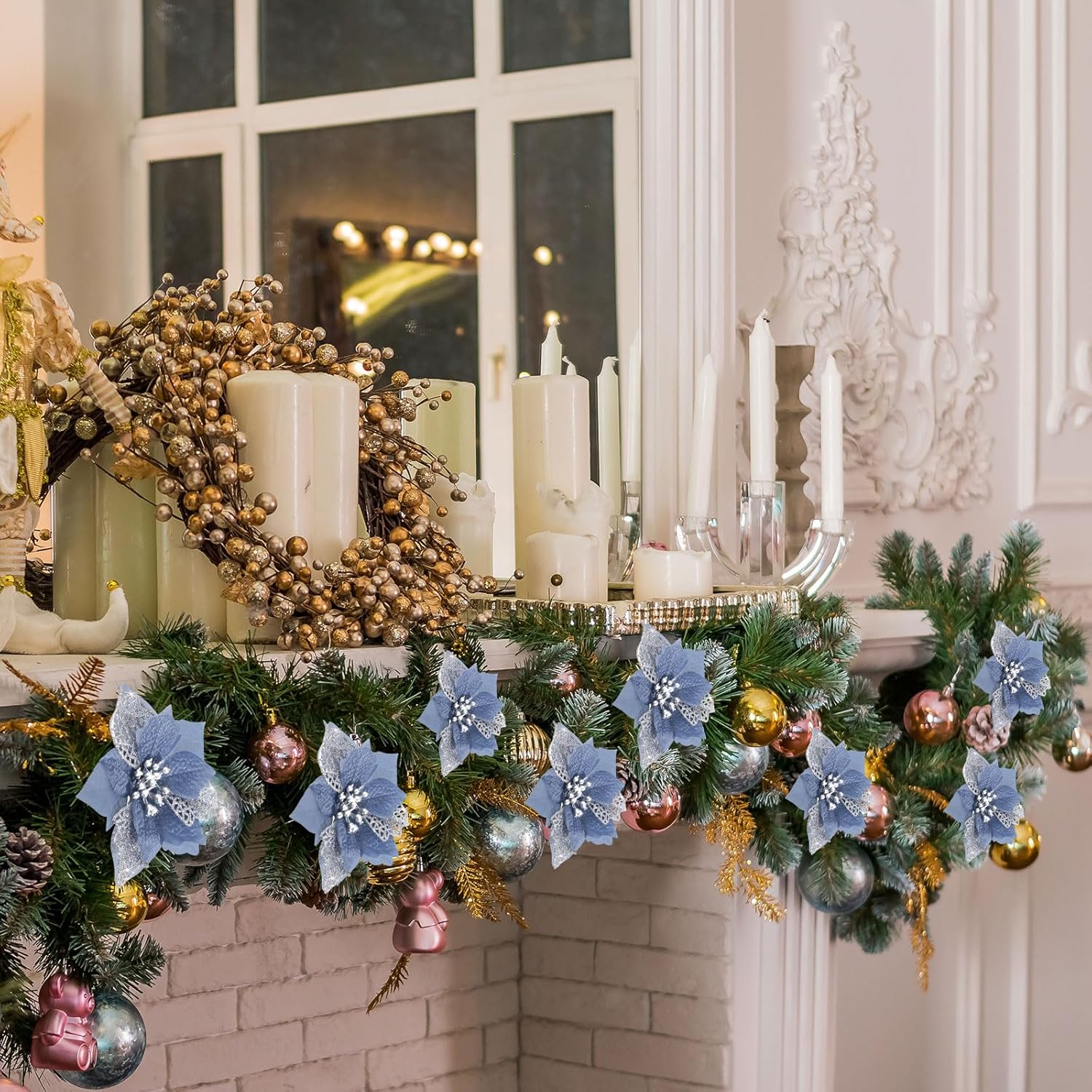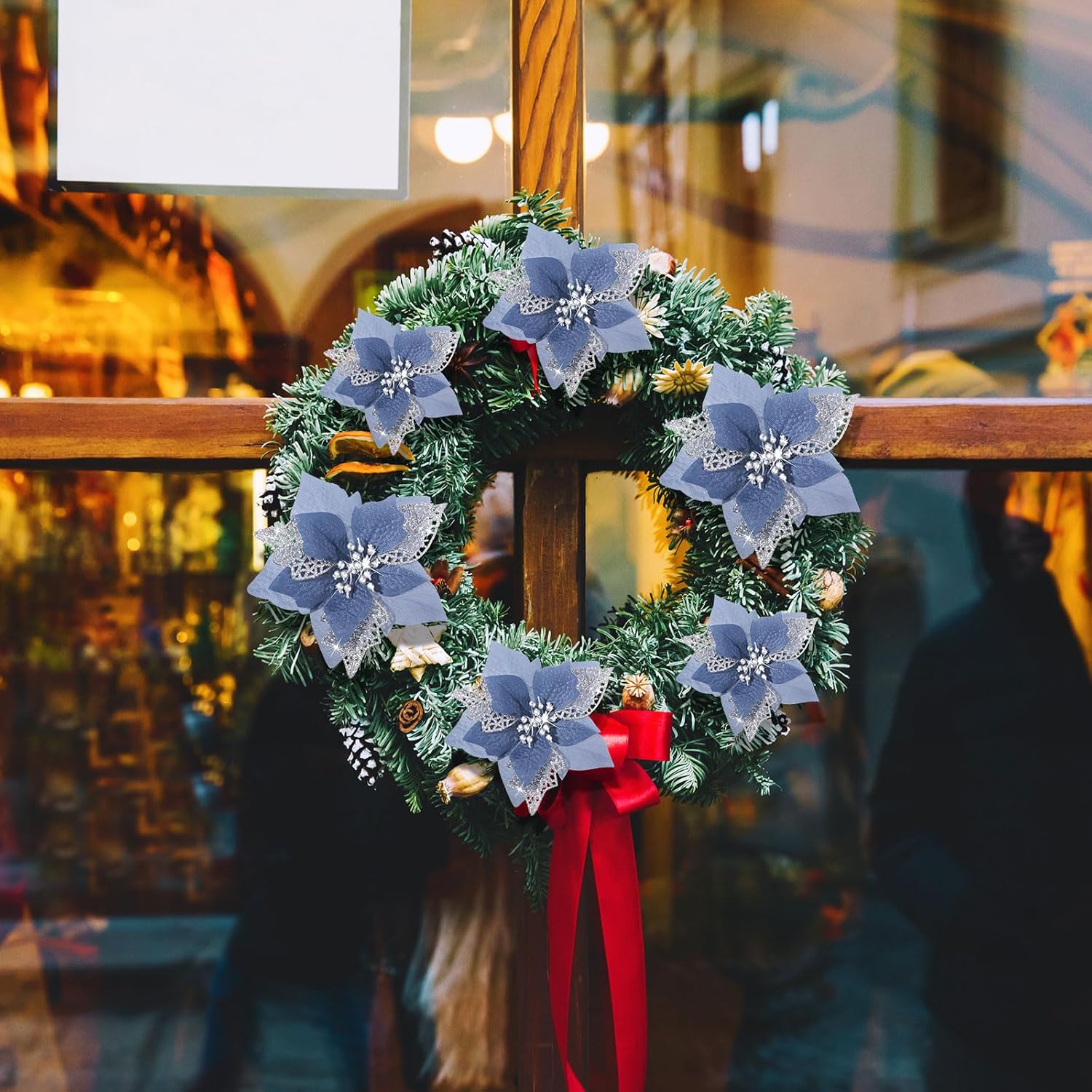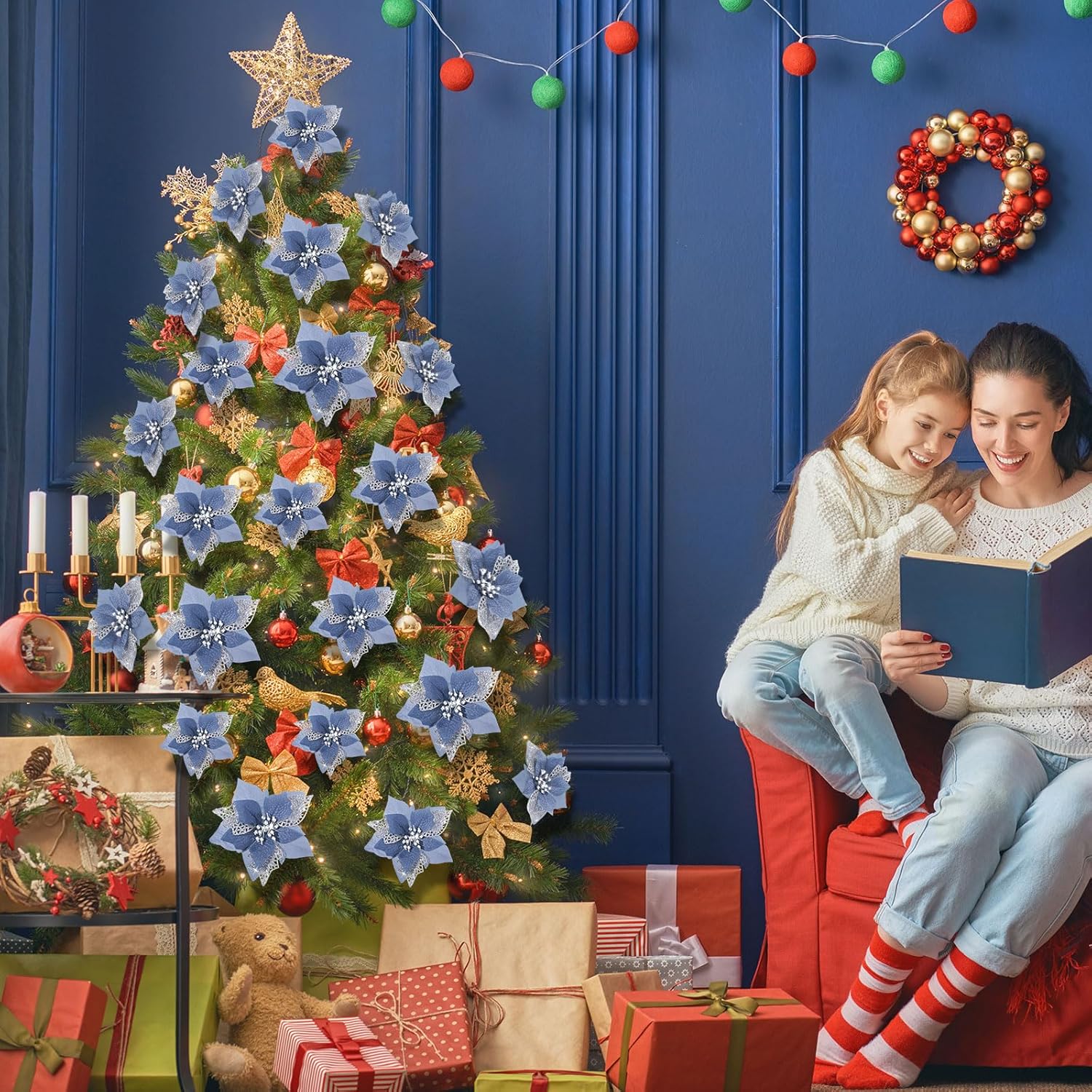 Коледни брокатени цветя Boao, изкуствени цветя коледна звезда, украса за сватба, коледна елха, Нова година, 24 бр., сини