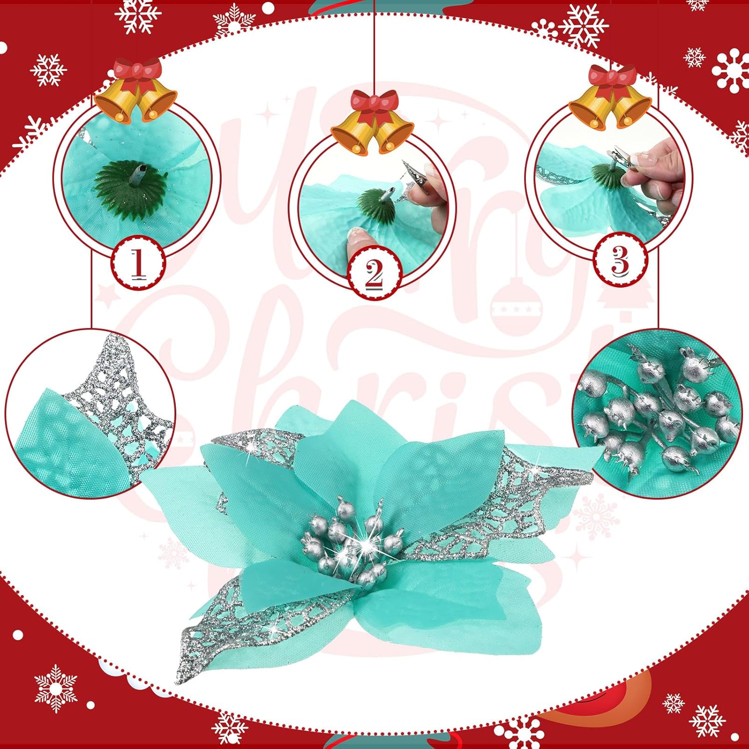 Коледни брокатени цветя Boao, Коледна звезда, Изкуствени коледни цветя, Украси за сватба, Коледна елха, Нова година, Синьо-зелено, Пакет от 24